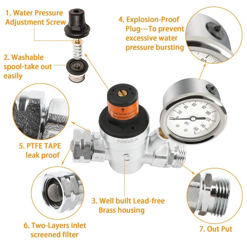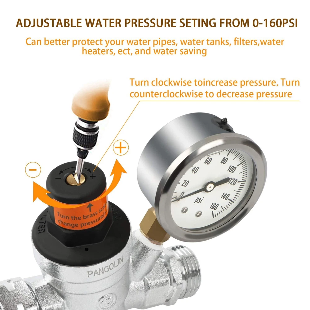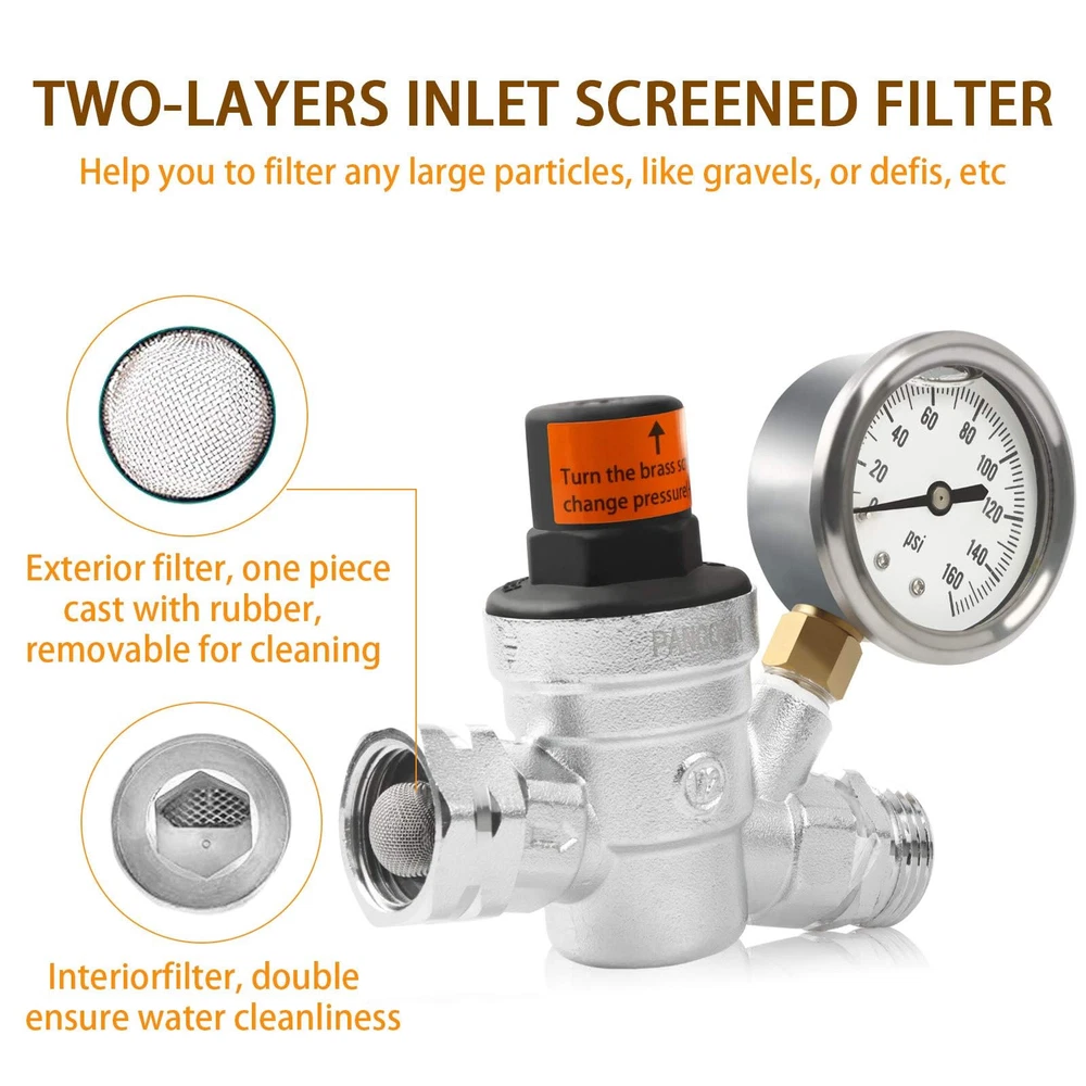 ✅【NEW UPGRADE REGULATOR】The pressure gauge of RV water pressure regulator is filled with high class silicone oil. The clarity, stability and seismic performance are higher than other gauge and it is not easy to fade. The gauge is filled with oil to prevent water intrusion, and the sealing is stronger, the service life is prolonged. ✅【ADJUSTABLE WATER PRESSURE REGULATOR】RV Water Pressure Regulator is easy to adjust water pressure from 0-160PSI, different campsites have different water pressures and are suitable for different harsh environments. Adjust screw on the top of regulator to select your desire pressure setting. Turn clockwise to increase pressure, turn counterclockwise to decrease pressure. This regulator is preset at 45 PSI. ✅【LEAD FREE BRASS】RV Water Pressure Regulator is tested strictly to meet NSF lead-free requirements of less than 0.25%, silver body, is different from other regulators, class C46500 LEAD-FREE BRASS treated by hot casting and plating double process technology, make the lead content of the RV regulator reach the minimum standard set by the market industry. ✅【DUAL-LAYER INLET SCREENED FILTLER】RV Water Pressure Regulator is designed with 3/4 NH thread, with All US water sources. The Dual-Layer inlet screened filter helps to filter particles like gravel, debris to prevent impurity blocking and valve body damage ,improve taste and quality of water, bring you continuous water flow which is about 2-4 gallons per minute, and will not reduced the water flow rate even in harsh environments. 🏆【WHAT YOU WILL GET】1 x RV Water Pressure Regulator, 1 x Installation Manual, 365-day fully money back or change new. Tips: Pay attention to protect the sealing of the product when removing it!