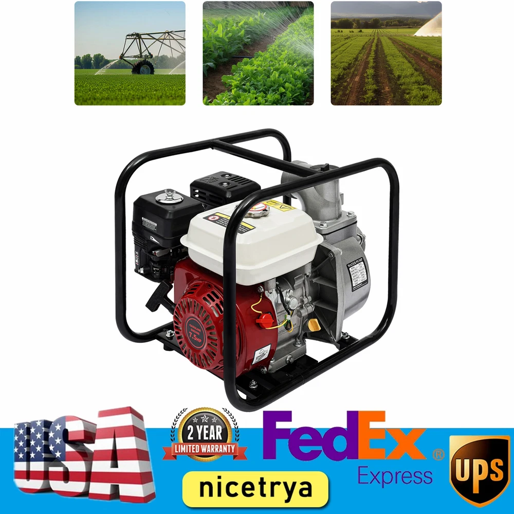 Water Pump 7.5 HP 3" Portable Gas-Powered Water Pump Air-cooled 4Stroke Gasoline Description Whether You Are Seeking to Supply Water to the Farmland, Irrigate Lush Vegetation, or Extinguish Fires, This High-performance Water Transfer Pump Will Surely Come to Your Aid and Exceed Your Expectations. the 7.5hp 4-Stroke Engine with 210cc Displacement Provides Sufficient Power to Ensure Efficient Water Pumping and Improve Work Efficiency. Key Features Build to Last: This Product Mainly Consists of an Aluminum Alloy Pump Body and an Iron Frame and Adopts Polishing, Spray Molding, and Galvanizing Processes to Provide High Hardness, High Wear Resistance, Corrosion Resistance , Rust Prevention Performance, and Long Service Life. High Safety : the Aluminum Alloy Pump Body and the Multiple Heat Dissipation Holes Can Timely Dissipate the Heat and Avoid Burnout or Breakdown to Effectively Guarantee the Use Safety. the Built-in Oil Protector Prevents Cylinder Pulling and Bursting Caused by Not Adding Oil or Insufficient Oil, Making It Reliable and Safe to Use. Efficient Water Pumping : the 7.5hp High-power Engine with 210cc Displacement Gives It a Rotation Speed of 3600rpm and Provides a Flow Rate of up to 2118.88ft³/H to Quickly Pump Water out of Rivers or Ponds, and Provides a Suction Height of 22.97ft and a Total Lift Height of 91.86ft, Providing Reliable and High-performance Irrigation, Improving Your Efficiency, and Saving You Time. High Stability: the Quadrilateral Base Frame and Enlarged Anti-slip Feet Provide Greater Stability and Effective Vibration Reduction to Ensure Better Performance in Harsh Environments. Low Fuel Consumption: Compared to Two-stroke Machines, Four-stroke Machines Consume less Fuel and Are More Energy-efficient. Large Capacity: the 0.95gal Oil Pot of This Product Meets Your Continuous Working Needs, Reduces Refueling Frequency, and Saves Time. Easy to Install and Use: the Product Has Been 85% Assembled, Together with the Complete Accessories and English Manual, so You Can Install It Easily. It Adopts a Manual Recoil Start, and the Throttle and Flameout Switches Make It Convenient for You to Operate. User-friendly Maintenance Method : You Only Need to Clean the Filter Element Every 50 Hours (Every 10 Hours in Dusty Environments), Clean It in a High-flash Solvent, Dry It, and Then Dip It in Clean Engine Oil(Excluded) to Squeeze out Excess Oil(Excluded). Protective Packaging: Shockproof Sponge Packaging Can Reduce Vibrations During Transportation to a Certain Extent and Protect the Integrity of the Product to a Certain Extent. Details Outer Frame: the Sturdy Outer Frame with Smooth and Round Edges Makes It Convenient for You to Move the Product. Practical Filte r: It Can Help Filter Impurities in Water, Prevent Clogging of the Machine, and Reduce Wear and Cleaning Trouble. Large Water Inlet and Outlet : the Pump Adopts a 3-Inch Large Diameter Water Inlet and Outlet, Allowing Large Flow. Hose Clamps: They Can Help You Firmly Fix the Water Pipe(Not Included) and Prevent It from Loosening and Leaking Due to Strong Water Impact. Application It Is Ideal for Long-distance Water Transmission in Farmland , Garden Irrigation, Greenhouse Planting, Ground Cleaning, Fishpond Aquaculture, Fast Drainage, Water Collection, Swimming Pool Water Exchange, Water Extraction from Deep Wells, Firefighting , and so on. How to Start 1. Add Four-stroke Special Engine Oil. 2. Add Pure Gasoline to the Four-stroke Engine. 3. Fill the Water Injection Port with Water. 4. Turn the Air Door up and Close. 5. Press the Oil Bubble to Fill It with Oil. 6. Pull the Starter and Hear the Roar. 7. Push down the Air Door to Open It. 8. Pull the Starter Again to Start It. Specification Material: Aluminum Alloy and Iron Color: Black, Silver, White, Red Processes: Polishing, Spray Molding, and Galvanizing Assembly Required: Yes Number of Items: 1 Model: Wp30 Engine Type: 170f Start Method: Recoil Start Output Mode: Direct Connection Engine Type: Single Cylinder, Air-cooled, Four Stroke Power Source: Gasoline Connection Diameter: 80mm/3in Capacity: 60m³/2118.88ft³/H Total Head: 30mm/1.18in Displacement: 210cc Power: 7.5 Hp, 5.5kw Speed: 3600rpm Oil Pot Capacity: 3.6l/0.95gal Max. Water Pumping Capacity: 1000l/264gal/Min Suction Force: 0.08mpa Lifting Height: 28m/91.86ft Maximum Suction Lift: 7m/22.96ft Product Size: 47*37*39cm/18.5*14.57*15.3in Package Size: 51*39*43cm/20.08*15.35*16.93in Gross Weight: 22kg/48.5lb Net Weight: 21kg/46.3lb Package Included 1*Water Transfer Pump 1*English Manual All Accessories Required for Installation Notes This Product Does Not Include Water Hoses. Please Fill the Priming Water Fully Before Running, Don't Run Dry. When Using It for the First Time, It Is Necessary to Change the Oil Every 5-10 Hours, Otherwise, Impurities in the Oil Will Block the Crankshaft. Please Check for Fuel Spillage or Leakage Before Starting. Please Add Gasoline Only When It Is Cooled. Please Use the Correct Model of Engine Oil, Genuine Factory Products, and Clean Engine Oil. Gasoline Should Also Be Free of Impurities. Gasoline Engines Are Prohibited from Stopping at High Speeds and Should Be Stopped When the Throttle Is Lowered to the Lowest Possible Level. The Air Filter Element Should Be Regularly Inspected and Replaced, and the Dirty Element Should Be Cleaned with Soapy Water and Dried in the Shade Before Use. the Cremation Plug Generally Does Not Need to Be Replaced. If Carbon Accumulates, Remove It and Scrape It off with a Knife. If the Machine Is Ready to Be out of Use for a Long Time, Please Do Not Directly Turn off the Gasoline Engine Switch, Please Turn off the Throttle Switch and Consume All the Gasoline in the Carburetor; If Not Consumed Completely, Maintaining Oil in the Carburetor for a Long Time Can Lead to Oxidation of the Carburetor. Even If Using a Fan or Opening Doors and Windows for Ventilation, Please Do Not Operate This Product in Your Home, Garage, Basement, Crawling Space, Shed, or Other