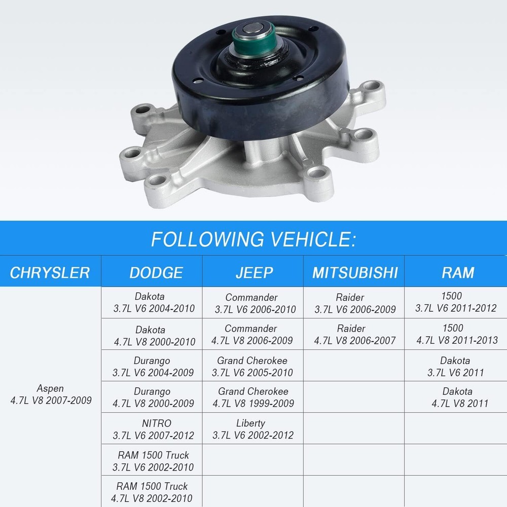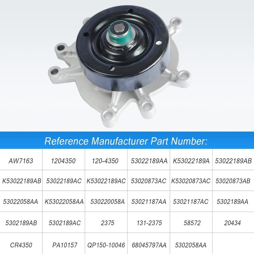 SAFE & SECURE SHOPPING 100% SATISFACTION GUARANTEED FAST SHIPPING Store Categories Store Categories Engine Motor Mount Other Water Pump Ignition coil Power Steering Pump Turbo Starter AC Condenser Headlights Brake Caliper Intercooler Charger Wiring Harness Wire Radiator Alternator Splash Guards Mud Flaps oxygen sensor Throttle Body Timing Chain Drive Shaft Motor Mount Camshaft Kit Control Arms Power Steering Gear Box Window Regulator Power Steering Rack A/C Compressor Side Mirror AC Compressor Clutches Wheel Bearing Air Suspension Strut Sun Visors Fuel Pump Assembly Leveling Lift Kit Carburetor Engine Oil Pan Coilovers You may also like 4PCS Engine Motor & Trans Mount Auto Set For 2007-2017 Nissan Altima 2.5L CVT 57.99 USD 82.84 USD Free shipping 30% off 3PC Front Engine & Trans Mounts Set for 07-14 Chevrolet GMC Cadillac Auto Trans 68.99 USD 6.0 USD Upgraded Billet Turbo Charger for Chevrolet Cruze Sonic Buick Encore 1.4L Encore 162.8 USD 232.57 USD 9.99 USD 30% off New 4x Engine Motor Mount & Auto Trans Mounts for 2007-2017 Nissan Altima 2.5L 49.99 USD 71.41 USD 8.0 USD 30% off Engine Motor & Trans Mount 3Pcs Set For 2011-2019 Jeep Grand Cherokee 3.6L 5.7L 58.85 USD Free shipping For 2003-2007 Honda Accord 2.4L Engine Motor & Trans Mount Set 5PCS 43.99 USD 16.0 USD 4pcs Engine Motor and Trans Mount For Civic 2006 2007 2008 2009 2010 2011 1.8L 39.0 USD 55.71 USD 20.85 USD 30% off 4PCS Engine & Trans Mount For 2003-2008 Toyota Corolla Matrix Pontiac Vibe 1.8L 38.98 USD 55.69 USD 11.0 USD 30% off 4PCS Engine Motor & Transmission Mount for Honda Civic 06-11 L4 1.8L Sedan Coupe 64.89 USD Free shipping Engine Motor Mount Kit 4PCS Set For 2007 2008-2011 Toyota Camry LE Sedan 2.4L US 57.99 USD 82.84 USD Free shipping 30% off 4pcs Engine Motor Mount For 2007 2008 2009 2010 2011 Toyota Camry 2.4L Automatic 57.99 USD 82.84 USD Free shipping 30% off 4PCS Engine Motor Mount & Auto Trans 4 PCs Set For 1997-2001 Toyota Camry 2.2L 52.88 USD 7.0 USD Water Pump For Dodge Ram Jeep Liberty Grand Mitsubishi Chrysler 3.7L 4.7L AW7163 Product Description US Warehouse,Fast Delivery! Warranty: limited 5 years warranty - free one time replacement. - Ship within 24 hours - Support 30 days return policy - Reply within 24 hours Contact Us: If you have the following issues, please contact us to get your problems solved: 1. Item Not Received 2. Item Not As Description 3. I Need to Return My Item 4. Pre-sale Inquiry 5. Others Fitment: For Chrysler 2007-2009 Aspen Limited For Dodge 2000-2004 Dakota Base 2000-2010 Dakota SLT 2000-2005,2008 Dakota Sport 2002,2004,2008-2010 Dakota SXT 2008 Dakota TRX 2008-2010 Dakota TRX4 2004 Dakota (submodel: SLT Plus, Sport Plus) 2005-2010 Dakota (submodel: Laramie, ST) 2009-2010 Dakota (submodel: Big Horn, Lone Star) 2006-2008 Durango Adventurer 2000-2001 Durango Base 2004-2009 Durango Limited 2009 Durango SE 2000-2009 Durango SLT 2000,2002-2003,2008 Durango SLT Plus 2000,2002-2003 Durango Sport 2004-2005 Durango ST 2003,2005-2008 Durango SXT 2011 Nitro Heat 2008-2011 Nitro SE 2007-2009 Nitro SLT 2007-2011 Nitro SXT 2003-2004,2006 Ram 1500 Laramie 2008 Ram 1500 SXT 2009-2010 Ram 1500 TRX 2006-2007,2009-2010 Ram 1500 TRX4 2002-2010 Ram 1500 (submodel: SLT, ST) For Jeep 2006 Commander 65th Anniversary Edition 2006-2007 Commander Base 2006-2009 Commander Limited 2007-2010 Commander Sport 2006 Grand Cherokee 65th Anniversary Edition 2002-2004 Grand Cherokee Overland 2004 Grand Cherokee Special Edition 2002 Grand Cherokee Sport 2010 Grand Cherokee (submodel: North Edition, S Limited) 99-2010 Grand Cherokee (submodel: Laredo, Limited) 2006 Liberty 65th Anniversary Edition 2008,2011-2012 Liberty North Edition 2003-2006,2010-2011 Liberty Renegade 2005 Liberty Rocky Mountain Edition 2002-2012 Liberty (submodel: Limited, Sport) 2012 Liberty (submodel: Jet, Limited Edition) For Mitsubishi 2006-2007 Raider DuroCross 2006-2009 Raider LS 2007 Raider SE 2006 Raider XLS For Ram 2011 1500 Big Horn 2011,2013 1500 SXT 2012-2013 1500 Tradesman 2011-2013 1500 (submodel: Outdoorsman, SLT, ST) 2011 Dakota (submodel: Big Horn, Laramie, SLT, ST, SXT Package Includes: 1x Engine Water Pump As the picture shown Note: "Here are 5 common symptoms of a bad water pump: Coolant Leak at the Front-Center of your Car Rust, Deposit Buildup, and Corrosion of the Water Pump Water Pump Pulley is Loose and Making Whining Sounds Engine is Overheating Steam Coming from your Radiator" About Us Payment Shipping Returns Contact Us About Us One-stop auto parts service, your satisfaction is our pursuit. We insist on providing every customer with excellent quality and performance parts to meet all your auto parts needs as much as possible. The combination of quality and professionalism brings new life to your car! Payment We accept all payment methods supported by eBay, including major credit cards, PayPal, and Google Pay. You can choose the payment method that is most convenient for you during checkout. Please pay attention that import duties, taxes and charges are not included in the item price or shipping charges. Shipping We will ship within 24 hours of receiving payment. Our products are stored in multiple overseas warehouses with international shipping options, and usually ship your items via USPS, UPS, FEDEX, DHL etc. US Shipping: New Jersey, Hebron, Perth amboy, Edison(1-3 delivery) . NOTE: The suggested delivery arrival dates on the site are an estimated arrival time and not guaranteed. Returns For all returns, if there are defects or other issues, please obtain authorization in advance to ensure a refund or exchange. Please contact us for authorization and return address. If the return/replacement is not caused by our mistake (such as incorrect product), the buyer will be responsible for the return postage and 20% restocking fee. The package must be in its original packaging and include all of the original accessories or items that came with it when returning an item. We will replace or refund the returned item upon recei