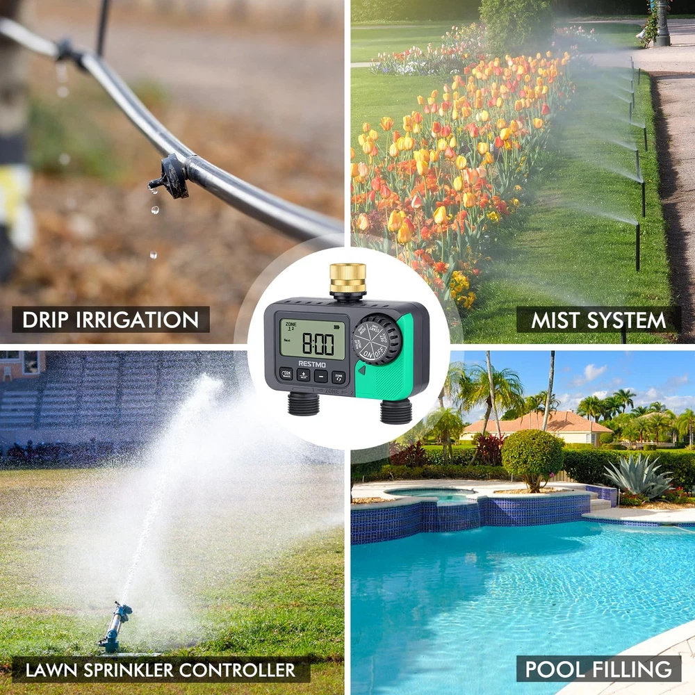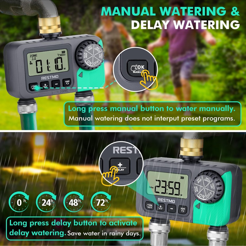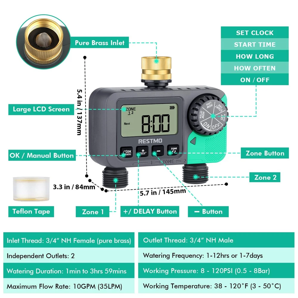 FEATURES: - Pure Brass Inlet Threaded - 2 Zone Programmable Water Timer -Simple to Set Up - Fits into Standard 3/4” Garden Hose & Faucet SPECIFICATIONS: Inlet Thread .....................................................3/4" NH (pure brass) Outlet Thread ........................................................................ 3/4” NH Male Independent Outlets .............................................................................2 Watering Frequency ..................................... 1-12hrs or 1-7 days Watering Duration ..................................................1 min to 3hrs 59mins Rain Delay ...................................................................12/24/48/72hrs Working Pressure ................................................... 8 - 120PSI (0.5 - 8Bar) Maximum Flow Rate ........................................................10GPM (35LPM) Working Temperature ..............................................38 - 120˚F (3 - 50˚C) Waterproof and Dustproof ....................................IP54 Battery .................................... 2 x AAA Alkaline Batteries (not included) Battery Life ............................................................................Approx. 1 year Size …………………………………… 5.7 x 5.4 x 3.3in (14.5 x 13.7 x 8.4cm) Weight ………………………………………………………… 17.5oz (497g) WARRANTY: 100% satisfaction guarantee 45-day money-back guarantee 18-month worry-free replacement service Reliable & Leak-Proof: Pure brass swivel inlet and high working pressure can protect this sprinkler timer from water leakage. The shell is built in with heavy-duty weatherproof construction, UV-resistant material, ideal for outdoor garden watering use and can withstand wind and rain. 2 Independent Zones: This sprinkler timer features with 2 independent outlets, which like separate timers to water two separate areas from one faucet. An ultimate facility to automatically control the watering schedules for your garden, yard and lawn effortlessly. Press zone button to select ZONE 1 or 2, or both. Multi-Functional Sprinkler Timer: It has 3 modes, auto/manual/rain-delay. With auto mode, the watering duration can be from 1min to 239mins and watering frequency can be from 1hr to 12hrs or from 1 day to 7 days. With manual mode, you can water your flowers and plants from 1min to 7hrs 59mins. With rain delay mode, you can choose from 0/24/48/72hrs and meets your flexible watering schedule. Easy To Use: With the large dial and 4 clear buttons, you can easily to read and program. Rotate the dial to set clock, start time, how long and how often. Then your irrigation system will become automatic and operate as per the program. Long press the “OK” and “+” buttons to activate manual mode and rain delay mode. APPLICATION: It is IP54 waterproof and leakproof, which is ideal for outdoor gravity drip irrigation, garden hose watering, lawn sprinkler controller, greenhouse mist system, pool filling, birdbath dripper, rain barrels, pet drinking, etc.