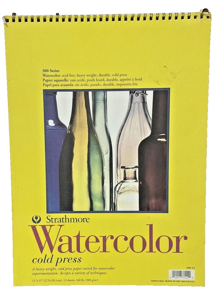 Strathmore 360-11 300 Series Watercolor Pad The pad measures 11\"x15\" and is made of high-quality paper that is perfect for watercolor painting. With a weight of 140lb and a cold press texture, this pad provides a smooth surface that is perfect for creating detailed and intricate drawings. There are 7 pages left in this pad. Please see photos for details and close ups of wear. Quality of paper is excellent