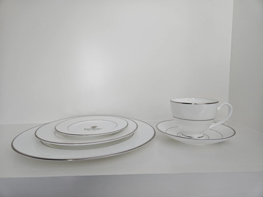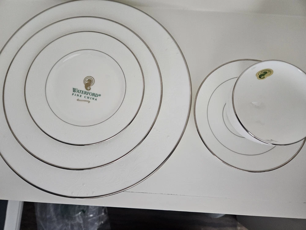 Country/Region of Manufacture:IrelandNumber of Items in Set:Five-PieceBackstamp:PrintedTime Period Manufactured:2000-2009Handmade:NoOccasion:All OccasionsNumber of Place Settings:5MPN:119401Product Line:WaterfordProduction Technique:PotteryMaterial:Bone ChinaSet Includes:Dinner Plate, Plate, Cup, Salad Plate, Bread PlateType:Dinner SetStyle:ContemporaryColor:WhiteCare Instructions:Hand Wash OnlyBrand:WaterfordFeatures:Decorative
