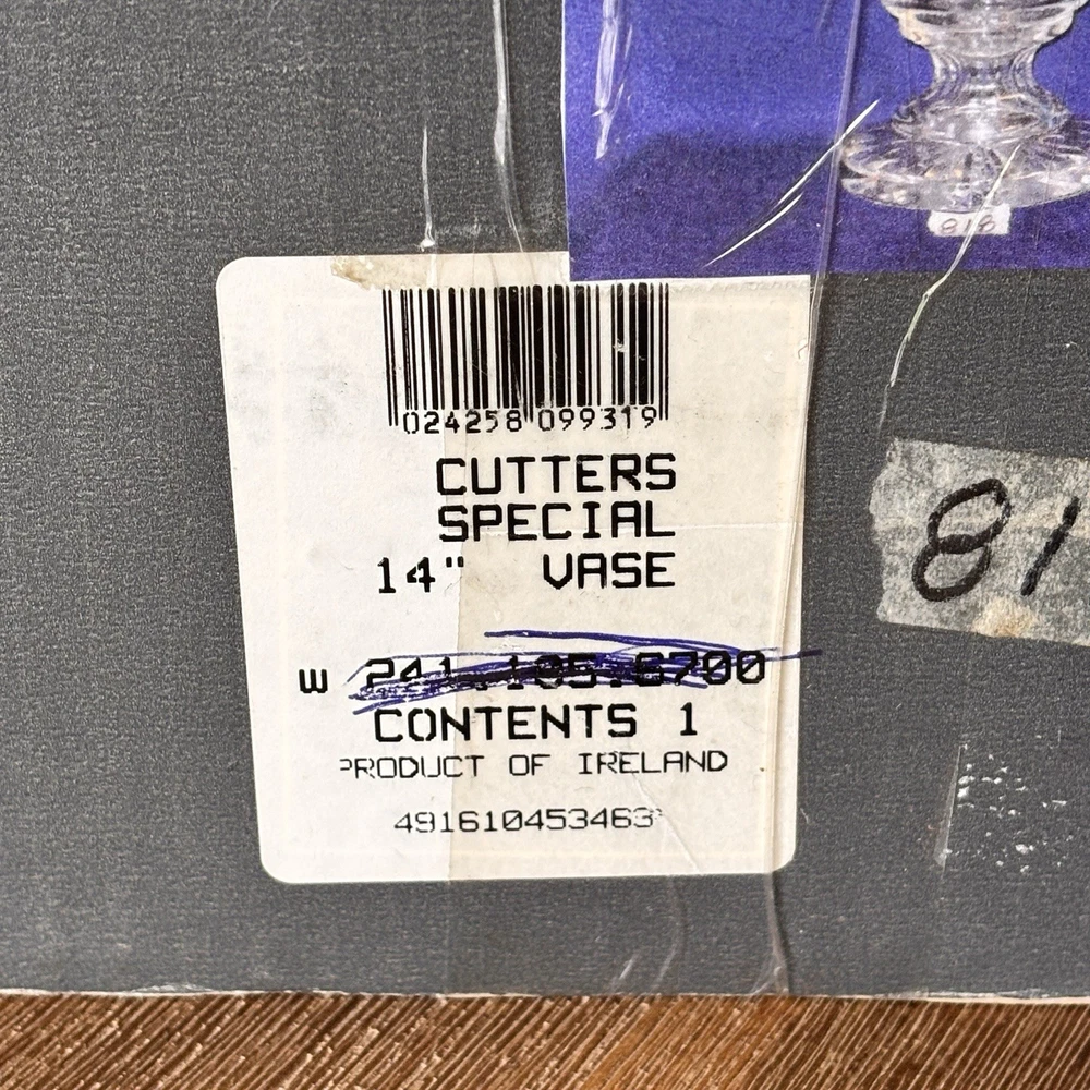 This Waterford Crystal Cutters Special 14" Rare Vase is a stunning piece of art made in Ireland. The vase features a diamond pattern, has the Waterford stamp on the base of the vase, as well as an engraved Waterford signature. Vase base has some very minor wear consistent with use. See photos and please reach out with any questions. Vase comes in original box. Box has tape on it and a picture of the vase taped to it as well. Box has wear.