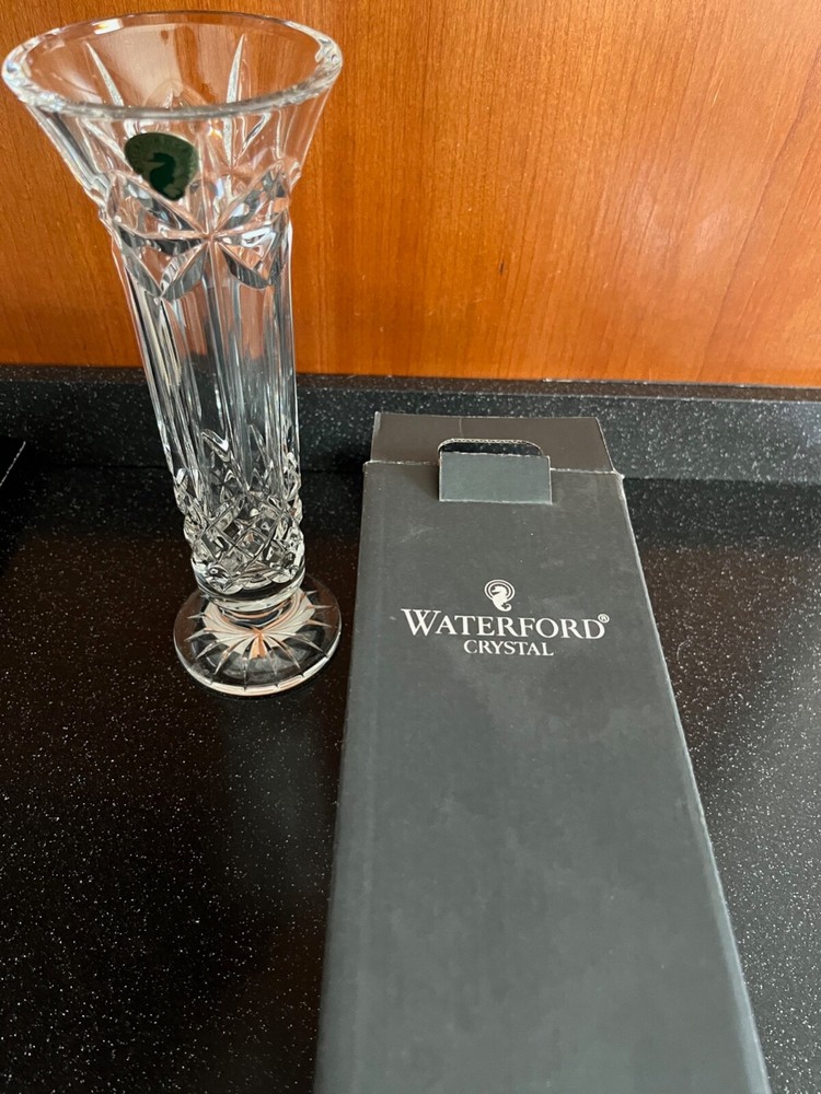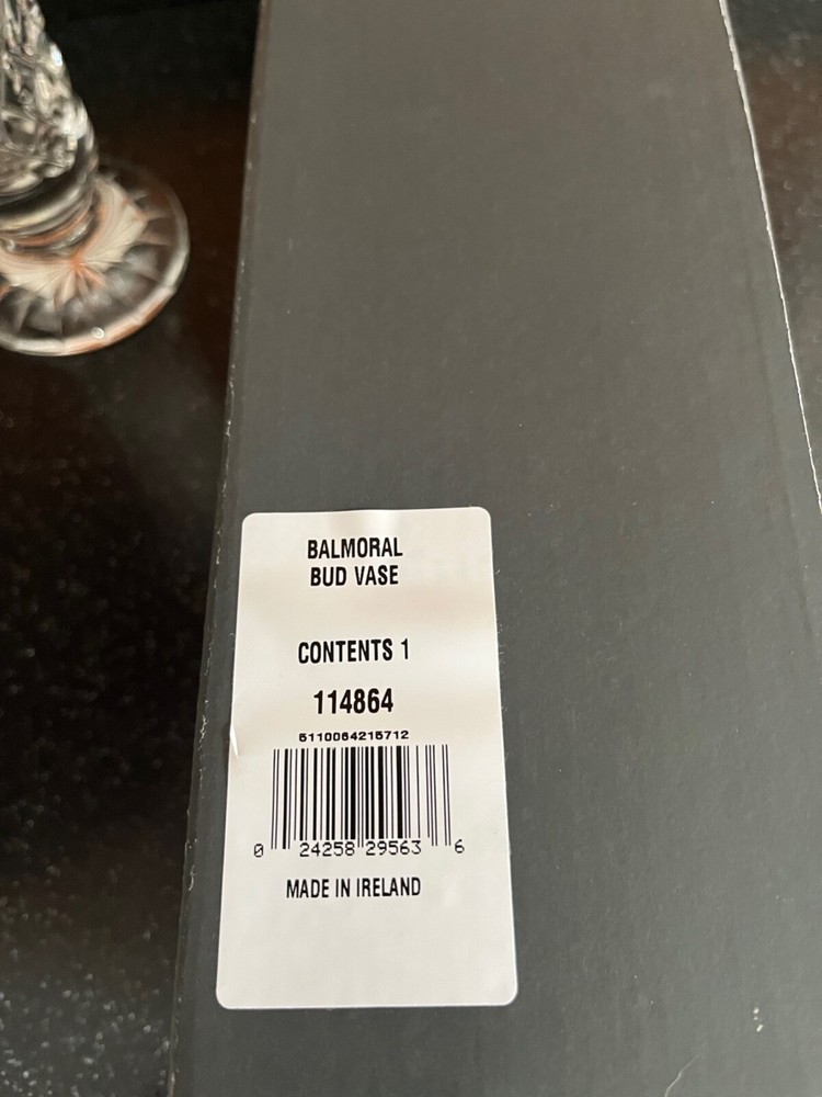 This is a Waterford Crystal Balmoral Bud Vase from Ireland (NEW), featuring a contemporary style with a beautiful cut crystal design. It measures 9" in height and 3" in width and comes in its original packaging box. The Waterford marking is on the bottom of the vase. Please keep in mind that many of the new Waterford crystal pieces are made outside of Ireland. This beautiful vase would make a nice house warming, bridal shower or wedding gift, or just for that special person. Stored in a smoke free environment. Sales are final no returns accepted.