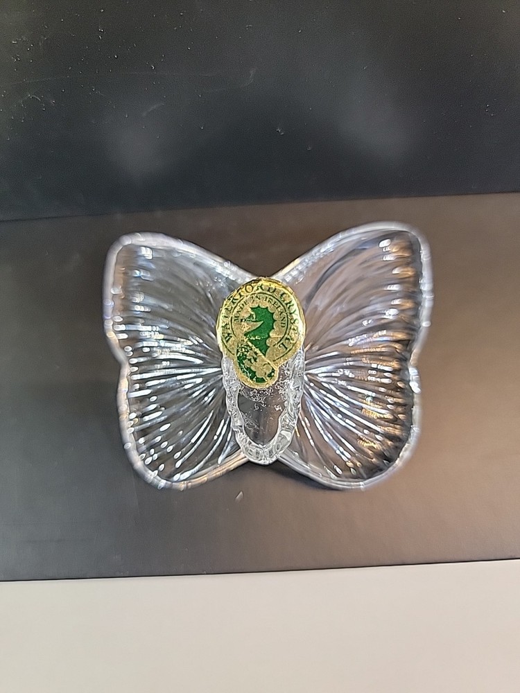 The Waterford Crystal Ireland Butterfly Figurine Paperweight is a stunning piece of art glass crafted by hand in Ireland in 1998. This intricate figurine features a butterfly design in clear crystal, measuring 2 1/2" in length, 2" in height, and 3 1/4" in width. With its Art Deco style and glossy finish, this vintage piece is a decorative and collectible item that showcases the exquisite craftsmanship of Waterford Crystal.