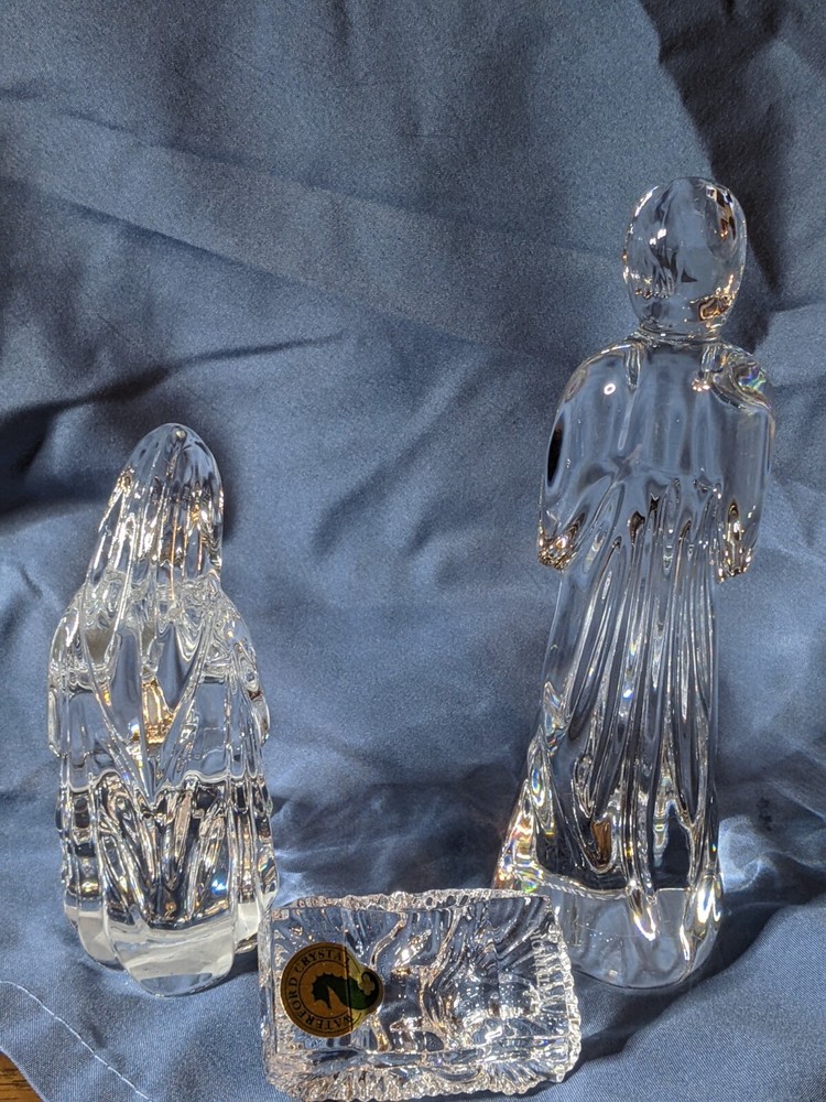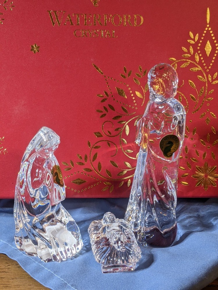 Waterford Crystal clear Nativity Holy Famy -Mary-Joseph-Baby Jesus made in Slovenia in original box. no cracks, chips, defects visibly present. Excellent condition. A beautiful collection which would add to any home decor.