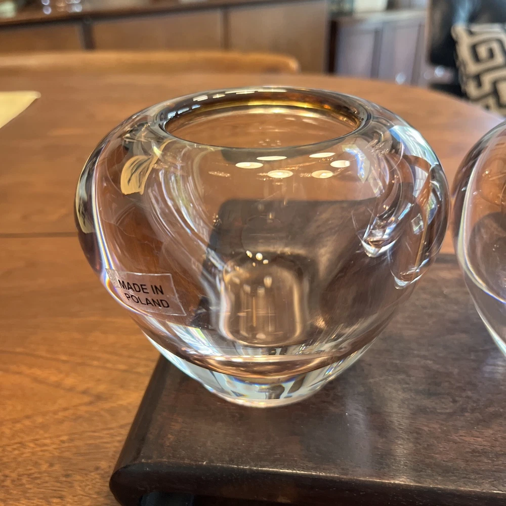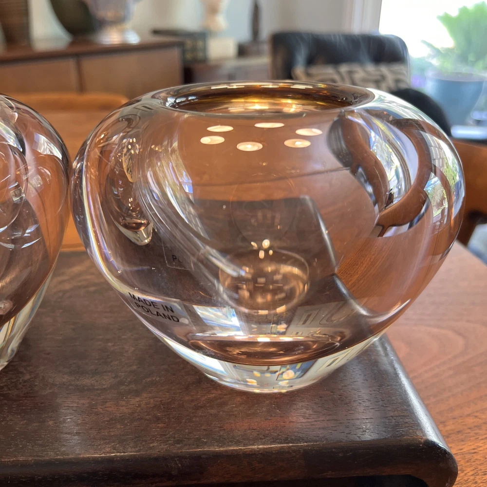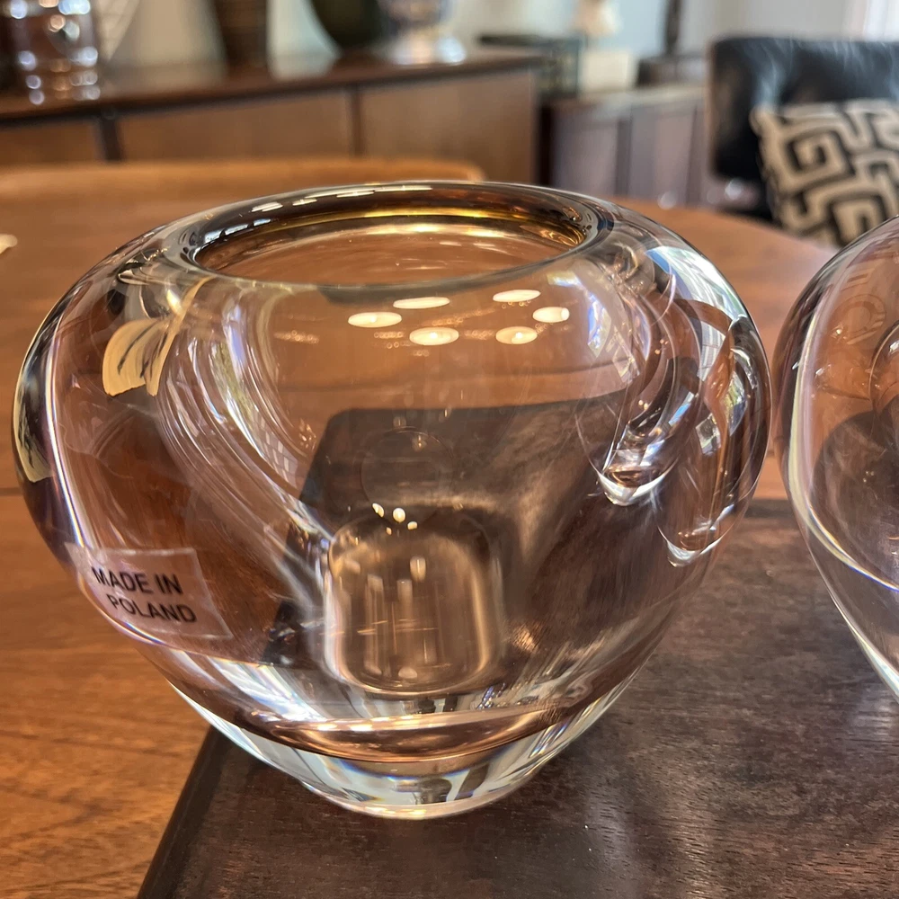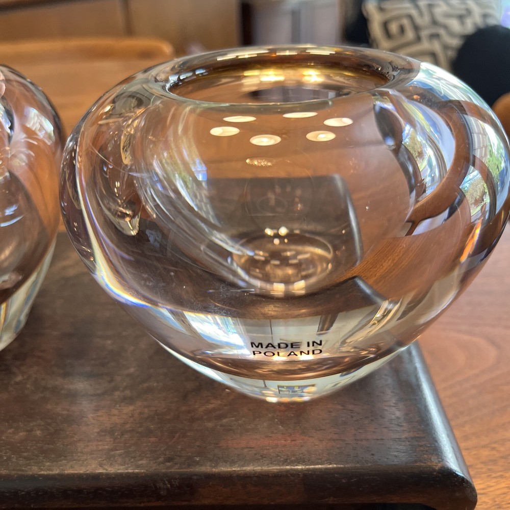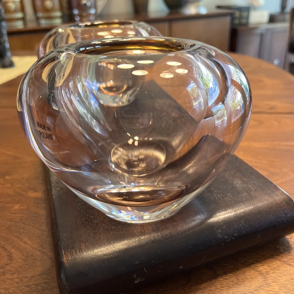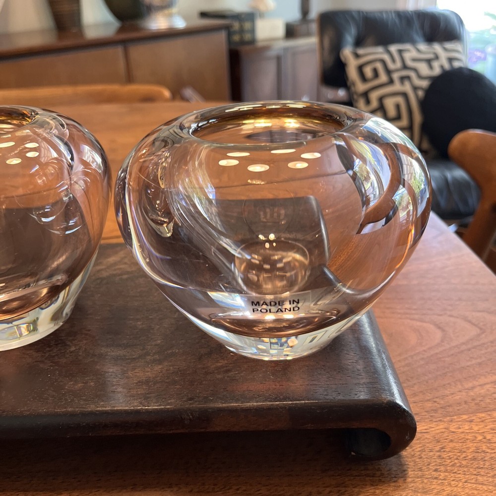 Enhance the beauty of your home decor with this stunning set of two Waterford Evolution Crystal vases. These votive art glass vases feature a lovely pink color that adds a touch of elegance to any room. Crafted in Poland, the vases showcase a mid-century modern style that is perfect for any art-themed space. Made of high-quality glass, these vases are durable and long-lasting. The intricate design and production style of art glass make them a unique addition to your collection. Ideal for displaying flowers or as a decorative piece, these Waterford vases are a must-have for any home. 4” height 5” diameter In beautiful condition (pair)