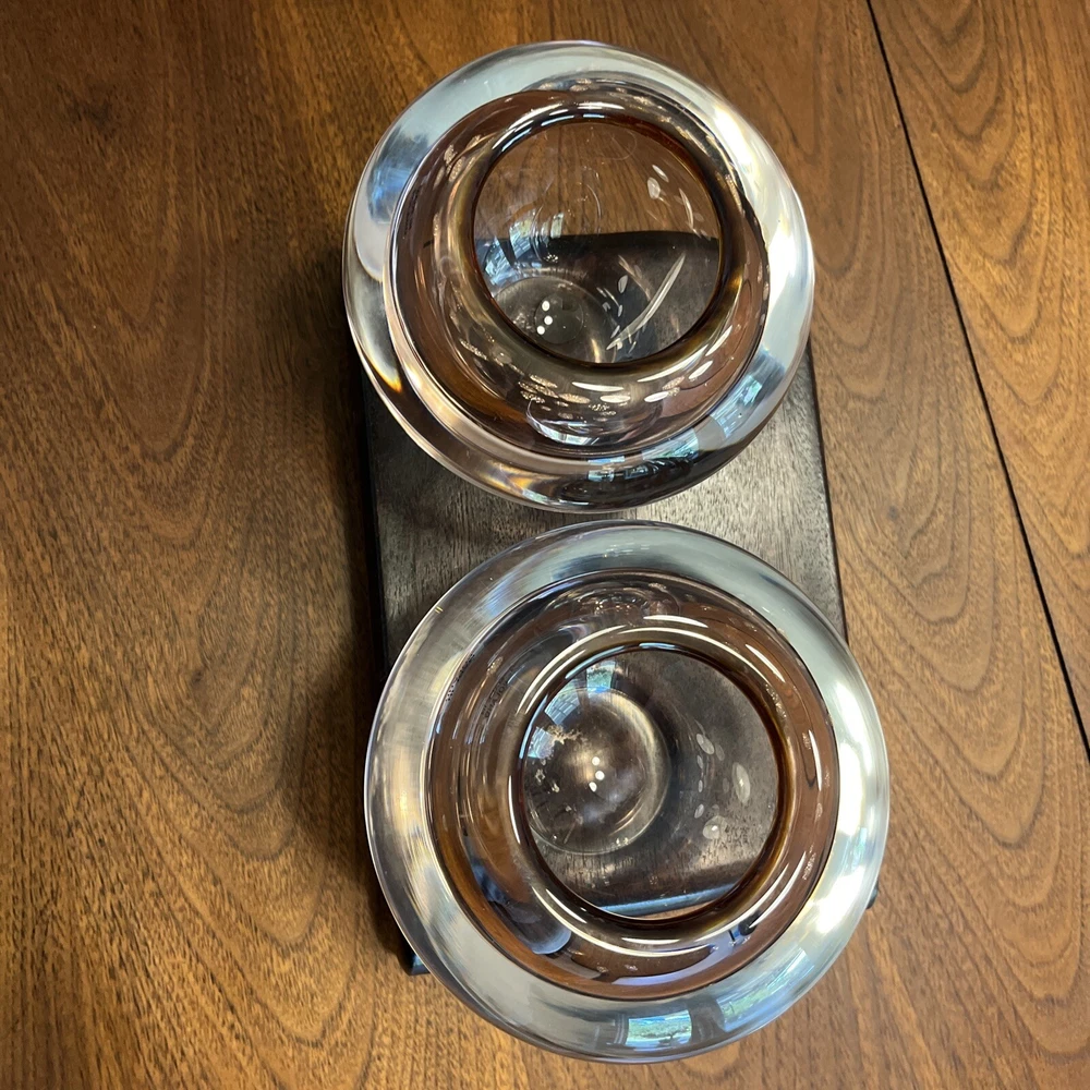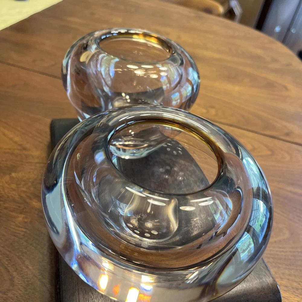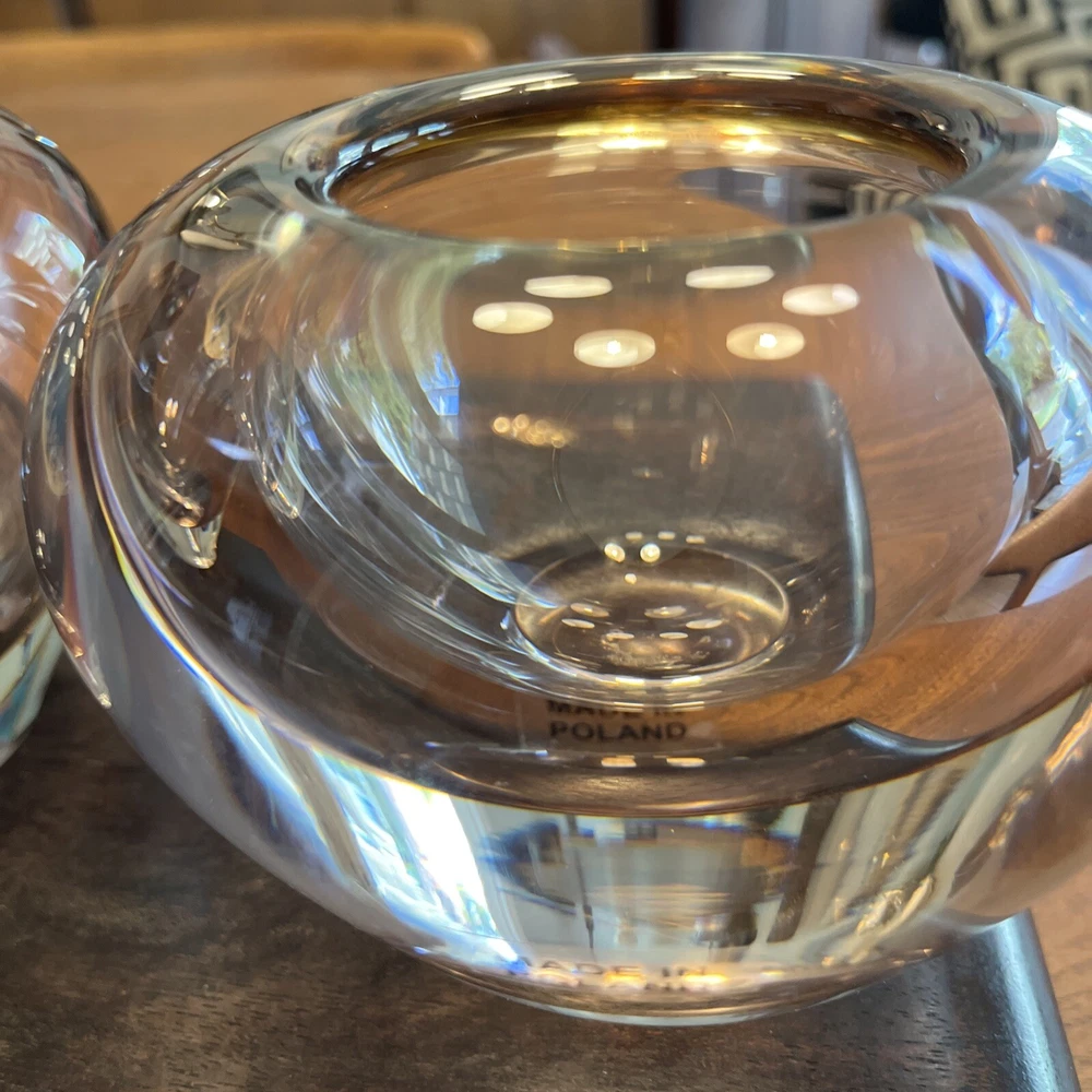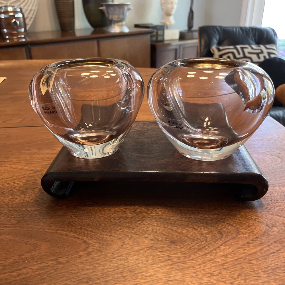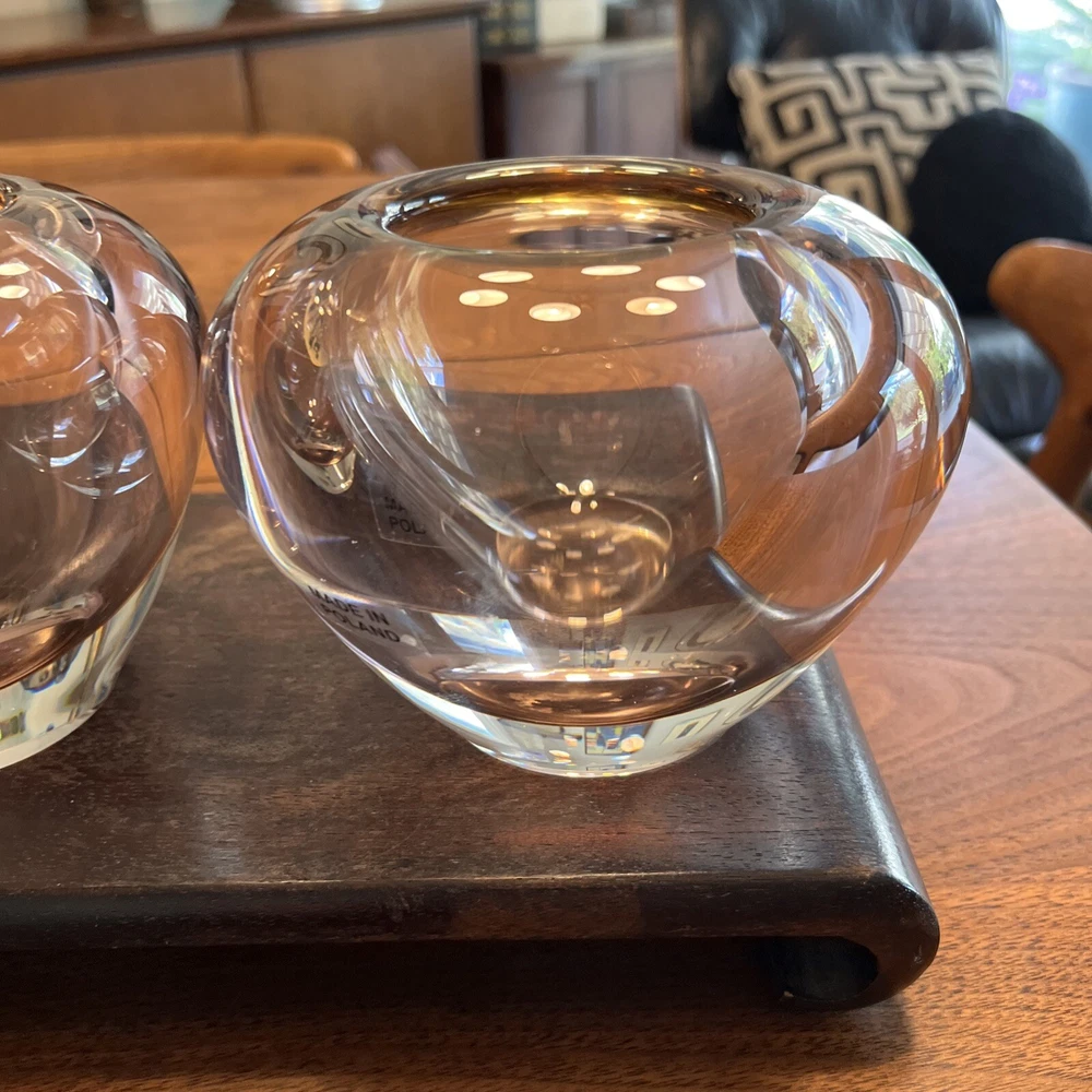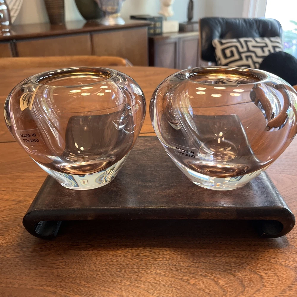 Enhance the beauty of your home decor with this stunning set of two Waterford Evolution Crystal vases. These votive art glass vases feature a lovely pink color that adds a touch of elegance to any room. Crafted in Poland, the vases showcase a mid-century modern style that is perfect for any art-themed space. Made of high-quality glass, these vases are durable and long-lasting. The intricate design and production style of art glass make them a unique addition to your collection. Ideal for displaying flowers or as a decorative piece, these Waterford vases are a must-have for any home. 4” height 5” diameter In beautiful condition (pair)
