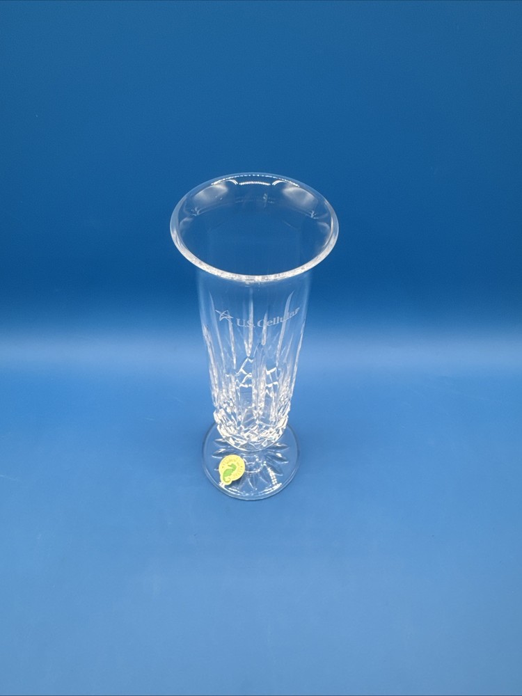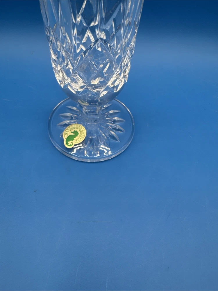 This is a Waterford Crystal Lismore vase with a footed stem, marked with the Waterford logo and measuring 8 inches in length. It comes with its original label intact. The vase features intricate crystal designs, making it a collectible decorative piece. Pre-owned excellent condition. No cracks or damages. No original box. Has engraving. Please check the pictures carefully as part of the description. Feel free to ask questions if you need more information before you buy it. Thank you for your interest C-11