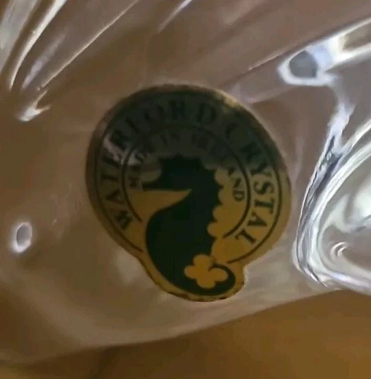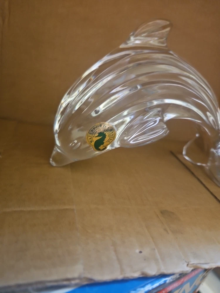 This is a 5 ¼" leaping dolphin, solid crystal. Made in Ireland. It has no visible marks on it. Very clear and shiny. Does have a Waterford sticker on it.