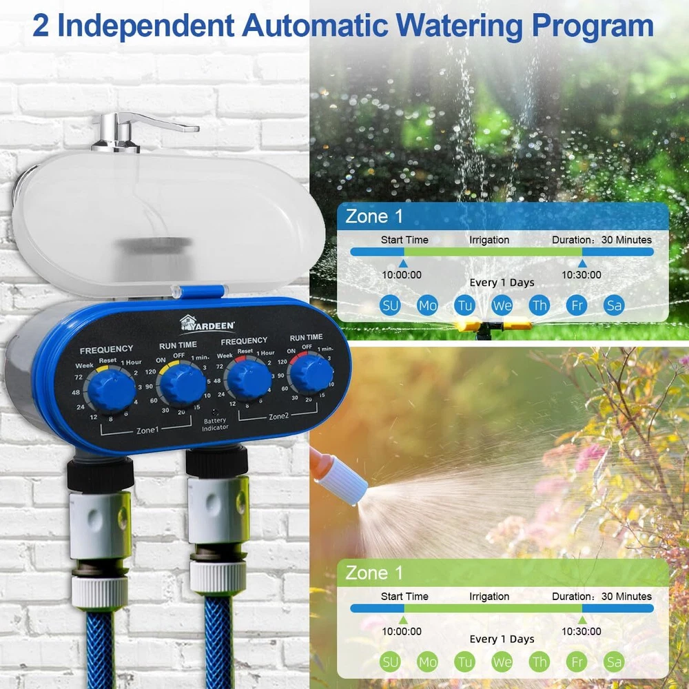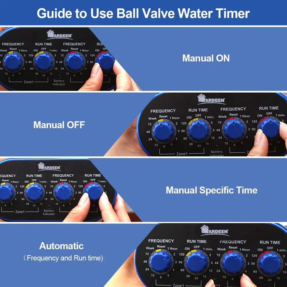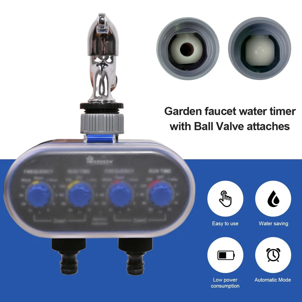The outlet water timer is made by ABS Plastic and can be used many years. The outlets for independent timed watering can be connected to hose faucet directly. With waterproof design can prevent rain effectively. PROGRAMMING 1. Turn the knobs to set up the FREQUENCY TIME in hours and the RUN TIME in minutes. MINI WATER TIMER: This garden hose timer is designed 2 separate valves with maximum flexibility settings. Customize each hose with its own watering duration and frequency according to your precise needs. Use water timer to control watering your lawn and garden AUTO SPRINKLER TIMER: Garden faucet water timer with Ball Valve attaches to any garden outdoor hose faucet with a standard ¾” GHS (Garden Hose Standard) thread. 0-8 bar water pressure for single outlet ball valve water timer has Low water quality requirements, impurity water and collected water is able to work with Aqualin ball valve water timer EASY TO USE : Features a swivel coupling for easy and quick NO tools needed connection. This electronic water timer is designed for use in gardens, lawn greenhouses and more, and can control sprinklers and water systems. A modern and stylish look will not interfere with the look of your beautiful garden. FOR OUTDOOR USE :High-quality ABS shell makes the water timer fully waterproof, anti-uv and anti-drop. Built-in stainless steel high-density filter in the water inlet will block the impurities in the water to ensure the long-term operation of the internal structure of the controller. It can effectively save water while ensuring sufficient water for plants SPECIFICATIONS: Low power consumption, 2*1.5V AA Alkaline batteries must be used (Not Included) which allows the water timer to work over 6 months. If the program does not respond, please check whether the battery power is sufficient, the timer will not be activated if the power is insufficient.