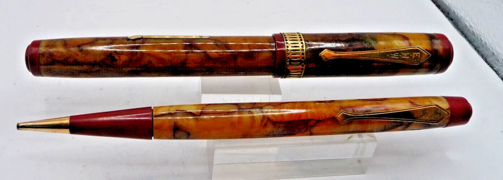 Waterman Vintage {Nacre} Celluoid Patrician Lever Fill Fountain Pen and Pencil Set Restored with new sac installed no wear to gold trim 2 initials engraved on each clip Visit my Ebay store