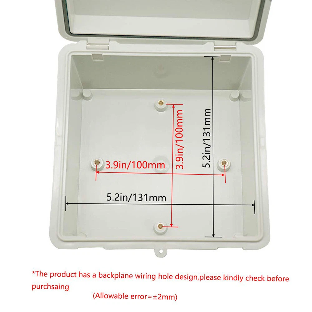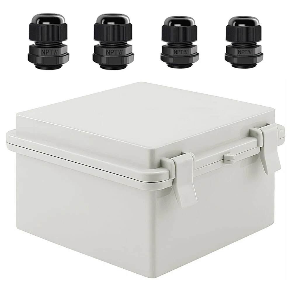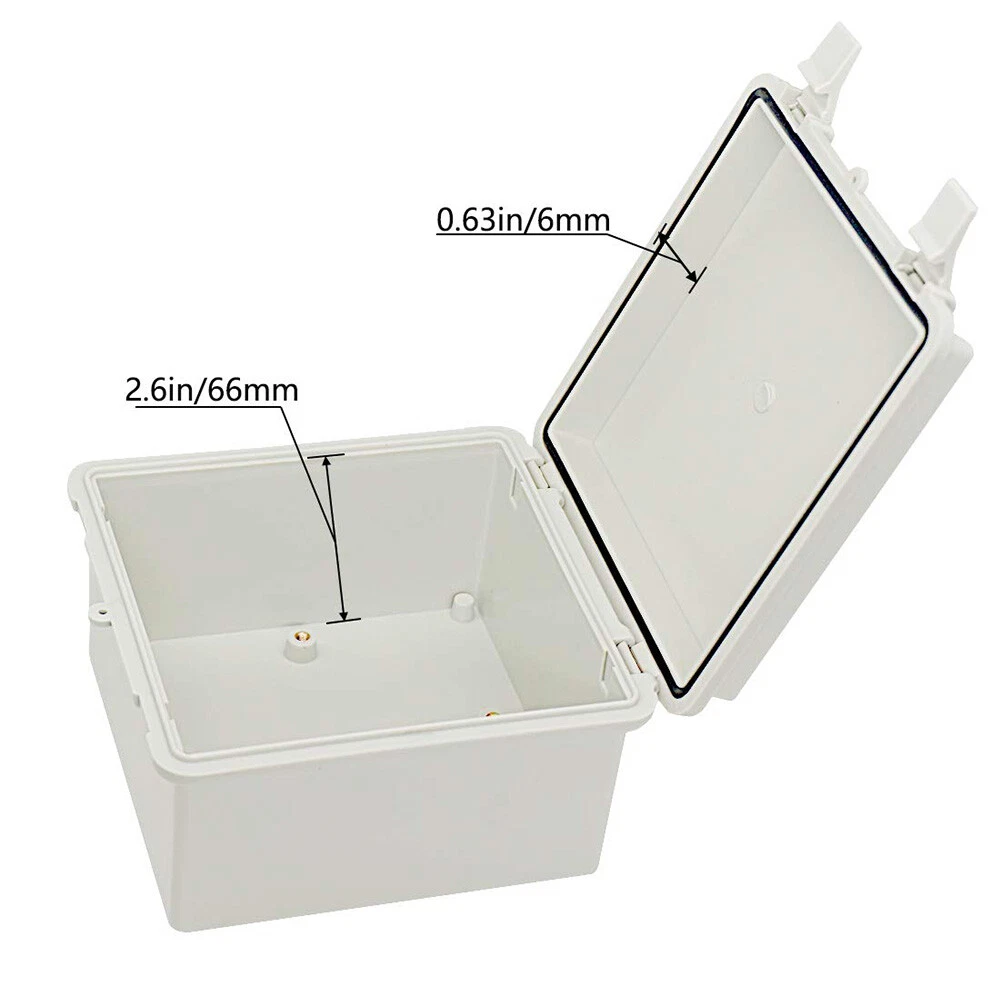 About this item: 【Specifications】Product name: Electrical Box; Waterproof rating : IP65; Qualification:CE、ROHS; Material: ABS, PC; Main Color: Gray 【Industrial Electrical Box】: electrical unit is not only weather resistant but also waterproof and does not allow dust to enter. You can drill holes inside depending upon your project requirement with no cracks and compromise 【Easy to operate】: electrical unit is easy to install, Hinged enclosure makes the opening and closing easier; Come with gr ey transparent cover,the inner project of junction box can be more visible 【Comprehensive Industrial Enclosure】: The junction box features two or three plastic latches for added security and locking. Moisture proof, sunscreen, anti-corrosion for safety from weather based environmental hazards Size: 5.9" x 5.9" x 3.5" Package Included: 1x Waterproof Junction Box 2x NPT 3/8 Cable Gland 2x NPT 1/2 Cable Gland