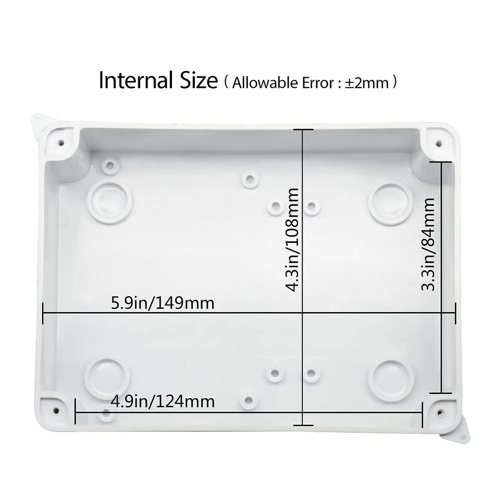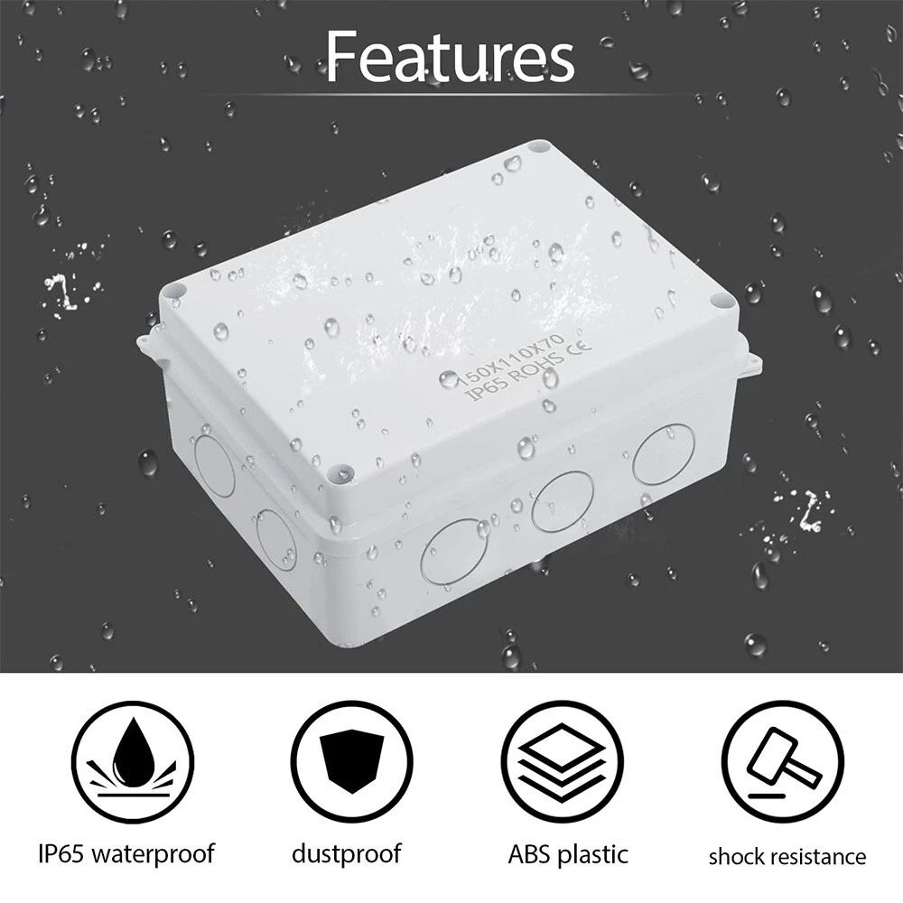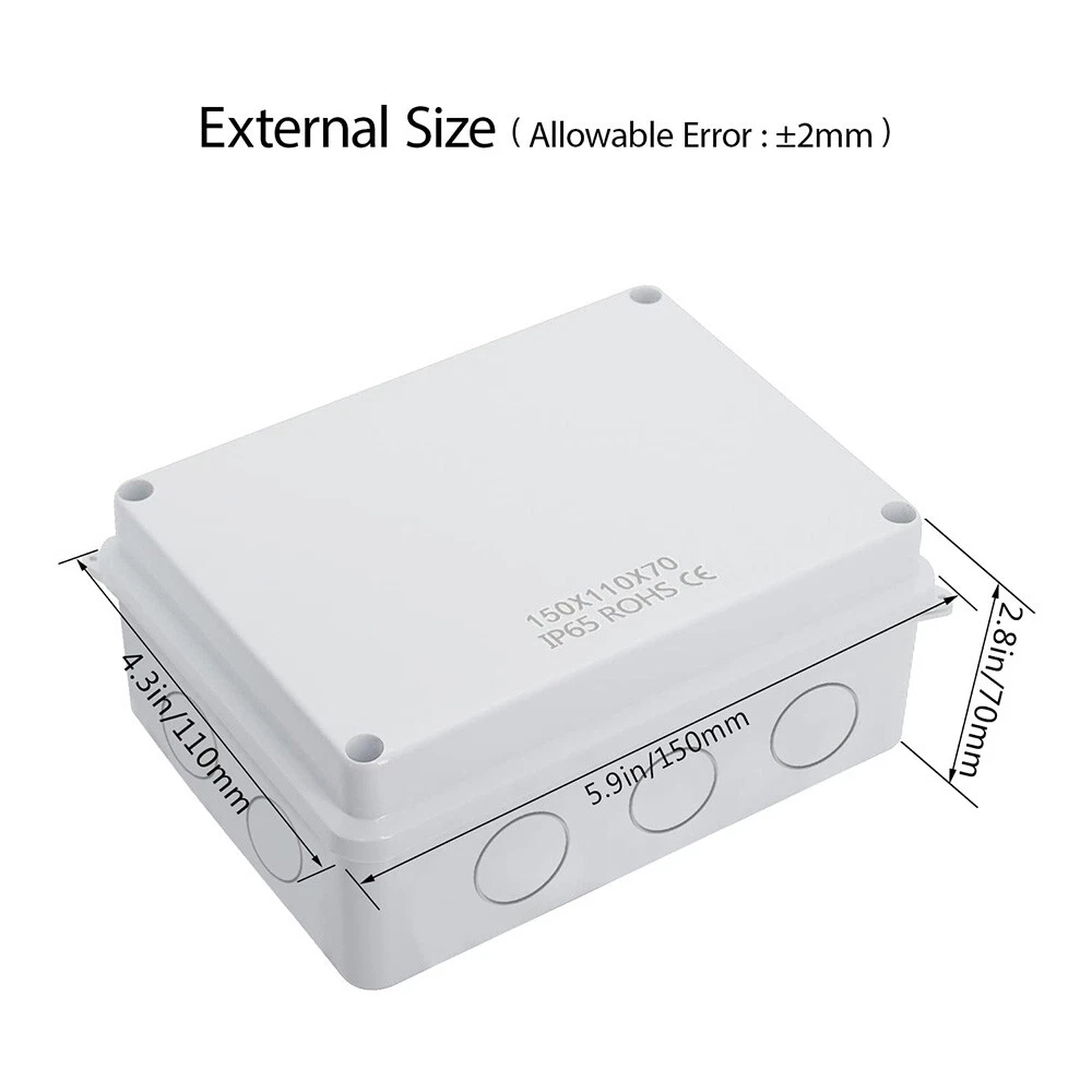 Features: [ Sturdy Construction ] Electrical Junction box is made of high-quality ABS plastic material, which offers excellent impact resistance and electrical insulation. Rest assured that your equipment will be well-protected in harsh environments. [ Safe and Certificated ] With CE RoHS compliant and waterproof rated, the electrical box is free of hazardous substances. The plastic box is predrilled which is easy to install and modify for your project. [ Indoor and Outdoor Use ] With the feature of water resistance and dustproof,it can effectively block splashing water, rain, dust, snow, oil, UV and more. Whether you need to use it indoors or outdoors, this surface mounted project box is easy to operate. [ Extensive Application ] Our junction box is used in a variety of applications: residential homes wiring and connecting electrical devices, such as light fixtures, switches, and outlets; protect and connect electrical equipment for machines, motors etc. Size: 5.9"x4.3"x2.75" Package Included: 1x Electrical Junction Box