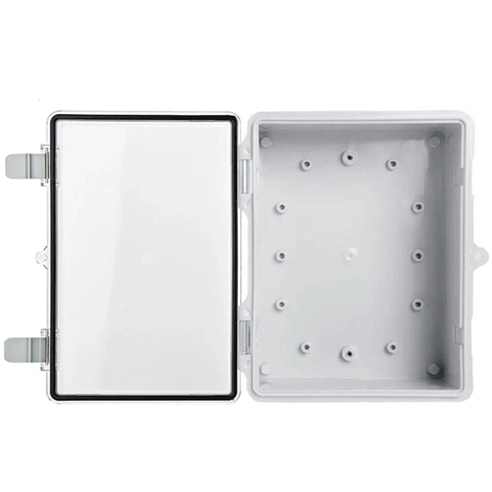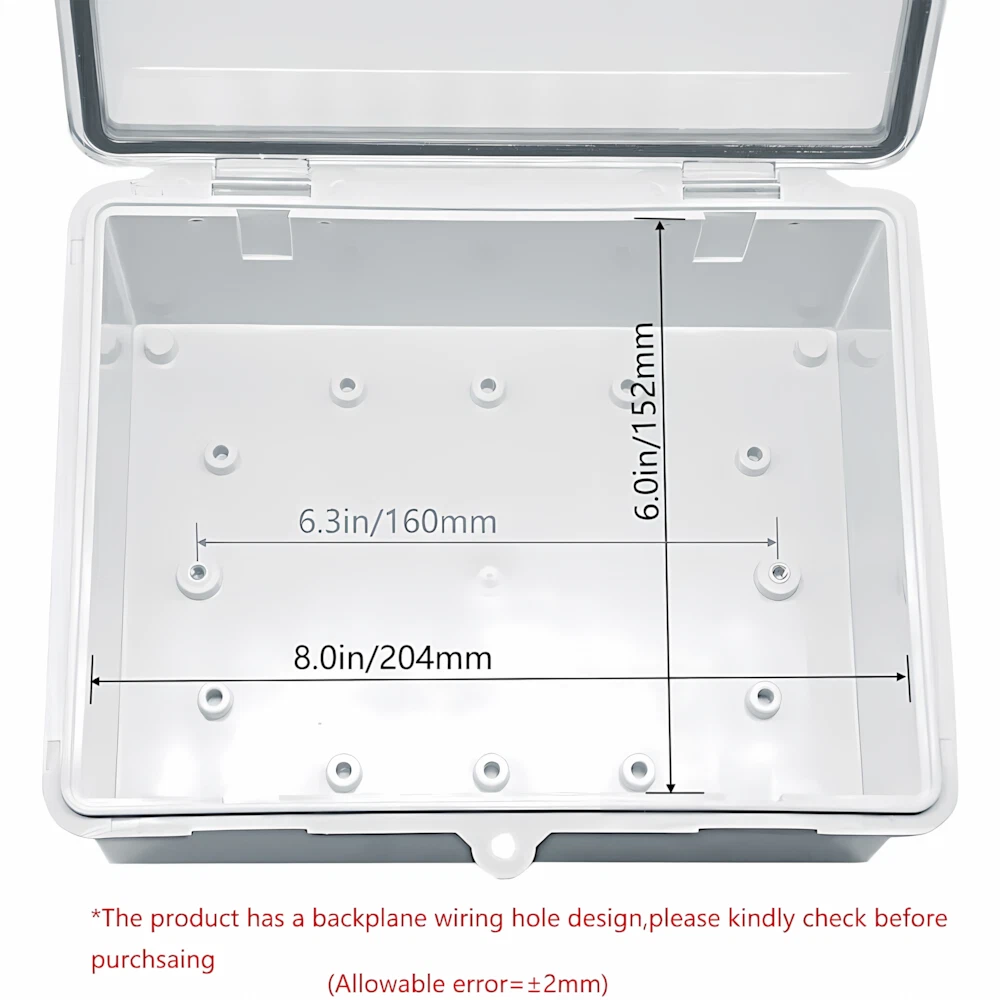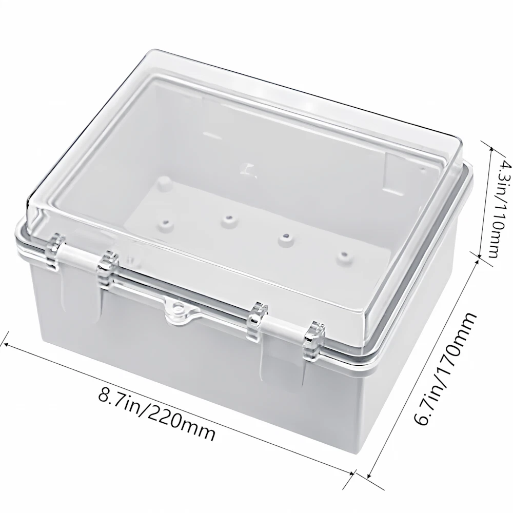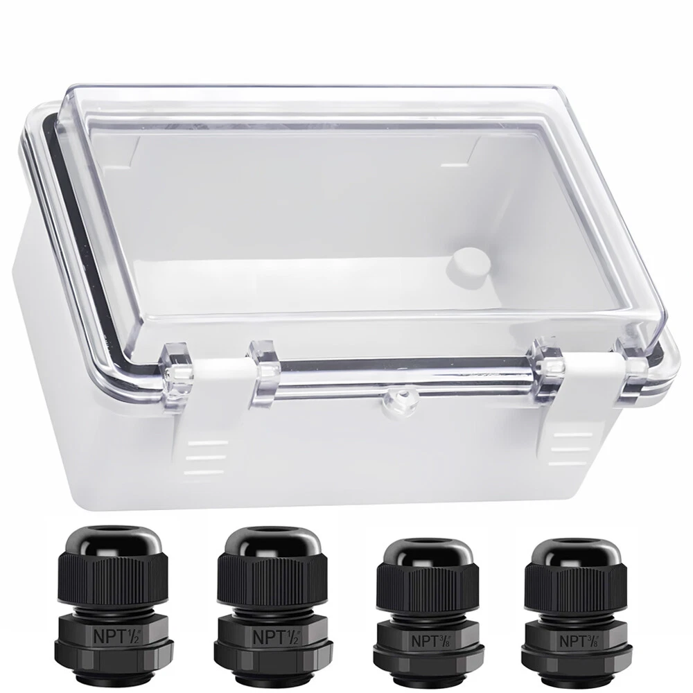 About this item: 【Specifications】Product name: Electrical Box; Waterproof rating : IP65; Qualification:CE、ROHS; Material: ABS, PC; Main Color: Gray 【Industrial Electrical Box】: electrical unit is not only weather resistant but also waterproof and does not allow dust to enter. You can drill holes inside depending upon your project requirement with no cracks and compromise 【Easy to operate】: electrical unit is easy to install, Hinged enclosure makes the opening and closing easier; Come with gr ey transparent cover,the inner project of junction box can be more visible 【Comprehensive Industrial Enclosure】: The junction box features two or three plastic latches for added security and locking. Moisture proof, sunscreen, anti-corrosion for safety from weather based environmental hazards Size: 8.7" x 6.7" x 4.3" Package Included: 1x Waterproof Junction Box 2x NPT 3/8 Cable Gland 2x NPT 1/2 Cable Gland