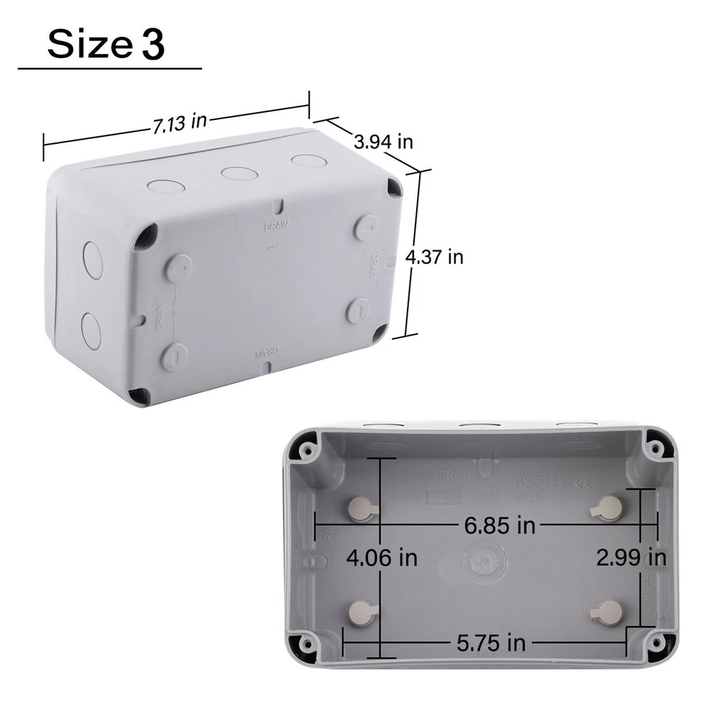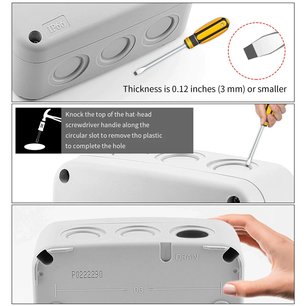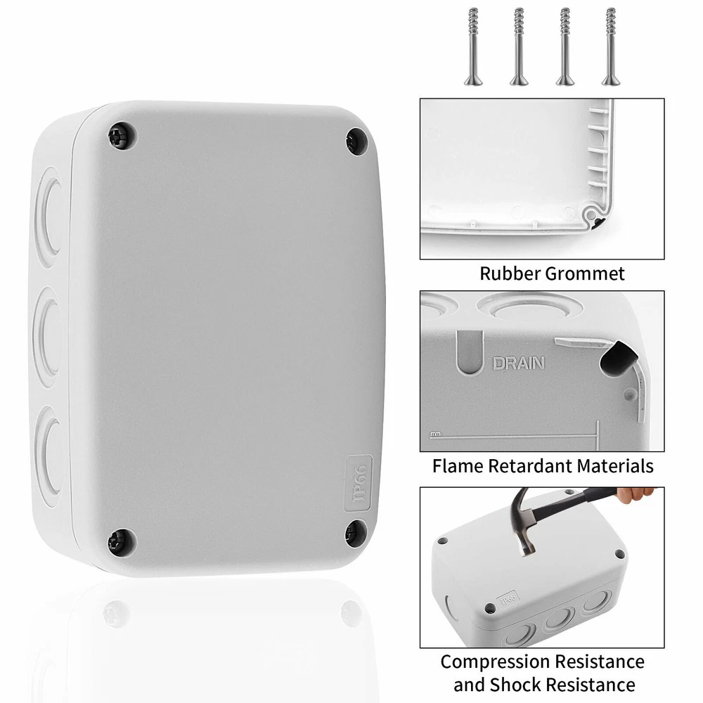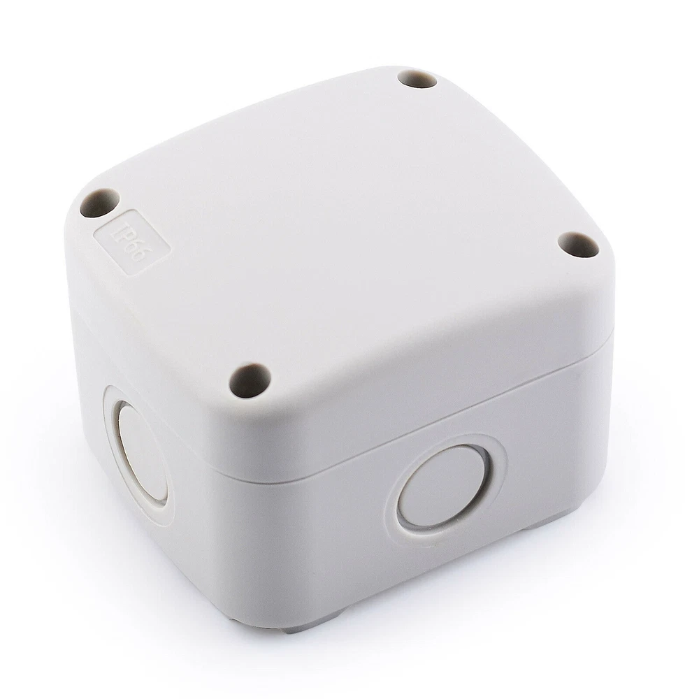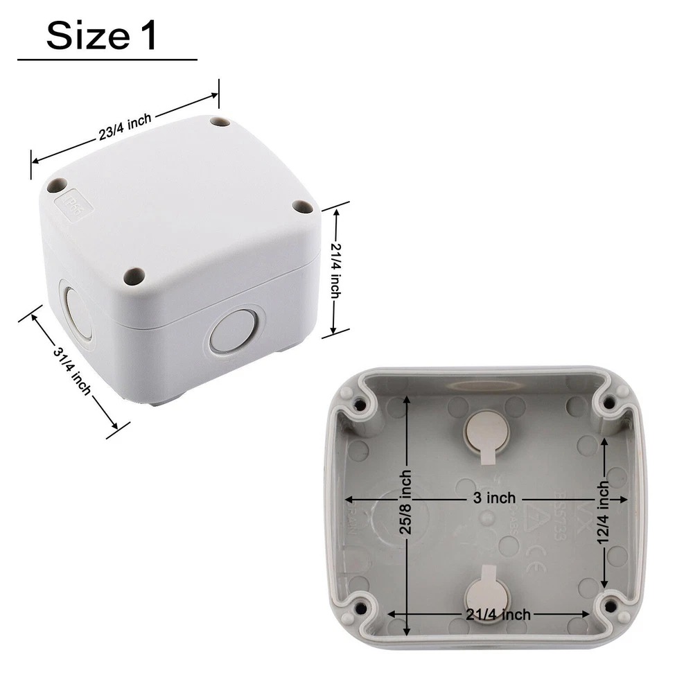 Features: Multi-Way Junction Box: Multiple 20mm cable gland entries from all sides. Quality Guarantee: Made of high-quality ABS material, NEMKO and CE certified, more solid and reliable. IP66 Waterproof: Built-in waterproof flame-retardant silicone seal ring, well protected from rain and water splash back, perfect for outdoor use. Large Inner Space: Large inner space design allows you to join more wires inside. Wide Application: Suitable for quick connection of indoor and outdoor lighting, external wiring, extension and connection cable or tidy up the wire, great for your home, garden, farm or construction plant. It is also applicable to the outdoor lamps and lanterns connection. GFCI Outlet Receptacle 4.2A High Speed Smart Dual USB Ports Wall Charger Outlet 4.2A High Speed Smart Dual USB Ports Wall Charger Outlet 4.2A High Speed Smart Dual USB Ports Wall Charger Outlet Multi-Way IP66 Waterproof Junction Box Features: Multi-Way Junction Box: Multiple 20mm cable gland entries from all sides. Quality Guarantee: Made of high-quality ABS material, NEMKO and CE certified, more solid and reliable. IP66 Waterproof: Built-in waterproof flame-retardant silicone seal ring, well protected from rain and water splash back, perfect for outdoor use. Large Inner Space: Large inner space design allows you to join more wires inside. Wide Application: Suitable for quick connection of indoor and outdoor lighting, external wiring, extension and connection cable or tidy up the wire, great for your home, garden, farm or construction plant. It is also applicable to the outdoor lamps and lanterns connection. Details: Condition 100% Brand New Material ABS Color Greyish White Waterproof Rating IP66 Certificate NEMKO, CE Installation Method Screw-In Size 1 Outer Box Size:86 (L) x 74(W) x 62(H) mm Size 3 Outer Box Size: 181(L) x 111(W) x 100(H) mm Inner Box Size:172(L) x 100(W) x 90(H) mm Wire Connectors 6~12mm Diameter Cable Wiring demonstration drawing The dotted line position is the hole groove, which can be pierced with hard objects. According to your requirements,you can open 5 holes. (size1) According to your requirements,you can open 10 holes.(size3) In order to ensure the tightness of the box, our holes are opened by customers according to their needs. How to open the holes? Step 1 Please make sure that the cover of the waterproof box is closed. (Opening holes without closing the cover of the waterproof box can easily cause the waterproof box to break) Prepare a flat-head screwdriver with a thickness of 0.12 inches (3 mm) or smaller. Step 2 Insert the flat-head screwdriver into the circular slot,and then knock the top of the flat-head screwdriver handle along the circular slot to remove the plastic to complete the hole. Step 3 After opening the hole, there may be some burrs around the hole, which needs to be polished with sandpaper. You can install the cable glands as your requirement after opening the holes. GFCI Outlet Receptacle On Jul 7, 2022 at 19:32:12 PDT, seller added the following information: On Feb 5, 2023 at 20:01:50 PST, seller added the following information: