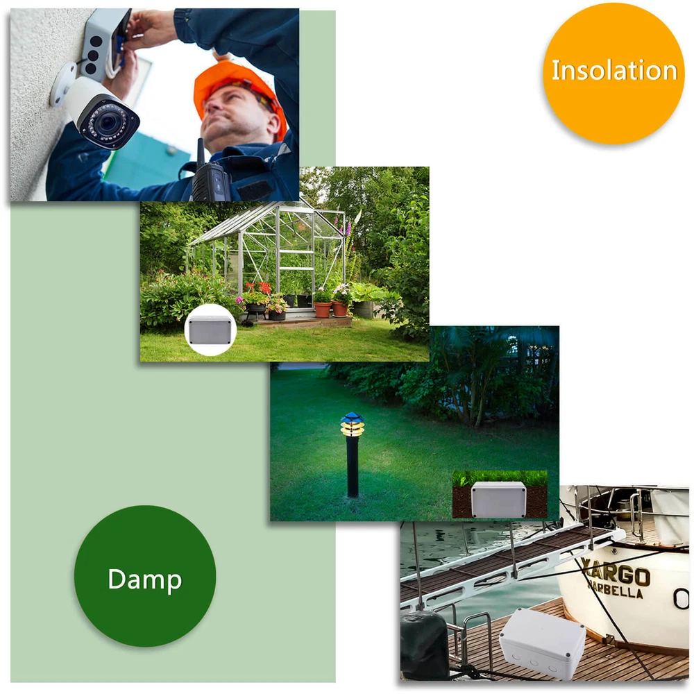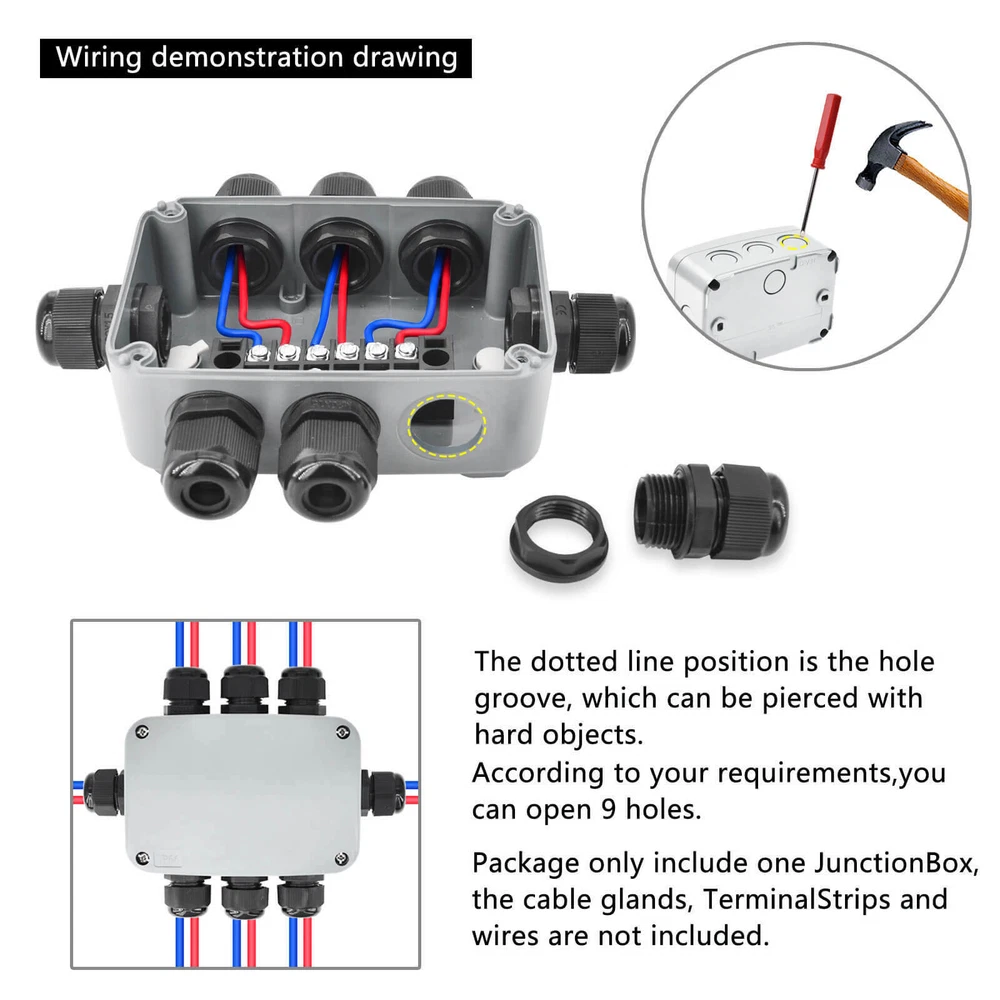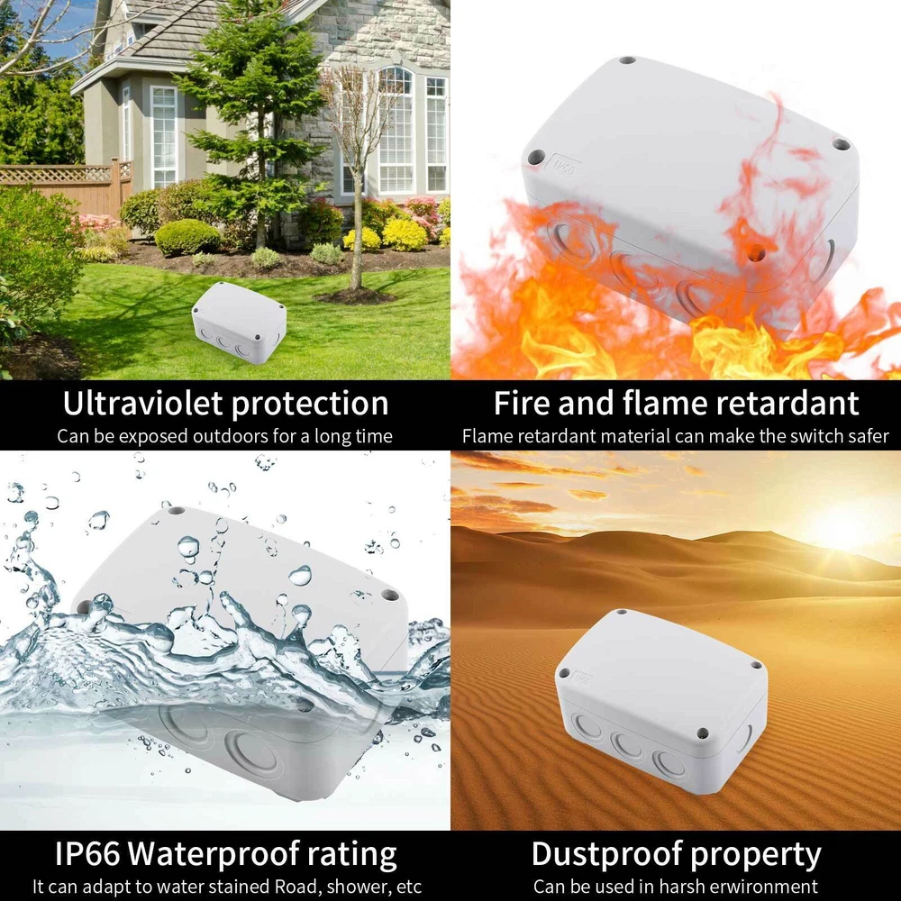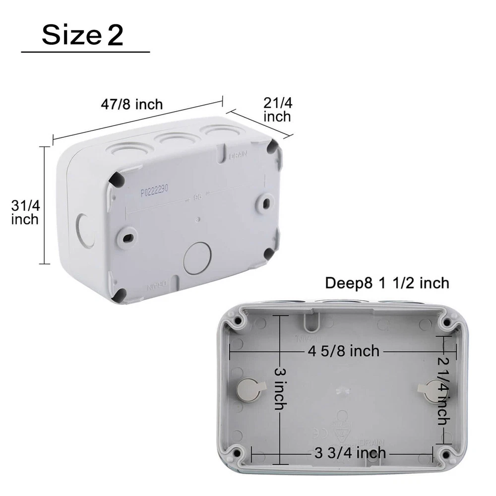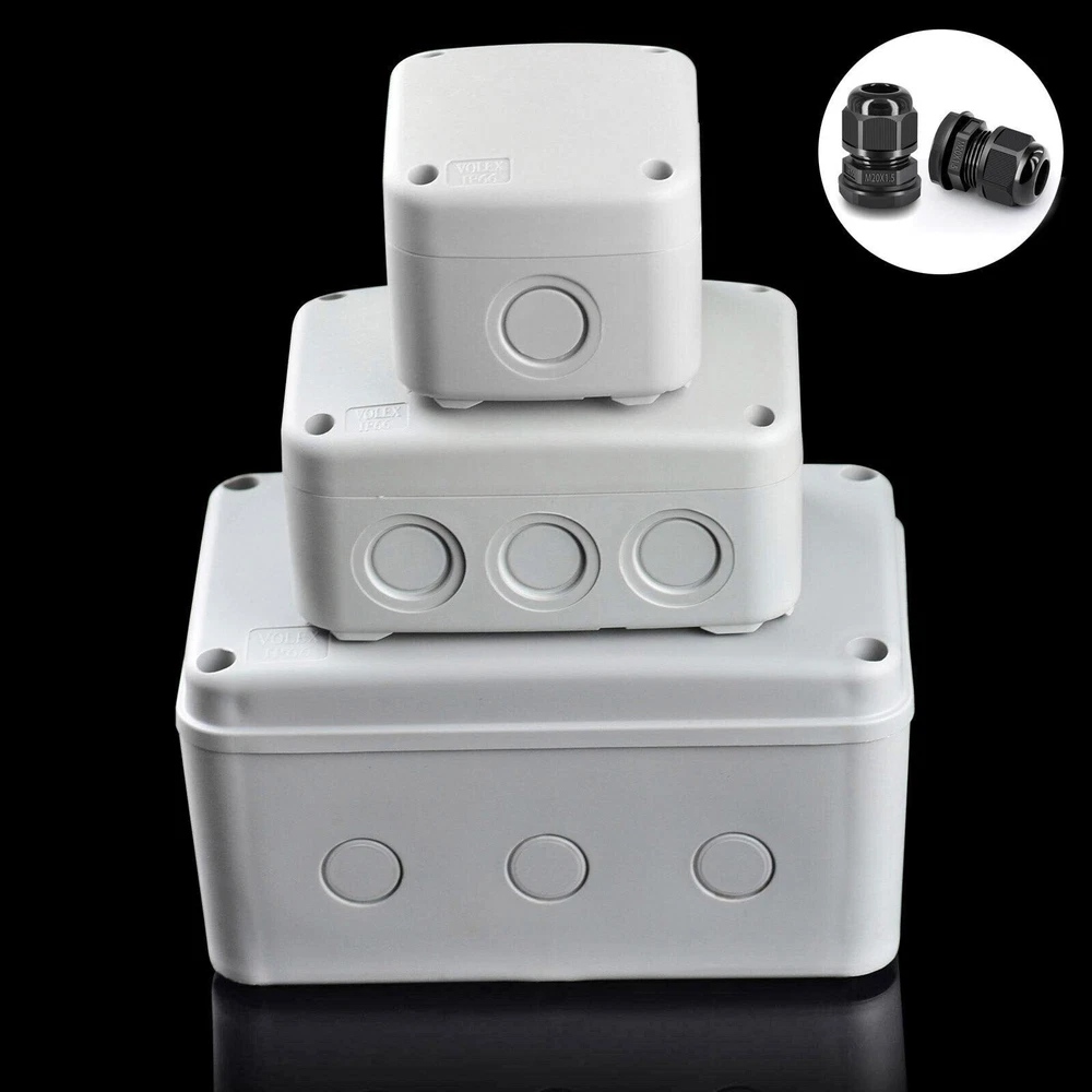 Features: Multi-Way Junction Box: Multiple 20mm cable gland entries from all sides. Quality Guarantee: Made of high-quality ABS material, NEMKO and CE certified, more solid and reliable. IP66 Waterproof: Built-in waterproof flame-retardant silicone seal ring, well protected from rain and water splash back, perfect for outdoor use. Large Inner Space: Large inner space design allows you to join more wires inside. Wide Application: Suitable for quick connection of indoor and outdoor lighting, external wiring, extension and connection cable or tidy up the wire, great for your home, garden, farm or construction plant. It is also applicable to the outdoor lamps and lanterns connection. GFCI Outlet Receptacle 4.2A High Speed Smart Dual USB Ports Wall Charger Outlet 4.2A High Speed Smart Dual USB Ports Wall Charger Outlet 4.2A High Speed Smart Dual USB Ports Wall Charger Outlet Multi-Way IP66 Waterproof Junction Box Features: Multi-Way Junction Box: Multiple 20mm cable gland entries from all sides. Quality Guarantee: Made of high-quality ABS material, NEMKO and CE certified, more solid and reliable. IP66 Waterproof: Built-in waterproof flame-retardant silicone seal ring, well protected from rain and water splash back, perfect for outdoor use. Large Inner Space: Large inner space design allows you to join more wires inside. Wide Application: Suitable for quick connection of indoor and outdoor lighting, external wiring, extension and connection cable or tidy up the wire, great for your home, garden, farm or construction plant. It is also applicable to the outdoor lamps and lanterns connection. Details: Condition 100% Brand New Material ABS Color Greyish White Waterproof Rating IP66 Certificate NEMKO, CE Installation Method Screw-In Size 1 Outer Box Size:86 (L) x 74(W) x 62(H) mm Size 3 Outer Box Size: 181(L) x 111(W) x 100(H) mm Inner Box Size:172(L) x 100(W) x 90(H) mm Wire Connectors 6~12mm Diameter Cable Wiring demonstration drawing The dotted line position is the hole groove, which can be pierced with hard objects. According to your requirements,you can open 5 holes. (size1) According to your requirements,you can open 10 holes.(size3) In order to ensure the tightness of the box, our holes are opened by customers according to their needs. How to open the holes? Step 1 Please make sure that the cover of the waterproof box is closed. (Opening holes without closing the cover of the waterproof box can easily cause the waterproof box to break) Prepare a flat-head screwdriver with a thickness of 0.12 inches (3 mm) or smaller. Step 2 Insert the flat-head screwdriver into the circular slot,and then knock the top of the flat-head screwdriver handle along the circular slot to remove the plastic to complete the hole. Step 3 After opening the hole, there may be some burrs around the hole, which needs to be polished with sandpaper. You can install the cable glands as your requirement after opening the holes. GFCI Outlet Receptacle On Jul 7, 2022 at 19:32:12 PDT, seller added the following information: On Feb 5, 2023 at 20:01:50 PST, seller added the following information: