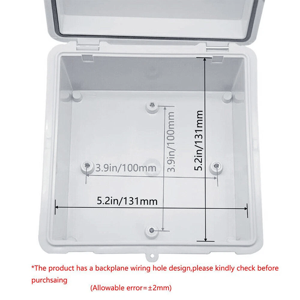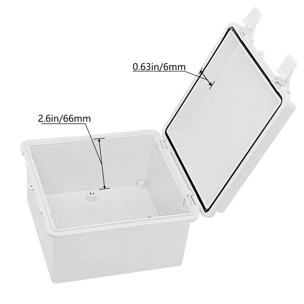 About this item: 【Specifications】Product name: Electrical Box; Waterproof rating : IP65; Qualification:CE、ROHS; Material: ABS, PC; Main Color: Gray 【Industrial Electrical Box】: electrical unit is not only weather resistant but also waterproof and does not allow dust to enter. You can drill holes inside depending upon your project requirement with no cracks and compromise 【Easy to operate】: electrical unit is easy to install, Hinged enclosure makes the opening and closing easier; Come with gr ey transparent cover,the inner project of junction box can be more visible 【Comprehensive Industrial Enclosure】: The junction box features two or three plastic latches for added security and locking. Moisture proof, sunscreen, anti-corrosion for safety from weather based environmental hazards Size: 5.9" x 5.9" x 3.5" Package Included: 1x Waterproof Junction Box 2x NPT 3/8 Cable Gland 2x NPT 1/2 Cable Gland
