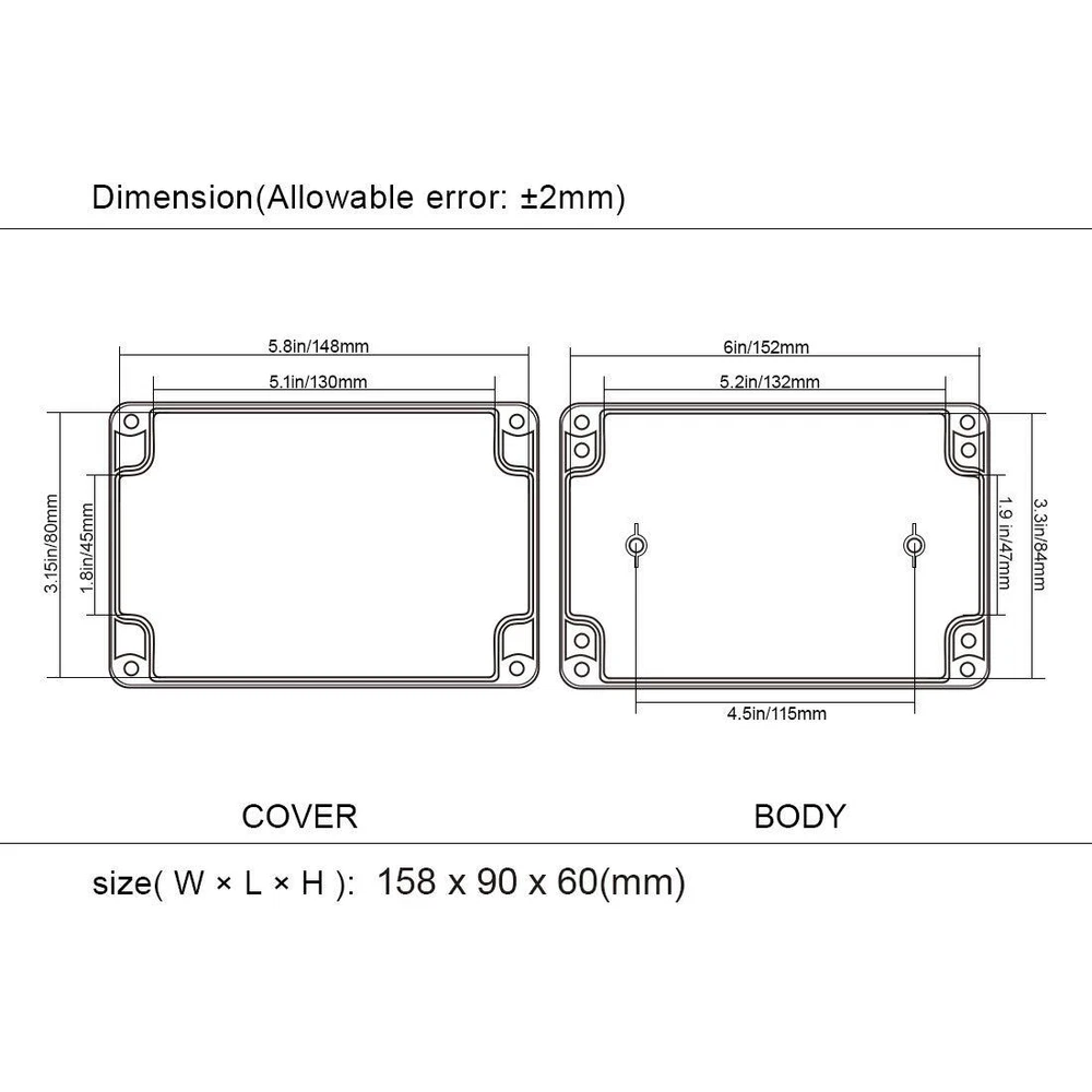 Exclusive Offers Await! Welcome to our stores! Satisfaction is what we guarantee. Project Box ABS Plastic Junction Box IP65 Waterproof Electrical Boxes Universal Enclosure Black 6.2X 3.5X 2.4 inch (158x90x60mm)(Pack of 1) Product Overview Description: This ABS project box brings a better customizable experience. 1.Made of ABS material. Sturdy and terrific for making those DIY projects. Easy to drill and shape openings for many items like meters, sockets, LEDs and so on. 2.Many screw holes inside in various places. If wanted to make one to go in it, such as attaching a board, there would be no problem mounting it. 3.100% brand new and high quality. Specifications: Product Name: Junction Box Outer Size of the black project box(Approx.): 6.2" x 3.5" x 2.4"/158 x 90 x 60mm(L*W*H) Inner Size of the black project box(Approx.): 5.9" x 3.3" x 2.1"(150 x 83 x 53mm)(L*W*H)- -*Tips: in order to confirm the detailed installation dimensions, please refer to our detail image, which shows specific internal dimensions of the product. (Allowable Error: 2mm) Main Color: Black Main Material: ABS Waterproof Rating: IP65 Package Include: 1 x Junction Box 1 x Rubber Grommet 4 x Screws(Not Rustproof) Key Features IP65 Waterproof: project box is designed to provide protection against moisture, water, and dust.Equipped with rubber grommet sealing tightly to ensure electrical components dry and effective in wet or harsh environments. High-quality Material: ABS plastic junction boxes are able to withstand impact, heat, and various weather conditions. Lightweight and durability make them easy to drill, modify and serve for long time. Versatile Enclosure: These electrical boxes are well-suited for indoor and outdoor LED displays, control panels, solar power systems,surveillance cameras, security systems etc. Also a convenient solution for DIY projects and hobbyists. Outer Size: 6.2 x 3.5 x 2.4inch(158 x 90 x 60mm);Inner Size: 5.9 x 3.3 x 2.1inch(150 x 83 x 53mm)- - *Tips: in order to confirm the detailed installation dimensions, please refer to our detail image, which shows specific internal dimensions of the product. (Allowable Error: 2mm),Thickness: 0.12in/3mm Package Content: 1 x Junction Box, 1 x Rubber Grommet ,4 x Metal Screws Payment Information ★ Secure payments through eBay. ★ We accept PayPal and all major credit cards. ★ Immediate payment required upon purchase. ★ For any payment issues, please contact our support team. Shipping Information ★ Orders are shipped to the address provided during checkout. Please verify your address. ★ We process orders within 1 business day (excluding weekends and holidays). ★ Standard delivery time is 3-5 business days. ★ We use trusted carriers like UPS, FedEx, and USPS. ★ Shipping is only available within the contiguous United States. No shipping to Alaska, Hawaii, Puerto Rico, or PO Boxes. ★ If there are any shipping delays, please contact us for support. Return Policy ★ We offer a 30-day return policy. ★ If you are not satisfied with your purchase, you can return it within 30 days for a full refund. ★ Please contact us to obtain the return address before sending back any items. ★ Items must be returned in their original condition and packaging.