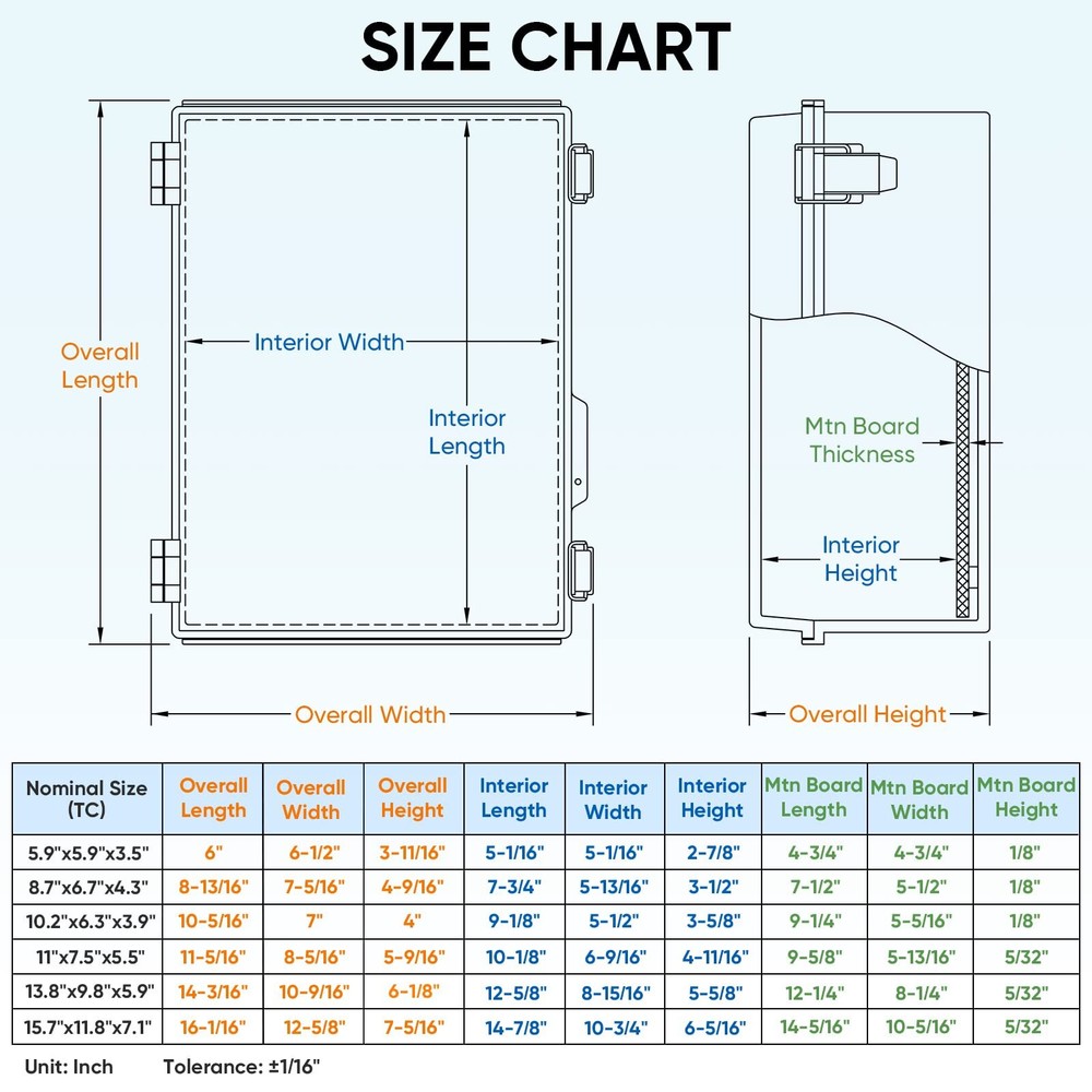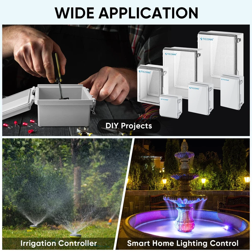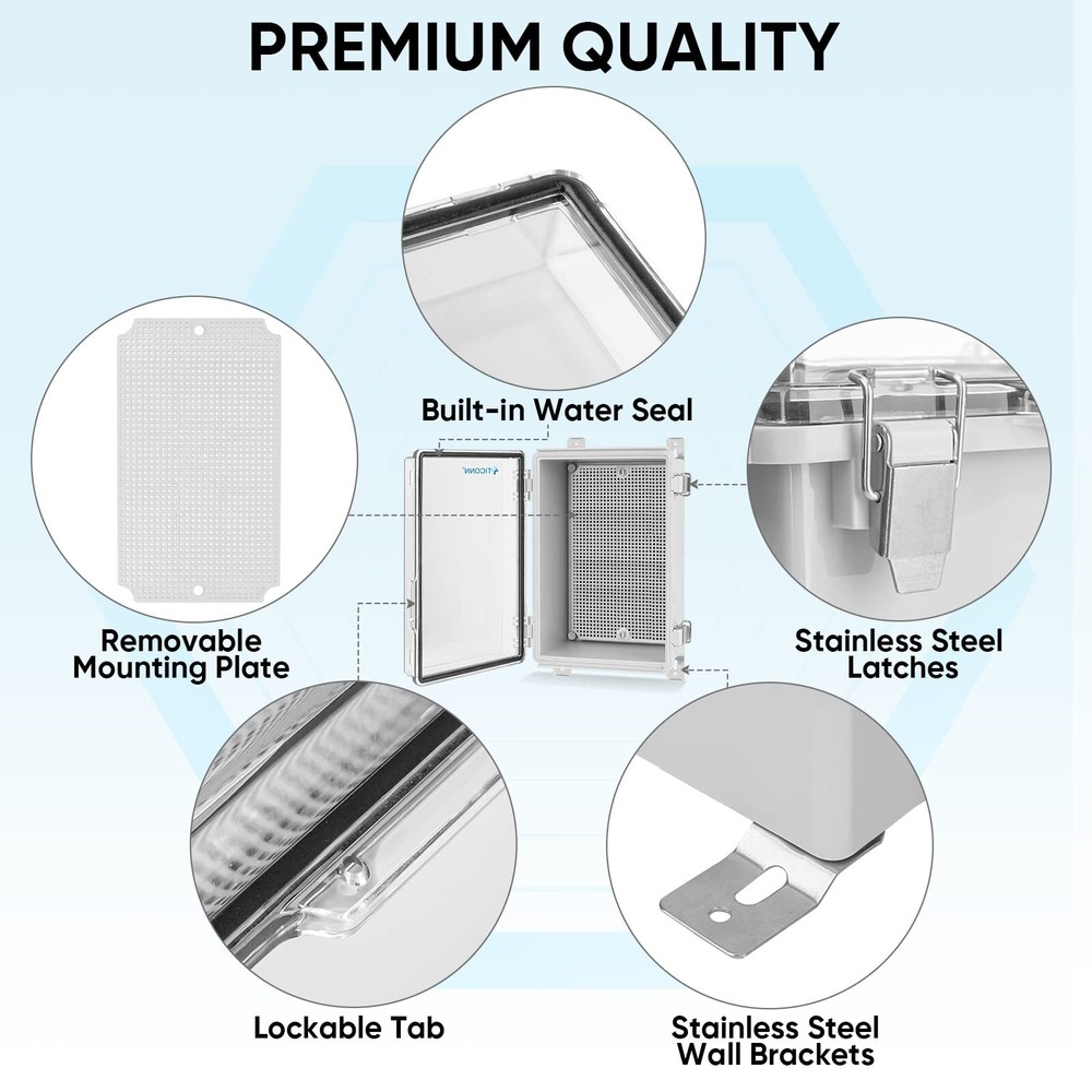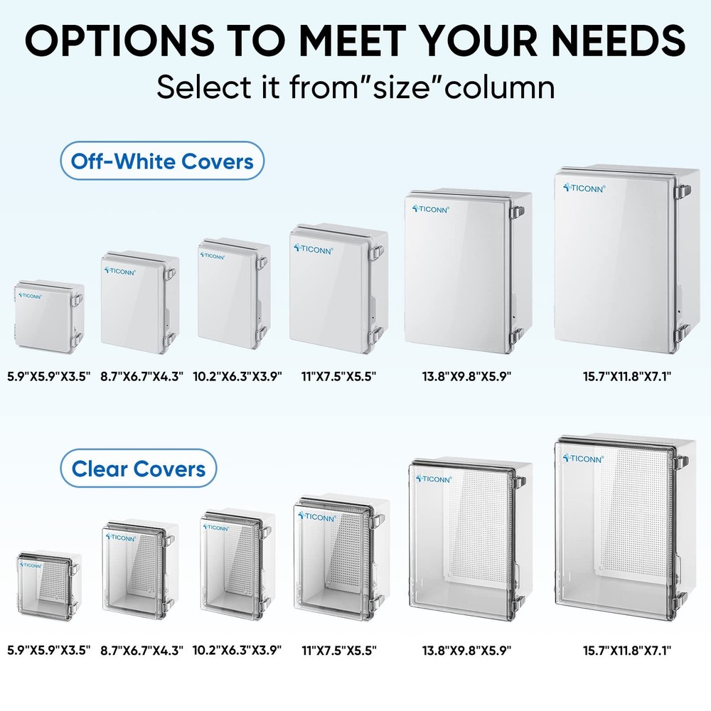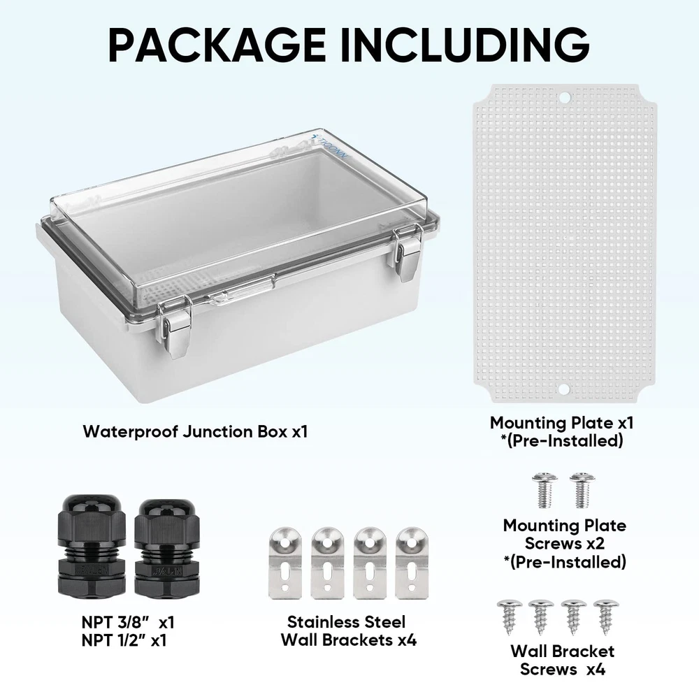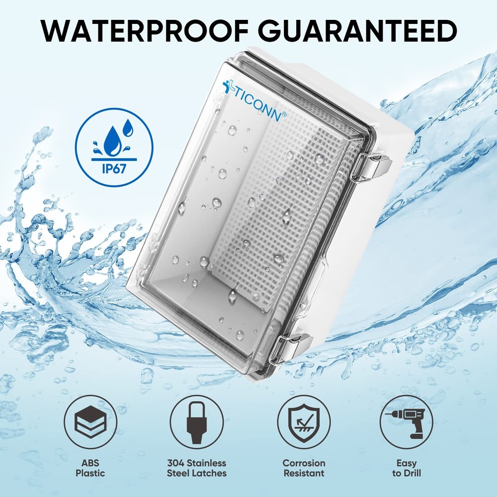 Waterproof Electrical Junction Box IP67 ABS Plastic Enclosure with Hinged Cov... Waterproof Electrical Junction Box IP67 ABS Plastic Enclosure with Hinged Cov... Product Overview TICONN Waterproof Electrical Junction Box IP67 ABS Plastic Enclosure with Hinged Cover with Mounting Plate, Wall Brackets, Cable Glands (Clear, 10.2"x6.3"x3.9") Key Features [PREMIUM QUALITY] TICONN electrical waterproof box is made from quality ABS plastic, which offers superb impact resistance and electrical insulation capability. Easy-to-operate door latches are made from 304 Stainless Steel [IP67 GRADE] The electrical box offers complete protection against water and liquids, up to and including immersion in up to one meter of water. Great for high humidity environment. [EASY TO MOUNT] The outdoor electrical box weatherproof comes with grid mounting plates that allow you to mount your board or device in the waterproof plastic box easily. A 3/8" NPT and a 1/2" NPT cable gland are included in case you need to feed wires outside. 4 stainless steel mounting brackets can be used to hang the box on walls or fences. [WIDE APPLICATIONS] We offer multiple sizes of weatherproof electrical boxes to meet your needs. Great for sprinkler control, lighting control, and other smart home DIY projects. [TICONN BRAND QUALITY COMMITMENT] We stand behind the quality of our products. If for any reason you are not satisfied with your purchase, please contact us. We provide 30-day money back and lifetime warranty. 100% Satisfaction Guarantee for risk-free shopping! Return Policy ⦿ You may return the item within 30 days. Contact us via eBay messaging for return instructions. ⦿ We guarantee your satisfaction. Any issues will be resolved promptly. ⦿ Free shipping and returns with a 30-day money-back guarantee. ⦿ Please contact us for the return shipping address. Shipping Information ⦿ We ship to the address provided on eBay. Please ensure it is accurate. ⦿ Standard delivery time is 3-5 business days. ⦿ We use reputable shipping services such as UPS, FedEx, and USPS. ⦿ Currently, we ship only within the 48 contiguous states of the USA. ⦿ For any shipping concerns, feel free to contact us. Customer Support ⦿ For any inquiries, please contact us via eBay messaging. We typically respond within 24 hours. ⦿ Customer satisfaction is our top priority. ⦿ If you encounter any issues, please contact us before leaving feedback, and we will do our best to resolve them. About Us We are committed to providing high-quality products at competitive prices, ensuring that our customers receive the best value. Our team is dedicated to delivering exceptional customer service and a seamless shopping experience. With years of experience in the industry, we have established strong relationships with suppliers, enabling us to offer a diverse range of products. We continuously strive to expand our product selection and improve our services to exceed customer expectations. Our mission is to achieve 100% customer satisfaction by addressing any concerns promptly and effectively. Thank you for choosing our store. We look forward to serving you again and making your shopping experience delightful.