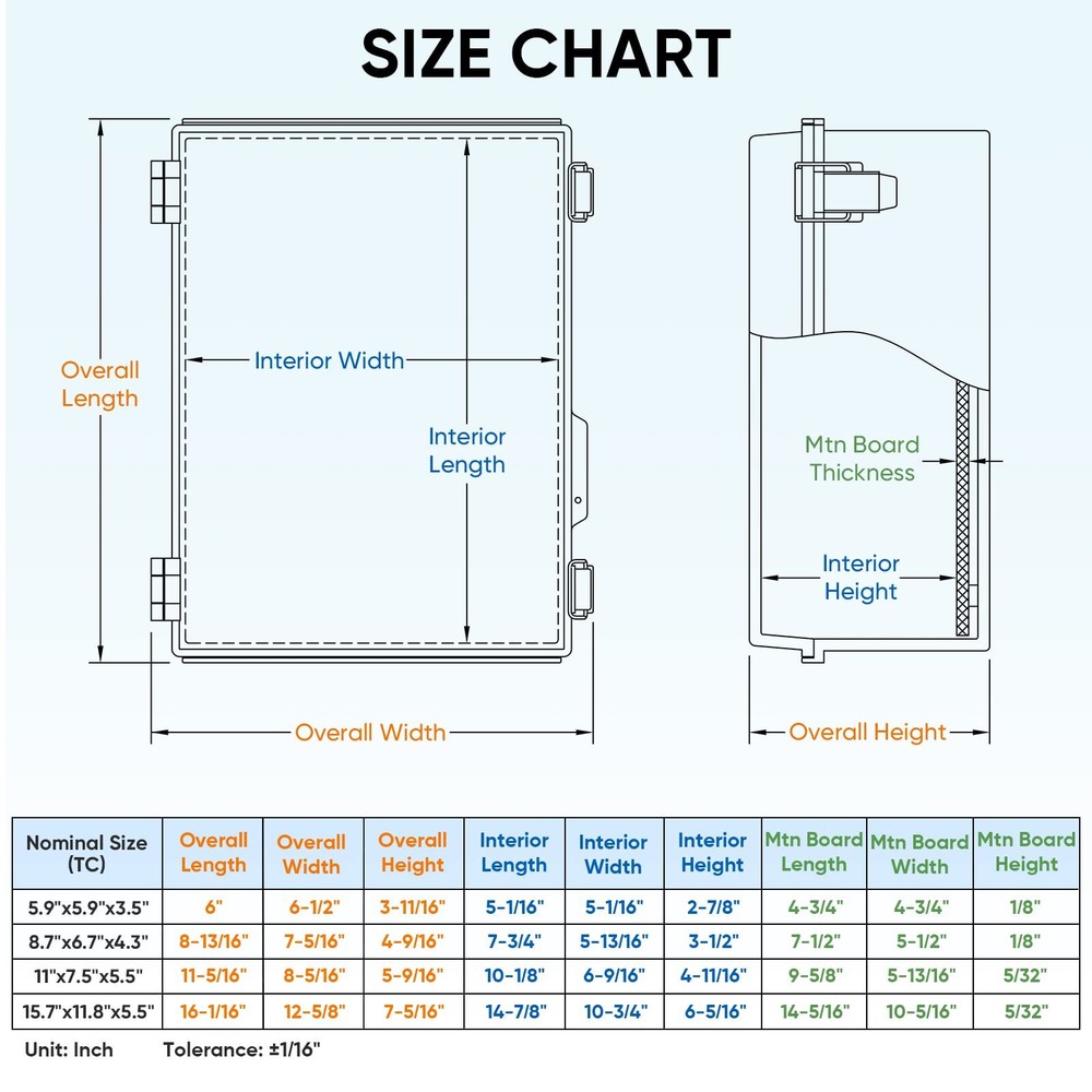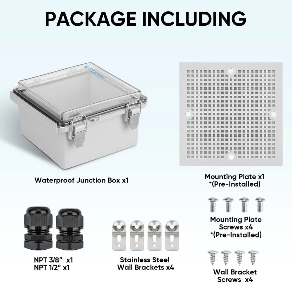 Waterproof Electrical Junction Box IP67 ABS Plastic Enclosure with Hinged Cover with Mounting Plate, Wall Brackets, Cable Glands (Clear, 5.9"x5.9"x3.5") PRODUCT DESCRIPTION PRODUCT FEATURES [PREMIUM QUALITY] electrical waterproof box is made from quality ABS plastic, which offers superb impact resistance and electrical insulation capability. Easy-to-operate door latches are made from 304 Stainless Steel [IP67 GRADE] The electrical box offers complete protection against water and liquids, up to and including immersion in up to one meter of water. Great for high humidity environment. [EASY TO MOUNT] The outdoor electrical box weatherproof comes with grid mounting plates that allow you to mount your board or device in the waterproof plastic box easily. A 3/8" NPT and a 1/2" NPT cable gland are included in case you need to feed wires outside. 4 stainless steel mounting brackets can be used to hang the box on walls or fences. [WIDE APPLICATIONS] We offer multiple sizes of weatherproof electrical boxes to meet your needs. Great for sprinkler control, lighting control, and other smart home DIY projects. [BRAND QUALITY COMMITMENT] We stand behind the quality of our products. If for any reason you are not satisfied with your purchase, please contact us. We provide 30-day money back and . 100% Satisfaction Guarantee for risk-free shopping! π SHIPPING We offer fast and reliable shipping. Your order will be processed within 1-2 business days. International shipping is available to most countries. All items are securely packaged to ensure safe delivery. π RETURNS If you are not satisfied with your purchase, you can return it within 30 days for a full refund. Refunds will be processed to your original method of payment. Items must be returned in their original condition and packaging. π³ PAYMENT We accept payment via PayPal, credit cards, and other payment methods supported by eBay. Please ensure your payment method is correct and updated to avoid any delays in processing your order. β FEEDBACK We value your feedback. If you are happy with your purchase, please leave us a positive review. π CONTACT US If you have any questions or need further assistance, please feel free to contact us through eBay messages.