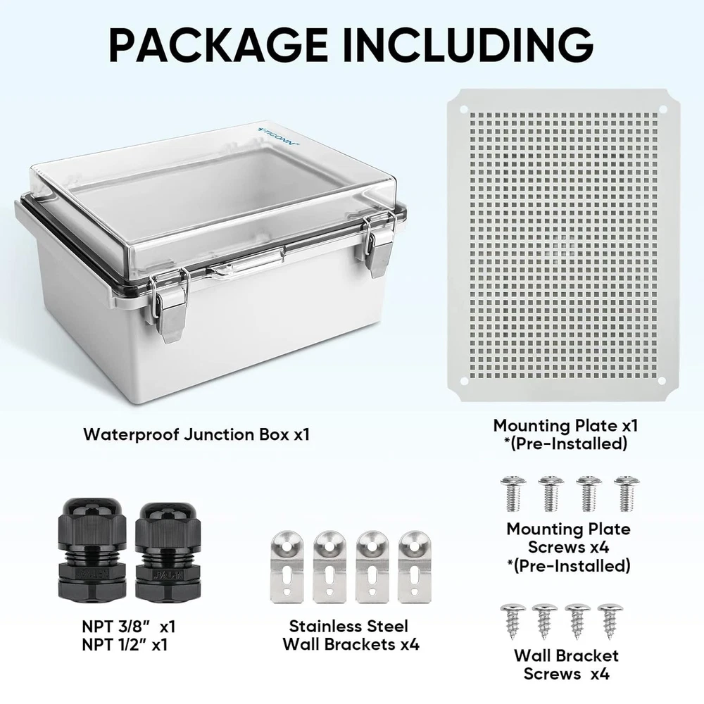 Waterproof Electrical Junction Box IP67 ABS Plastic Enclosure with Hinged Cover with Mounting Plate, Wall Brackets, Cable Glands Clear, """ [PREMIUM QUALITY] electrical waterproof box is made from quality ABS plastic, which offers superb impact resistance and electrical insulation capability. Easy-to-operate door latches are made from 304 Stainless Steel [IP67 GRADE] The electrical box offers complete protection against water and liquids, up to and including immersion in up to one meter of water. Great for high humidity environment. [EASY TO MOUNT] The outdoor electrical box weatherproof comes with grid mounting plates that allow you to mount your board or device in the waterproof plastic box easily. A 3/8" NPT and a 1/2" NPT cable gland are included in case you need to feed wires outside. 4 stainless steel mounting brackets can be used to hang the box on walls or fences. [WIDE APPLICATIONS] We offer multiple sizes of weatherproof electrical boxes to meet your needs. Great for sprinkler control, lighting control, and other smart home DIY projects. [ product QUALITY COMMITMENT] We stand behind the quality of our products. If for any reason you are not satisfied with your purchase, please contact me. We provide and satisfaction. 100% Satisfaction SATISFACTION GUARANTEE for risk-free shopping!
