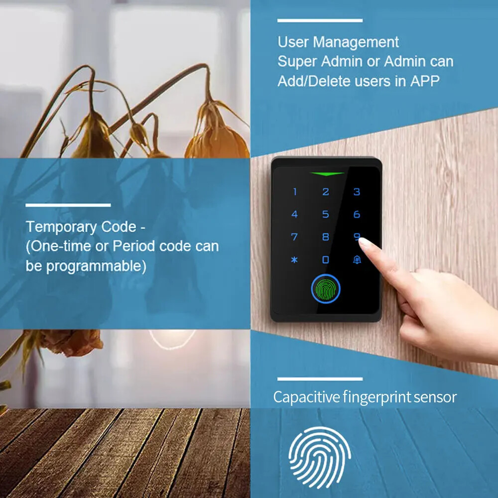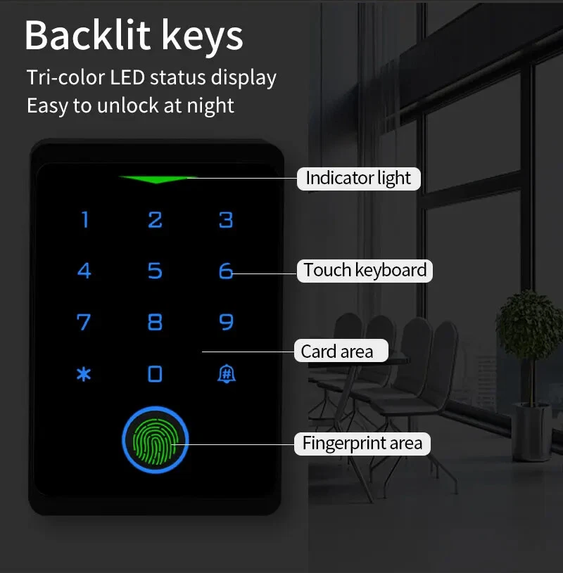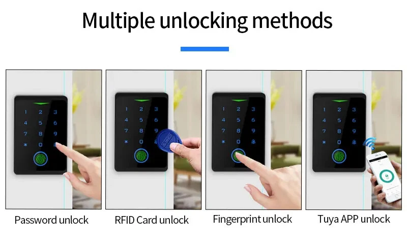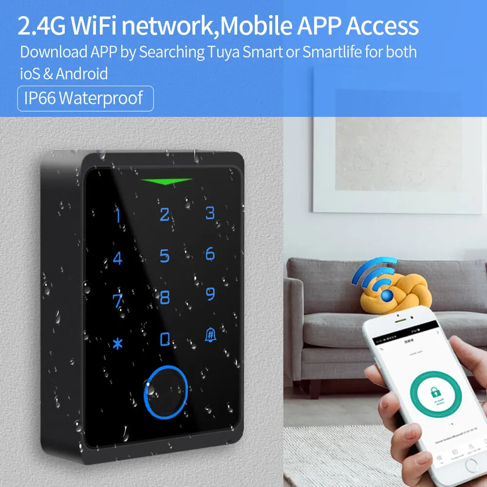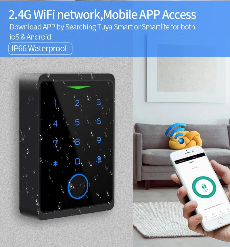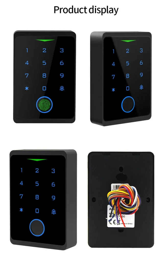 Product sellpoints Tuya APP Integration:Seamless smart home integration with Tuya APP for easy access control and management. High User Capacity:Accommodates up to 1000 users, including 990 common users and 10 visitor users. Electronic Door Lock With Key Fob|Fingerprint Door Lock External|IP66 Waterproof Grade:Engineered for durability, this lock withstands harsh weather with its IP66 waterproof rating. Multiple Access Modes:Supports fingerprint, PIN, and RFID card access, offering versatile entry options. Wireless Connectivity:Enjoy the convenience of 2.4G WiFi connectivity for remote access control. Tuya APP Door Lock IP66 Waterproof Keyless Fingerprint WIFI Access Control Standalone Keypad Fingerprint EM RFID Card Door Entry Note : CF1-EM-WIFI has no doorbell cables and no funtion for connection to external doorbell CF1-EM-WIFI Economic Touch Fingerprint Keypad > material:ABS plastic material > One relay, 1000 users (990 common users+10 visitor users) > Fingerprint Touch keypad, PIN length:4~6 digits > Card Type:125KHz EM > Wiegand 26 bits output > Wiegand 26/34 bits input automatic identification > Backlit keypad,can set automatic OFF after 20 seconds > IP66 Waterproof version >The standard version is 125khz ID EM version