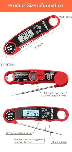 Digital Meat Thermometer with Bottle Opener - Waterproof Magnetic Instant Red Product Details Package Dimensions : 6.61 x 2.83 x 0.91 inches; 3.21 ounces Item model number : SHELVIN03 Batteries : 1 CR2032 batteries required. (included) Manufacturer : Shelvin Country of Origin : China Brand: Shelvin Special Feature: Waterproof, Backlit, Fast Reading System, Auto Off, High Accuracy Color: Red Age Range (Description): Adult Included Components: Bottle Opener Outer Material: Plastic Display Type: Digital Unit Count: 1.0 Count Power Source: Battery Powered Model Name: Red Digital Food Thermometer Accurate, Instant Read Meat Thermometer: 3-2-1! Know the exact temp of any meat in just three seconds flat. With blazing-fast results and accuracy within +/- 2 degrees, you’ll grill up juicy filets, tender turkey or succulent salmon for the perfect doneness every time. Bright LED Display: “Honey, is this a zero or an eight?” No need to squint or ask your better half for help. Our kitchen thermometer displays digits in a bright, backlit window for easy reading. With large print and crisp clarity, one quick glance is all you need. Built-in Bottle Opener: Steak and ice-cold beer? You can’t beat it! That’s why we included a bottle opener in our grill thermometer (as if it wasn’t awesome already). Now you can knock back a cold one while searing mouthwatering steaks, ribs, lamb, fish or pork chops. Waterproof Food Thermometer: You don’t need a raincoat, and neither does your steak thermometer. Armed with a waterproof cooking thermometer, you’ll keep the BBQ morsels coming, rain or shine. From stormy weather to boiling water, our thermometers handle it all. Auto On/Off Function: This digital thermometer for cooking couldn’t be easier to use. Just flip open the meat thermometer probe to turn on, and flip shut to turn off. Even if you forget, the 10-minute auto-shutoff means you won’t drain the batteries. Now that’s a grilling game-changer!