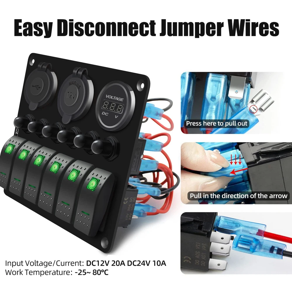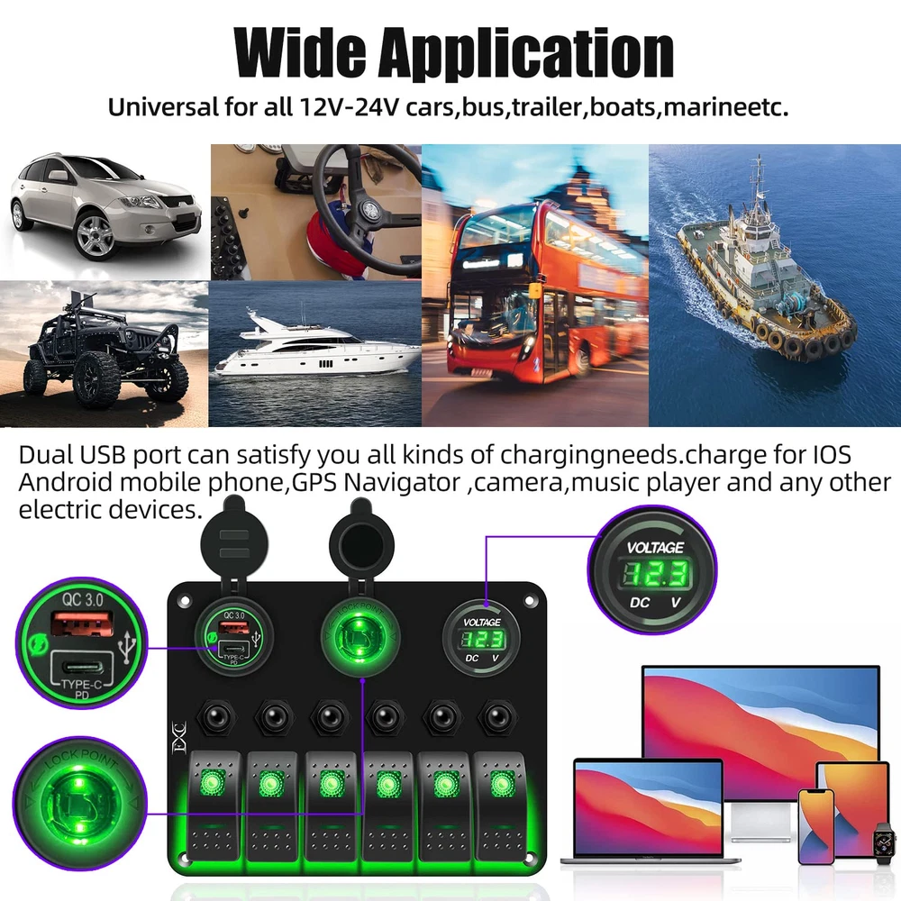 Store New Arrivals Add to Favorite View Feedback Contact Waterproof Marine Boat Rocker Switch Panel 6 Gang with QC3.0 USB & Type-C Slot Socket + Cigarette Lighter +LED Voltmeter with Overload Protection for Car Rv Vehicles Truck (6 Gang Green LED) Description Item dimensions L x W x H 7.1 x 3.4 x 5.4 inches Current Rating 15 Amps Operating Voltage 24 Volts Mounting Type Panel Mount Color Green Product Dimensions 7.1 x 3.4 x 5.4 inches; 1.23 Pounds Connector Type Usb Terminal Marine Operation Mode Off Actuator Type Rocker Contact Type Normally Open Switch Type Rocker Material Abs,Aluminum,Rubber 【6 Gang Green LED Lights Switch】 Rocker Switch + Rubber cover for USB port and cigarette slot, premium aluminum panel make it stronger. 【Votage meter & Dual USB Ports】 Working Voltage DC12V/24V, Output: DC 5V QC3.0 USB & Type-C 【Multi-Protection, More Secure】 Circuit breakers for each switch seperately for short circuit protection, overload protection, reverse polarity protection, and multiple protection, more secure to use, very convenience for driving. 【Applicable Widely】Designed for controlling all car devices for on / off, fits for all 12/24V Vehicles Boats Yacht Cruises Speedboat Cockpit Bus Rvs Jeep SUV Lorry Truck. 【Top service】With our strict quality control system, we test each item and 100% ensure in good condition before we ship. Enjoy 1 year quality warranty under regular use. Offering customer technical service, feel free for any questions about products technology, installation and use. Product Description FXC 6 Gang Rocker Switch Panel with Overload Protection FXC Multi-Functional Waterproof 6 Gang Switch Panel LED Backlit: Blue/Red/Green Material: Aluminum Plate; Switch: ABS + PC Voltmeter Display range: DC 6V- 30V PD Type C and USB Socket Output:5V DC; 3.1A Cigarette Lighter: DC 12V Reset Circuit Breakers: Each 15A Switch Type: SPST: ON-OFF Installation: Pre-wired Over Load Protection There are 6PCS 15A circuit breaker on the panel. Working Principle: this switch can be reset after a disconnect over a period of time, then you can press the reset switch to use it again When load exceeds rated current, the switch reset button will automatically cut off the circuit, and thus play a role in protecting the line. Product details 3.0 USB ports + Type C ports Material: ABS plastic(flame resistant) Input voltage: 12-24V DC Output voltage: 5V DC Output current: 6.2A (3.1A + 3.1A) LED Voltmeter Material: ABS plastic(flame resistant) Working range:12-24V DC You can now monitor the battery voltage in real time. Cigarette lighter socket Material: ABS plastic(flame resistant) Input voltage: 12 - 24V DC Output voltage: 12V DC On/Off (SPST) rocker switch DC 12V 20A DC 24V 10A Material: ABS plastic(flame resistant) Mechanical Life: switch 50000 times Pre-wired This switch panel is pre-wired in series in all components. This make the wiring become easily. Easy to connect or disconnect Just plug for connection; Press the buckle and pull for disconnection. ABOUT US We offer the best prices around on high quality products. Our E-store includes media such as books, movies, music and games while offering electronics, toys, sporting apparel, clothing, tools, general home, garden items and more. SHIPPING We are always working hard to ensure your package arrives as soon as possible. Please understand that some factors like weather, high postal traffic, and the performance of shipping companies are outside of our control. We offer free shipping to the lower 48 states and ship within 2 business days of payment, usually sooner. We do not accept P.O. Boxes. Please provide a physical address. For shipping outside of the continental USA, we only use eBay's Global Shipping Program.The item is shipped to KY and then sent to the rest of the world. International customers are responsible for all duties and taxes. Continue to check out in order to calculate costs for shipping the item to your country. Messages regarding eBay's Global Shipping Program MUST be directed at eBay EXCLUSIVELY. RETURNS We offer a 30-Day Return Policy on items which you are not completely satisfied with. You have the option for a full-refund or an exchange of the item. No returns are available on items shipped outside of the USA. PAYMENT We accept PayPal. CONTACT US This page content is yet to come Please ad us to your favorite seller and visit again later Thank You CUSTOMER SATISFACTION We try our very best to make sure every customer is completely satisfied. If there's a problem, message us! We're happy to help. WE ACCEPT Copyright © 2021 AutoDS. | All Rights Reserved
