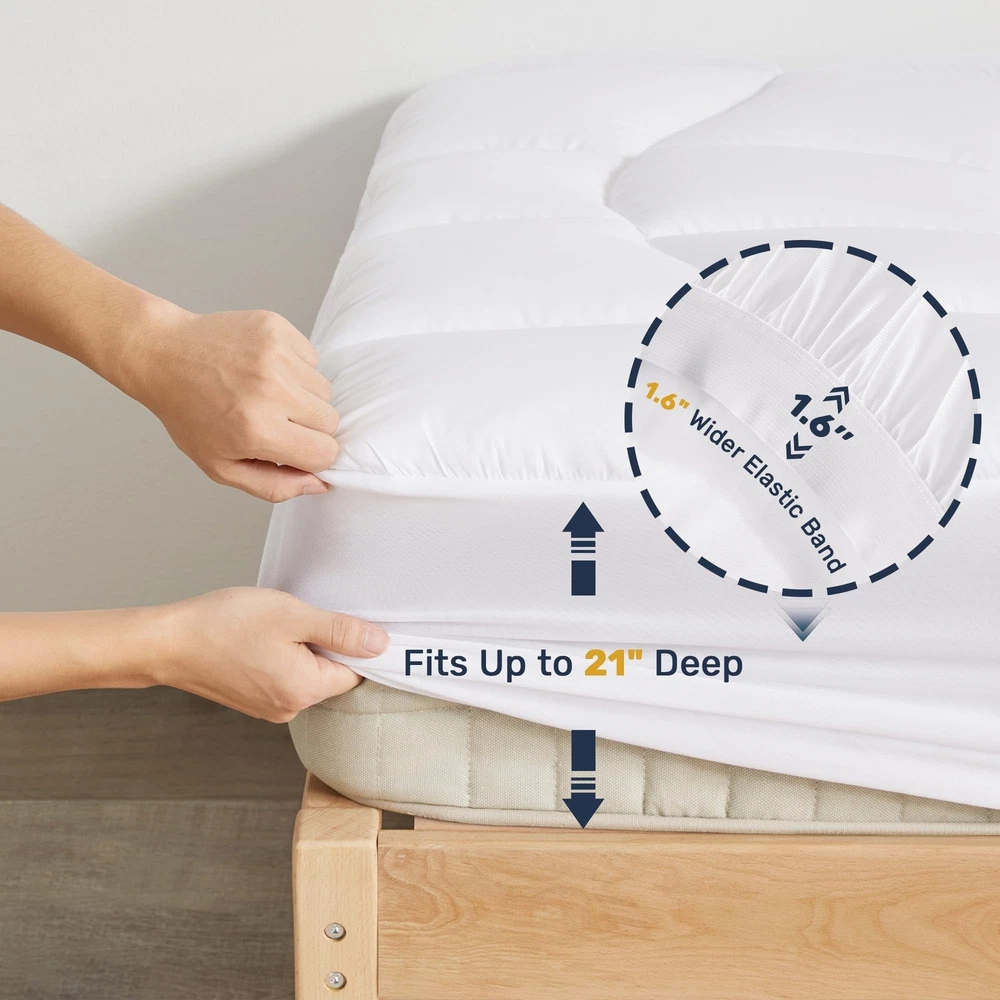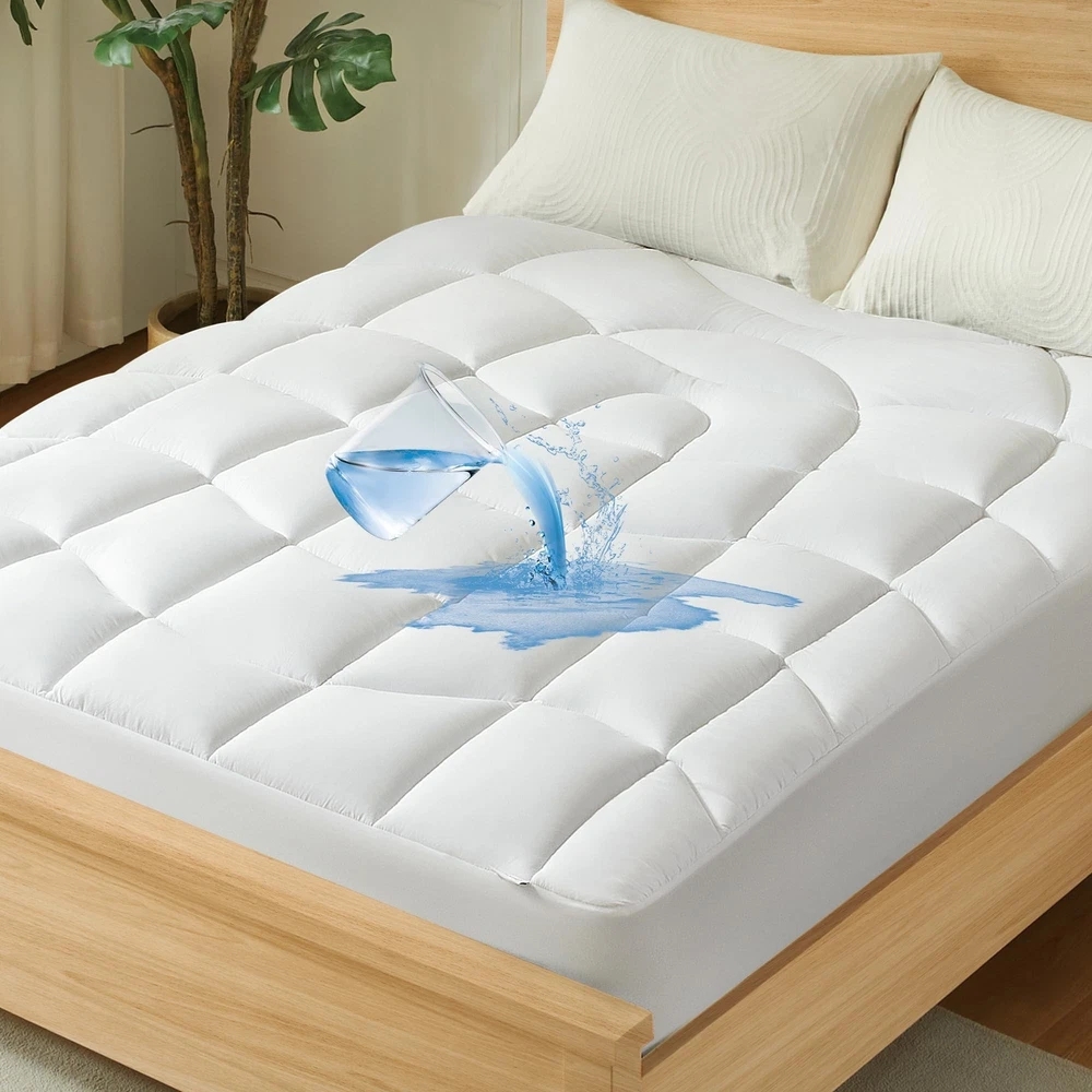 Waterproof Mattress Pad Queen - Ergonomic Quilted Fitted Thick Queen Mattress Topper, 5-Layers Noiseless Washable Mattress Protector Cover with 8"-21" Deep Pocket (White, Queen, 60x80) Product Details Color: White Size: Queen Brand: UNIKOME MPN: A-UN-MP61033WT-Q UPC: Does not apply EAN: Does not apply Brand: UNIKOME Color: White Size: Queen Fabric Type: Microfiber Special Feature: Quilted, Water Proof, Washable, Moisture-Wicking Brand: UNIKOME Color: White Size: Queen Fabric Type: Microfiber Special Feature: Quilted, Water Proof, Washable, Moisture-Wicking Closure Type: Pull On Product Care Instructions: Machine Wash Water Resistance Level: Waterproof Age Range (Description): All Ages Material: Microfiber Number of Items: 1 Manufacturer: UNIKOME Product Dimensions: 60 x 80 x 15 inches Item Weight: 5.72 pounds Country of Origin: China Date First Available: September 13, 2024 Ergonomic Comfort: Experience ultimate comfort with our ergonomically quilted queen mattress pad. Its specially designed-stitching contours your body, providing gentle support that soothes muscles and eases tension. Enjoy a relaxing sleep environment with our white queen mattress topper that helps reduce stress, waking you up refreshed and recharged every morning. Five-Layer Design: Our 5-layer waterproof mattress pad queen offers the perfect balance of comfort and durability. The breathable microfiber surface keeps you cool, while the soft, supportive Blended fillings provide plushness without sacrificing support. An extra sturdy base upgraded waterproof TPU layer, and quiet knit fabric ensure lasting protection and a peaceful nights sleep. Quiet Waterproofing: Stay comfortable and protected with our waterproof mattress topper queen, designed for a peaceful and restful sleep. The advanced 100% waterproof layer keeps spills and stains at bay without the crinkling sounds of traditional waterproofing so you can enjoy a quiet, undisturbed night in soft, cozy comfort with our queen mattress protector waterproof. Perfect Fit: Our white mattress pad queen size offers a secure and convenient fit with its 360 full-wrap design and deep pockets that accommodate mattresses up to 8"-21" thick. The 1.6" high-elastic, extra-wide straps ensure a snug, slip-free fit, making installation a breeze. Our queen mattress cover is available in a complete range of sizes to perfectly complement any bed. Easy Care: Our queen size mattress protector is simple to care fortoss it in the washing machine on a gentle cycle with cold water. Tumble dry on low heat (below 105F). Do not dry clean, iron, or use bleach. Since it's vacuum-packed, allow the queen size mattress toppers to air out for at least 12 hours to fluff up.