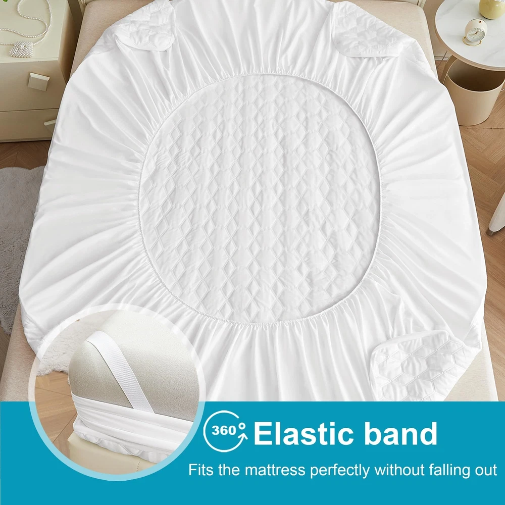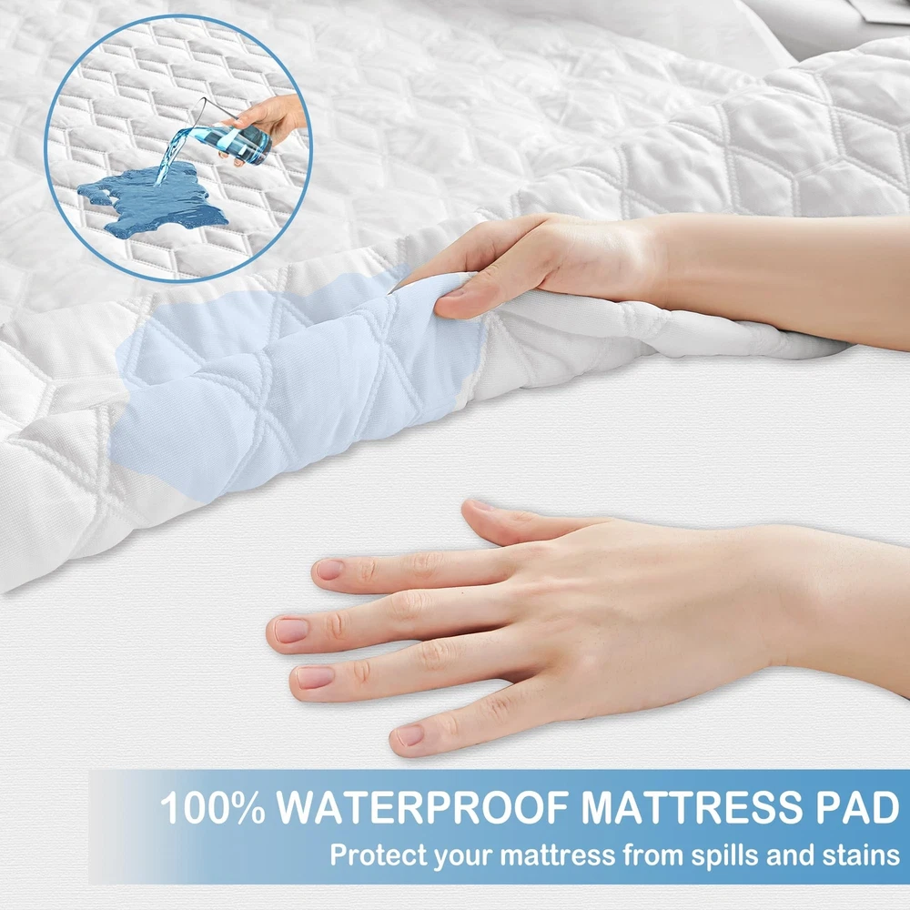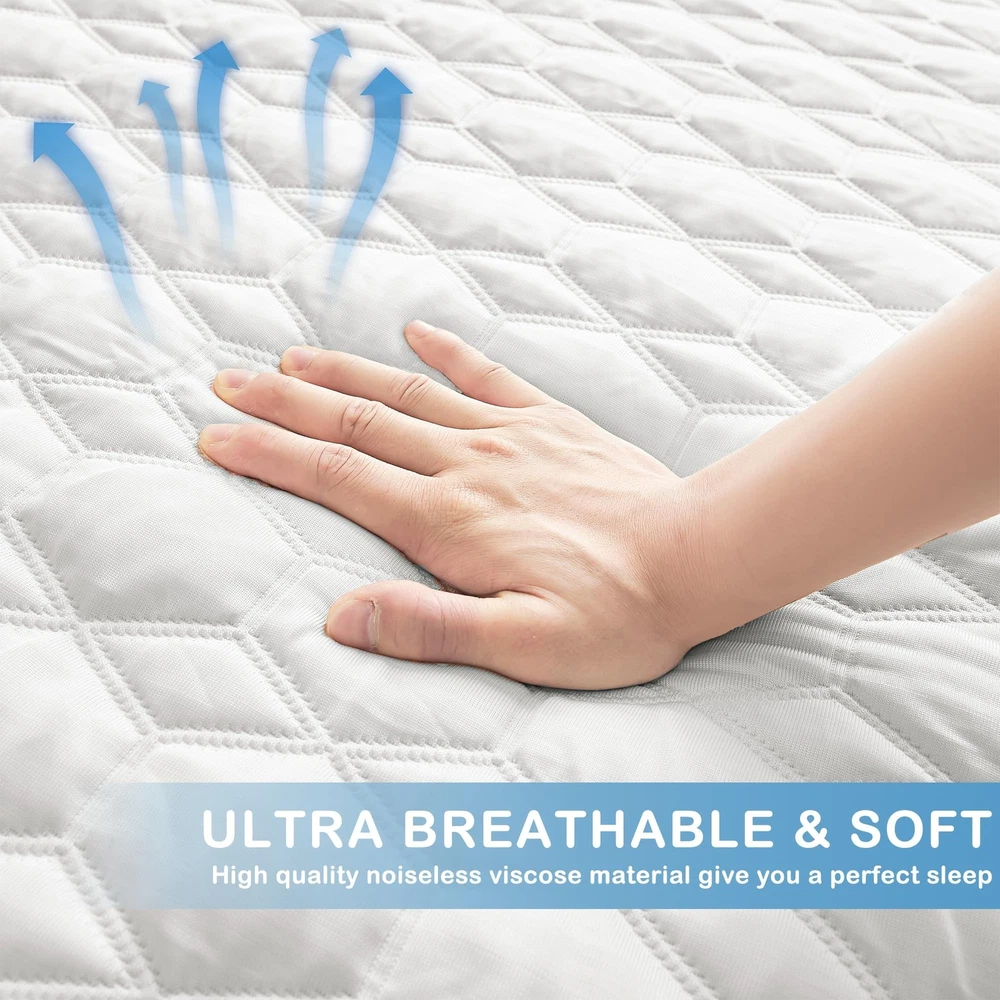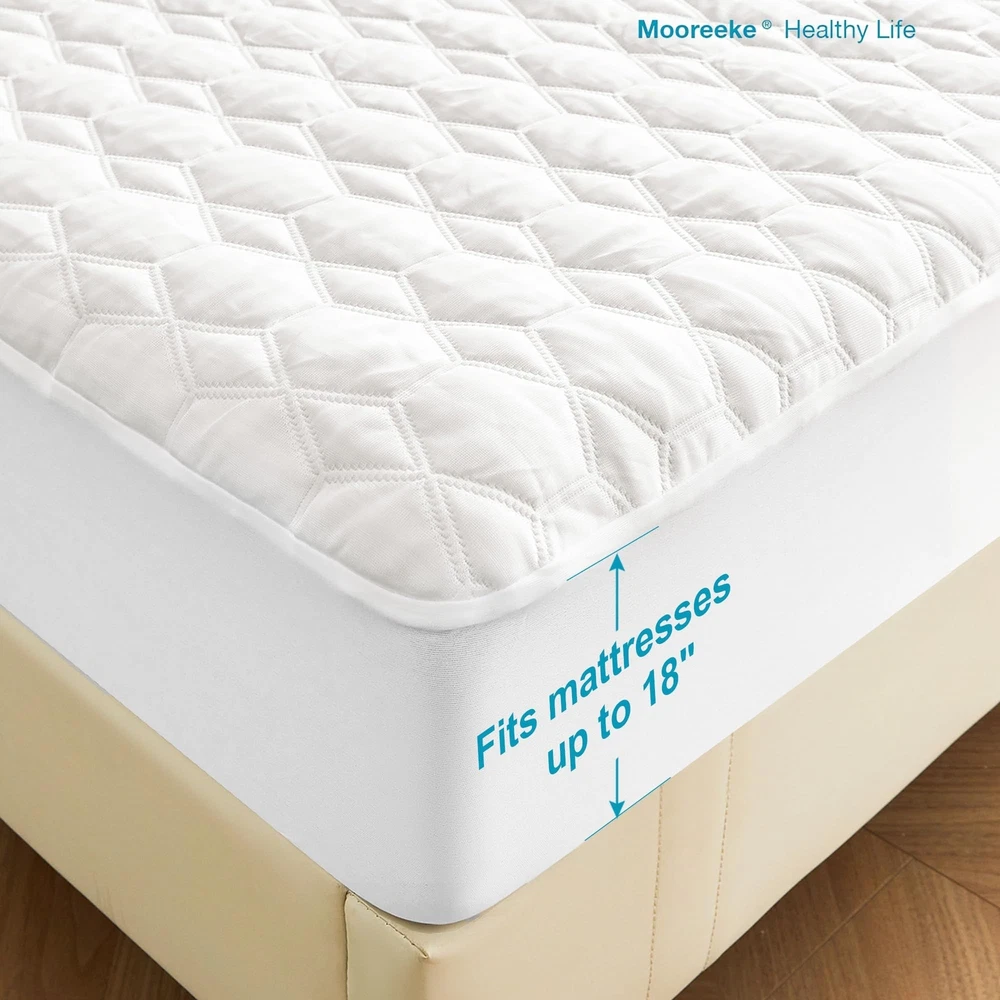 Waterproof Mattress Protector Queen Size, Premium Cooling Mattress Pad Mattress Protector for Hot Sleepers, Ultra Soft & Breathable Fitted Mattress Cover with 18” Deep Pocket Product Details Size: Queen Style: Cooling Ice Silk Brand: Mooreeke MPN: Does not apply UPC: Does not apply EAN: Does not apply Brand: Mooreeke Color: Light Gray/White Size: Queen Fabric Type: Bamboo,viscose Special Feature: Cooling, Water Proof, Breathable Brand: Mooreeke Color: Light Gray/White Size: Queen Fabric Type: Bamboo,viscose Special Feature: Cooling, Water Proof, Breathable Closure Type: Pull On Product Care Instructions: Machine Wash Water Resistance Level: Waterproof Age Range (Description): Adult Material: Bamboo Viscose with Cooling and Waterproof Properties Number of Items: 1 Manufacturer: Mooreeke Product Dimensions: 12.52 x 12.01 x 5.43 inches Item Weight: 4.66 pounds Date First Available: May 15, 2023 Breathable and Cooling Mattress CoverEnjoy a comfortable night's sleep like never before with our ultra-soft and cooling mattress protector. Made from luxurious ice silk cool viscose fiber, this mattress cover is even more cooling than bamboo and is perfect for people who tend to sleep hot. 100% Waterproof and Soft Mattress PadOur mattress pad is quilted with an upgraded TPU membrane to ensure a high-quality waterproof seal. Say goodbye to annoying, wrinkled plastic feel and enjoy a perfect night's sleep, even if you have kids or pets. Elastic Band Design for Secure FitOur queen size mattress pad fits 60x80" and boasts high elasticity and durability with a 360 degree wrapping that won't fall off easily, featuring an elastic band to keep your mattress securely in place for a perfect fit up to 18" deep pocket. Noiseless Design for Peaceful SleepNo more disruptive noise from your mattress protector! Our soft queen mattress cover ensures a peaceful and restful sleep every night. Machine Washable and Top-Rated Satisfaction GuaranteeOur mattress protector is machine washable for easy cleaning and comes with our top-rated satisfaction guarantee for pre-sale and after-sale service. Contact us if you're not 100% satisfied.