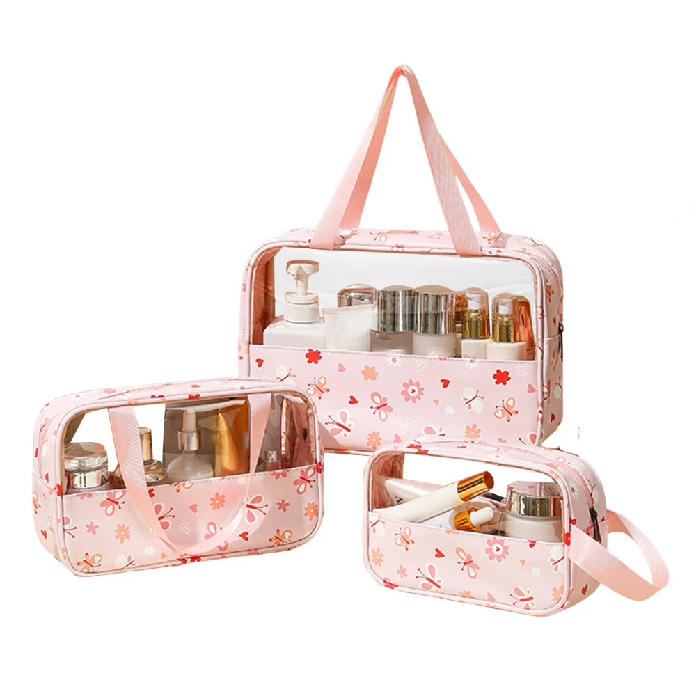 Features: Versatile Clear Cosmetic Bag: This 3-piece set includes a portable makeup bag, skincare wash bag, and large capacity beauty organizer, ideal for storing cosmetics, toiletries, and skincare essentials on the go. Water-Resistant Design: Made of durable pvc material, this makeup bag is water-proof and easy to clean, ensuring your beauty products stay dry and organized while traveling. Secure Zipper Closure: The travel cosmetic pouch features a sturdy zipper closure to keep your items secure and prevent spills or leaks, making it a practical and convenient choice for daily use. Thoughtful Gift Idea: This cosmetic bag set makes a perfect gift for girlfriends, or anyone who loves beauty and organization, offering a stylish and functional solution for small items storage management. Practical and Stylish: With its transparent design and spacious compartments, this clear cosmetics bag combines practicality with style, allowing you to easily find and access your while on the move. Specification: Material: PVC Size: 29.5*21cm, 12*21cm, 26*16cm Notes: Please allow slight tolerances in size due to manual measurement, and lighting in photography may result in a difference in color than in real. Package includes: 3*Cosmetic Bags