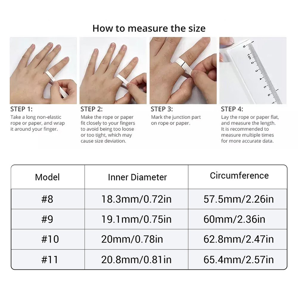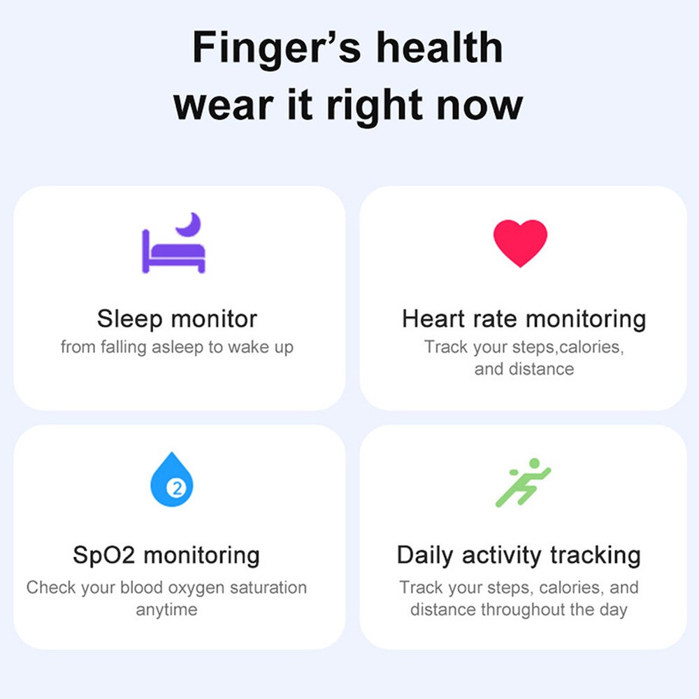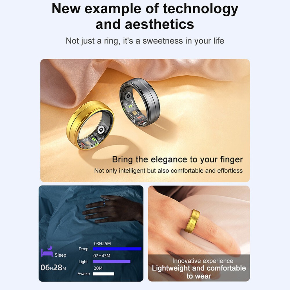 Product Description R06 Waterproof Sport Smart Ring Health Monitoring Heart rate sleep monitoring Features: - Premium Materials & Comfort: Crafted from high-quality materials, this smart ring is lightweight and comfortable for all-day wear. Its compact design makes it easy to carry, perfect for travelers who want to stay connected and secure. - Waterproof Technology: With a 5ATM rating and a fully sealed design, this smart ring handles daily water activities like swimming, handwashing, and rain with ease. *Note: Rinse after bathing to prevent skin irritation from product residue. - Comprehensive Health Tracking: This smart ring monitors steps, distance, calories burned, heart rate, oxygen levels, stress, and sleep patterns, with multiple exercise modes to choose from for a complete health overview. - Long Battery Life: With 5-7 days of use and 15 days of standby, this smart ring is ideal for frequent travelers and outdoor enthusiasts, ensuring continuous health monitoring wherever you go. - Perfect Gift: Stylish and versatile, this smart ring is compatible with various devices, making it a thoughtful gift for loved ones, friends, or colleagues, suitable for any occasion like birthdays, anniversaries, or holidays. Specifications: Chip: RF03 Certification: ce Chip: RF03 Application: QRing Compatible system: Android 5.1 (included) and above, IOS 8.0 (included) and above FLASH memory: RAM208KB FLASH 512KB BT: 5.0 Low Energy Bluetooth Compatible Chip Acceleration Sensor: Silicon Creation STK8321 Heart Rate: Vcare VC30F Battery Type: Polymer Lithium Ion Capacity: 15 mAh Charging method: magnetic charging APP software features: QRing: step count, sleep, heart rate, exercise data recording Health monitoring, blood pressure, blood oxygen measurement Multiple sports modes, taking pictures Waterproof grade: 5ATM Charging time: about 1 hour Life (time): 5-7 days of use, 15 days of standby Ring size inner diameter (mm): No. 8 18.3mm, No. 9 19.1mm, No. 10 20mm, No. 11 20.8mm Supported languages: Danish, Ukrainian, Russian, Croatian, Hungarian, Hindi, Indonesian, Turkish, Hebrew, Greek, German, Italian, Latvian, Czech, Slovak, Slovenian, Japanese, French, Polish, Thai, Estonian, Swedish, Lithuanian, Simplified Chinese, Traditional Chinese, Romanian, English, Dutch, Portuguese, Spanish, Vietnamese, Arabic, Korean, Malay Packaging includes: 1 x Smart Bracelet 1 x Charging cable 1 x User Manual powered by
