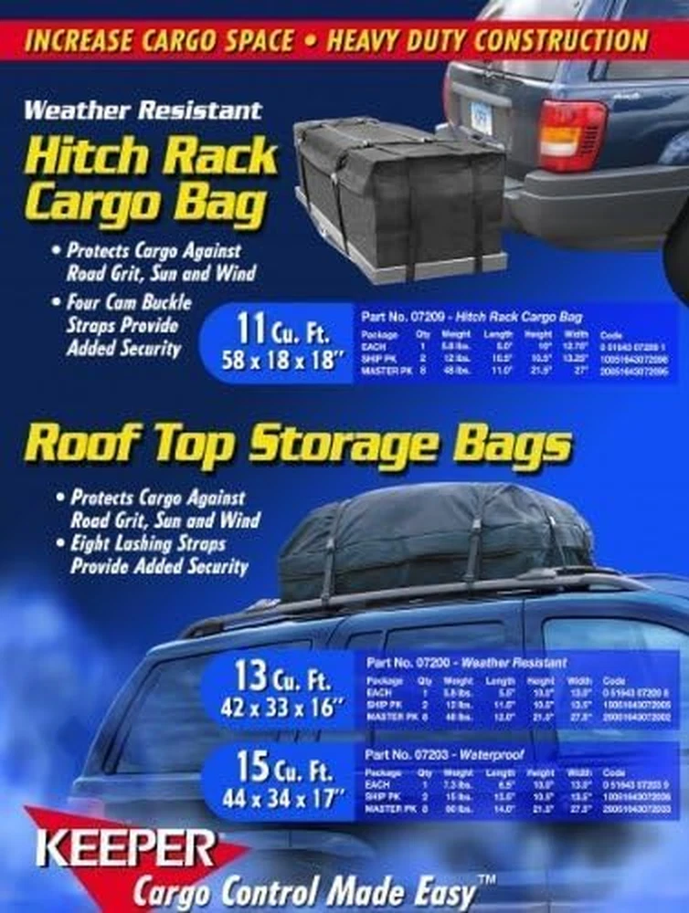 Store New Arrivals Add to Favorite View Feedback Contact - Waterproof Rooftop Cargo Bag, 15 Cubic Feet Description Item model number 7203 Item Weight 5 Pounds Mounting Type Roof Mount Item Volume 15 Cubic Feet Shell Type Soft Product Dimensions 44"L x 34"W x 17"H Material Rubber Water Resistance Level Waterproof Manufacturer Part Number 7203 Product Packaging Standard Packaging Global Trade Identification Number 00051643072039 Color Black Model 7203 Is Discontinued By Manufacturer No Protect Your Cargo: Keeper Roof Top Cargo Bag features 15 cubic ft. to protect and secure cargo loads from road grit, sun, wind and rain. Measurements: This cargo bag measures approximately 44 in. x 34 in. x 17 in. with rubber-laminated nylon material. Features: Soft sides flex to fit odd-shaped loads and folds into a compact size for easy storage. Ideal Use: Fits most roof racks on standard vehicles and smaller SUVs with attachment capabilities on all four sides. Disclaimer: Please use extreme caution when not utilizing all four side attachments. The Keeper® Roof Top Cargo Bag features 15 cubic ft. to protect and secure cargo loads from road grit, sun, wind and rain. The cargo bag measures approximately 44 in. x 34 in. x 17 ft. with rubber laminated nylon. It fits most roof racks with attachment capabilities on all four sides. Must use extreme caution when not utilizing all four side attachments. Cargo bag measures 44"x 34"x17" Increase vehicle cargo space on standard vehicles and smaller SUVs Soft sides flex to fit odd-shaped loads Folds compact for easy storage ABOUT US We offer the best prices around on high quality products. Our E-store includes media such as books, movies, music and games while offering electronics, toys, sporting apparel, clothing, tools, general home, garden items and more. SHIPPING We are always working hard to ensure your package arrives as soon as possible. Please understand that some factors like weather, high postal traffic, and the performance of shipping companies are outside of our control. We offer free shipping to the lower 48 states and ship within 2 business days of payment, usually sooner. We do not accept P.O. Boxes. Please provide a physical address. For shipping outside of the continental USA, we only use eBay's Global Shipping Program.The item is shipped to KY and then sent to the rest of the world. International customers are responsible for all duties and taxes. Continue to check out in order to calculate costs for shipping the item to your country. Messages regarding eBay's Global Shipping Program MUST be directed at eBay EXCLUSIVELY. RETURNS We offer a 30-Day Return Policy on items which you are not completely satisfied with. You have the option for a full-refund or an exchange of the item. No returns are available on items shipped outside of the USA. PAYMENT We accept PayPal. CONTACT US This page content is yet to come Please ad us to your favorite seller and visit again later Thank You CUSTOMER SATISFACTION We try our very best to make sure every customer is completely satisfied. If there's a problem, message us! We're happy to help. WE ACCEPT Copyright © 2021 AutoDS. | All Rights Reserved