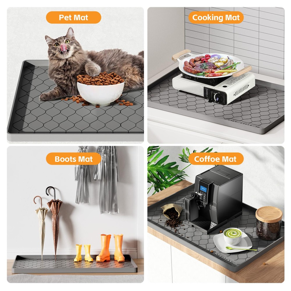 If you have a sink mat, you'll enjoy a plethora of benefits: 1. Perfect Protection: Safeguard your cabinets, shelves, and floors with precision-fit coverage, ensuring they remain free from scratches, dents, and water damage. 2. Liquid Containment: Our sink mat effectively contains liquids, preventing leaks, stains, and potential damage to your kitchen or bathroom. 3. Versatile Utility: a reliable shoe mat to keep your entryway clean, a pet feeding area that's easy to maintain, a crafting surface for creative projects with your kids, or a protective layer under your coffee maker. 4. Easy Maintenance: Its waterproof design ensures that spills and messes wipe away effortlessly, while its durable construction ensures long-lasting performance. With 13 sizes options available forselection : 1. It's imperative to measure and confirm the required dimensions before making a purchase. 2. In case an exact match isn't available, we recommend opting for a slightly smaller size to ensure the mat fits properly. 3. This precaution ensures a snug fit and avoids any inconvenience associated with incorrect dimensions. Ultimate Protection: under sink mat provides unparalleled protection to your cabinets, shelves, and floors from plumbing leaks, stains, scratches, spills, and more; With the capacity to hold gallons of liquid, it's the ultimate defense against damage Waterproof & Durability: Made from food-grade silicone, the mats are built to last and won't warp or change color over time. The raised 1.8 cm edge design prevents liquids from escaping and better protects your cabinets. In addition, the product can also be used as kitchen sink organizers to keep your cabinets or shelves free from messes Multi-purpose Mats: Our kitchen mat are for every space in your home! Protect your kitchen and bathroom cabinets from leaks and spills; These mats are waterproof, heat protection, and easy to clean You can also use them as Door mat, Pet Food Mat, Crafting Mat, Coffee Mat, dish drying mat and Insulating Mat Choosing the Right Size: With a variety of sizes available, Under Sink Mats offer a fit for nearly all kitchen and bathroom cabinets. Before ordering, measure the depth and width of your cabinet; If you can't find a match, it's better to choose a mat slightly smaller than your cabinet; If there are pipes inside the cabinet, the mat may need to be cut to fit; While this may not be the ideal solution, it still covers most of the area, providing better protection than none at all Easy to Clean & Install: The mats are a breeze to clean and simple to put in place and remove; Plus, We are committed to providing excellent after-sales service, and you can trust in the quality and durability of our mats for years to come; So why wait? Get yours today and say hello to worry-free cabinet care!
