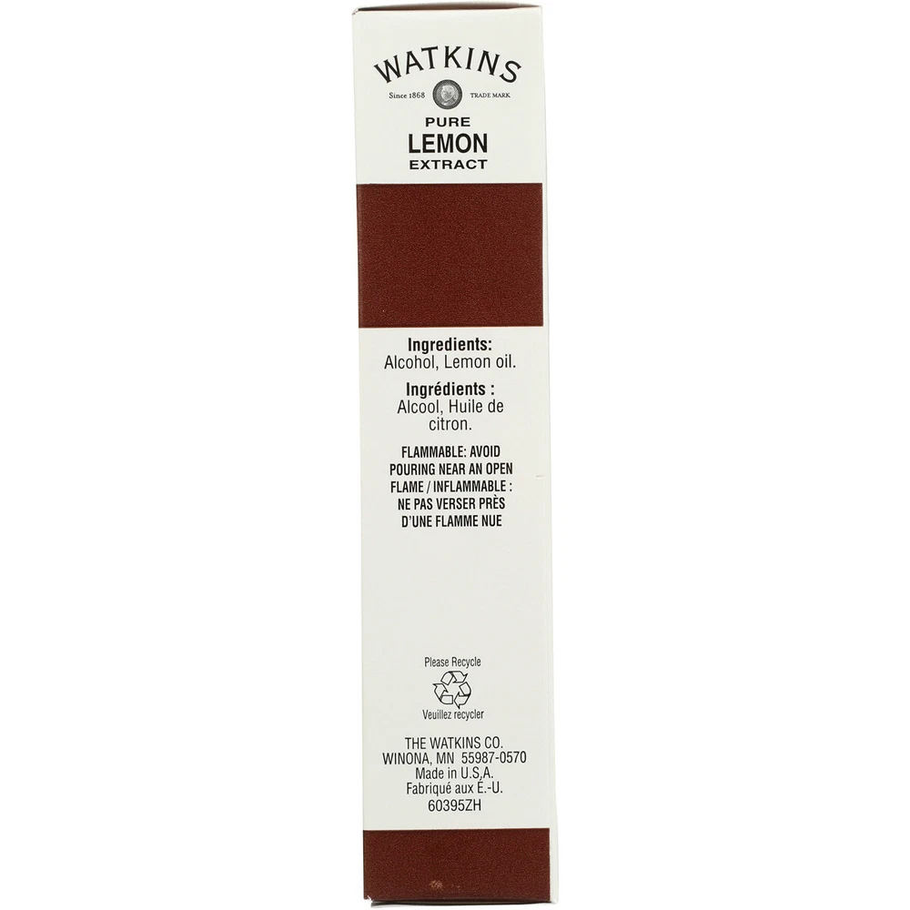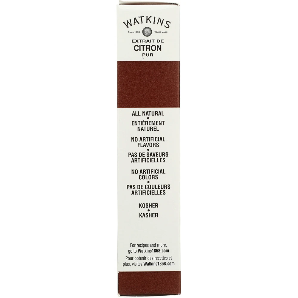 Add a burst of lemon flavor to your recipes with Watkins Pure Lemon Extract. This 2 fl oz bottle contains 59 mL of high-quality extract that is perfect for adding a touch of citrus taste to your baking and dessert dishes. Made by the trusted brand Watkins, this extract is a must-have for any home cook or professional baker. With its convenient size and easy-to-use packaging, this extract is perfect for adding a pop of flavor to your food and beverages. Whether you're baking a batch of delicious cookies or whipping up a refreshing cocktail, Watkins Pure Lemon Extract is the perfect addition. So why wait? Add this versatile and delicious extract to your pantry today!