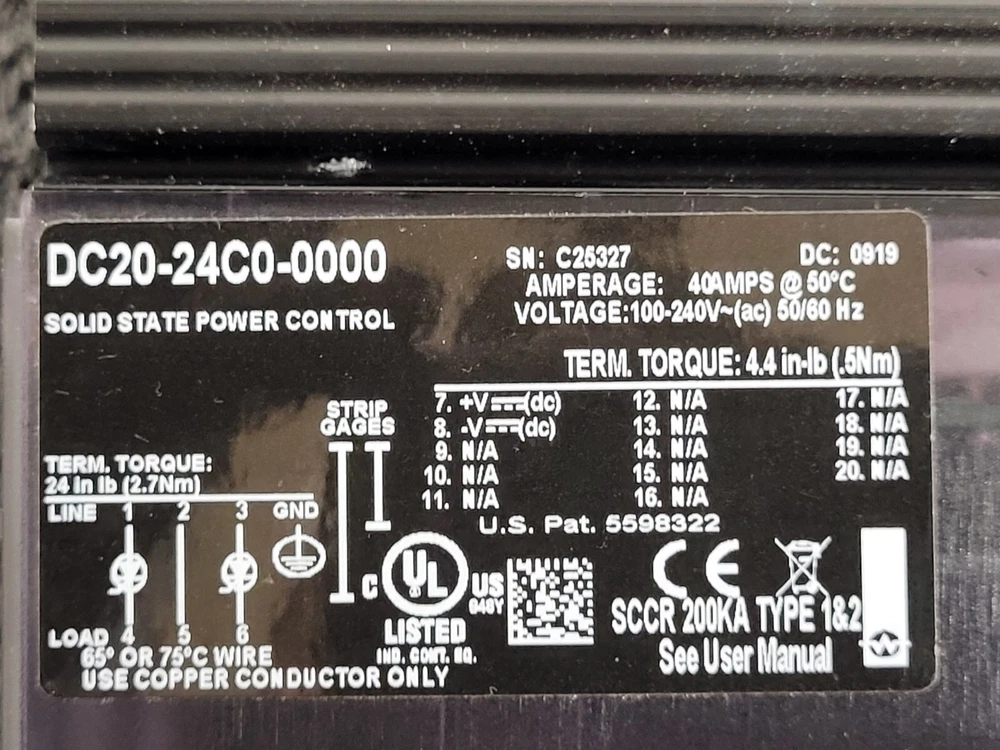Watlow DC20-24C0-0000 40A Solid State Power Control Module 100-240VAC 50/60HZ Good used condition, pulled from working surplus equipment. This item is free shipping to the lower 48 States, contact us for a quote elsewhere. Feel free to contact us with any questions Thank you for your interest and have a great day! International buyers - please note: Import duties, taxes, and charges are not included in the item price or postage cost. These charges are the buyer's responsibility . Please check with your country's customs office to determine what these additional costs will be, prior to bidding or buying . If you are using an International freight-forwarding or mail redirection - You are not covered through the eBay money-back guarantee if your item was sent to another address after original delivery, unless you request to use the eBay Global Shipping Program or eBay International Standard Delivery. We are not responsible for any items after they have arrived at a third-party freight-forwarder or mail redirection service .