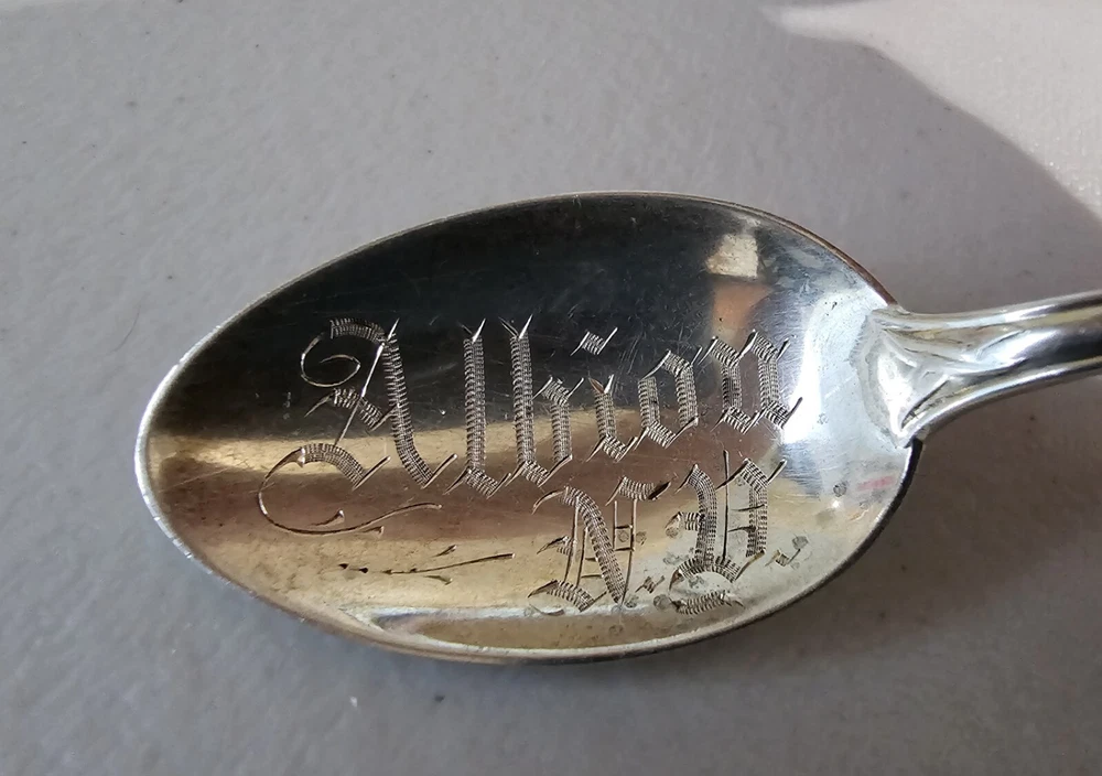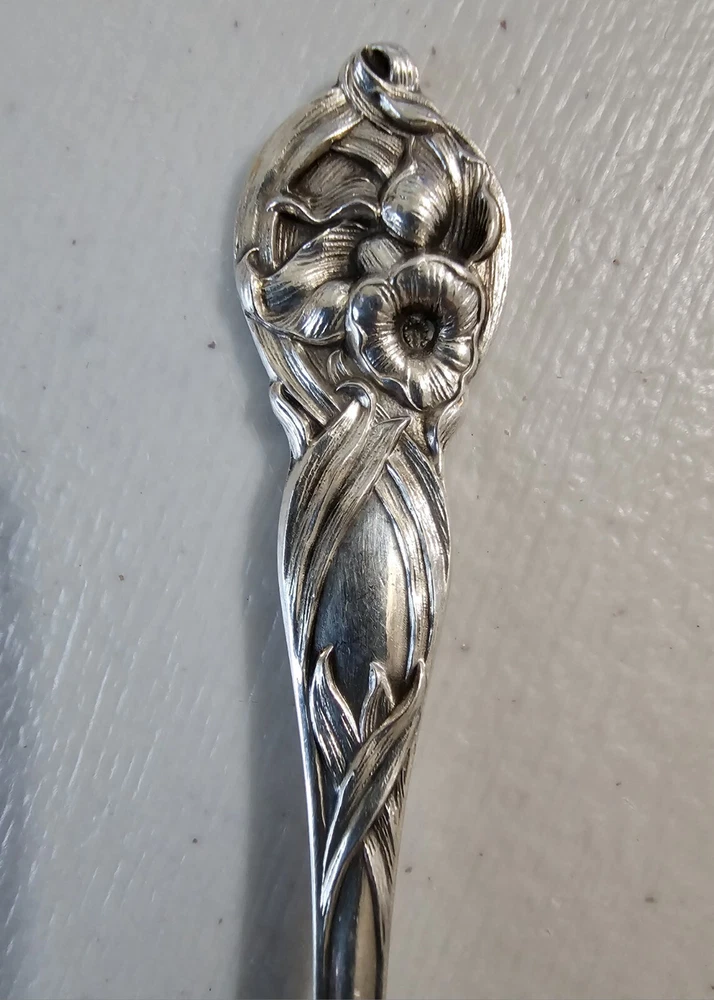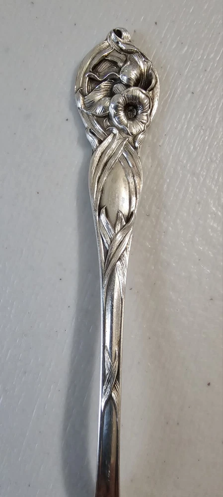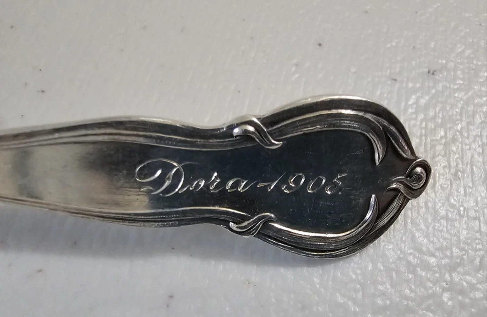 Watson 1903 Orchid pattern teaspoon. The bowl is engraved Albion N.H. The back is engraved Dora 1905. My scale weighs this at .88 oz. Returns accepted within 30 days in same condition as purchased. Buyer pays return shipping. Shipping USPS ground.