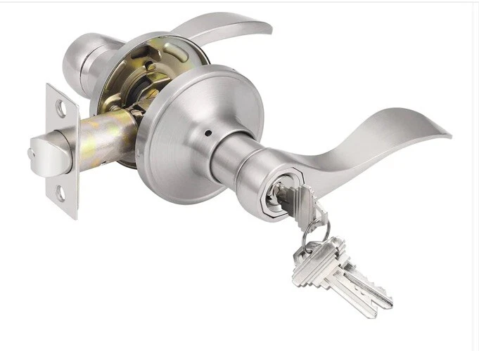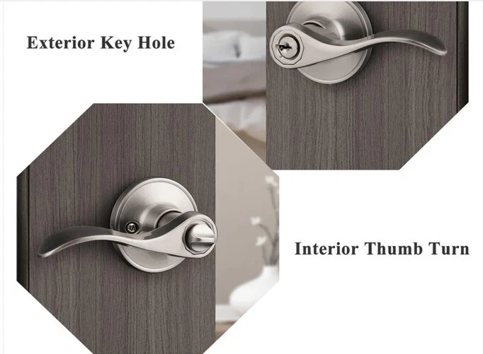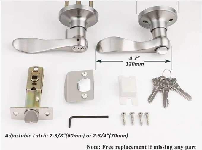 MATERIAL: Made of Stainless Steel; Satin Nickel Finish; 3 Pack entry levers with lock and same keys 【Keyed Alike Door Lock】The entry door lock can be locked or opened by the keys from outside. Several locks share the same keys. The entry door lever is perfect for interior and exterior doors like homes, offices, hotels, etc. 【Elegant Design】Wave style door lever is made of zinc alloy, sturdy and durable. Smooth surface and ergonomic design provides a more comfortable gripping experience. The elegant satin nickel finish is corrosion-resistant and not easy to fade. 【Dimension】Fit standard door from 35mm to 45 mm (1-3/8" to 1-3/4"); Adjustable latch: 60mm or 70mm (2-3/8" or 2-3/4"); Lever length: 120mm (4.7"); Rosette diameter: 65mm (2.56"). The square plate of the latch is not removable. 【Reversible Levers】The entry door levers fit both right and left handed doors. The interior lever can be removed from the rosette and switched with the exterior lever. 【Easy Installation】It's easy to install in minutes with just a screwdriver. The package includes all accessories needed and the instruction can be as a template.