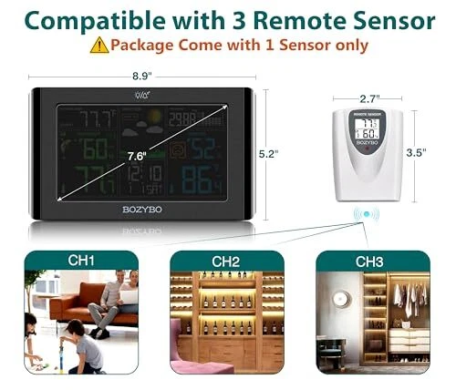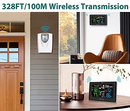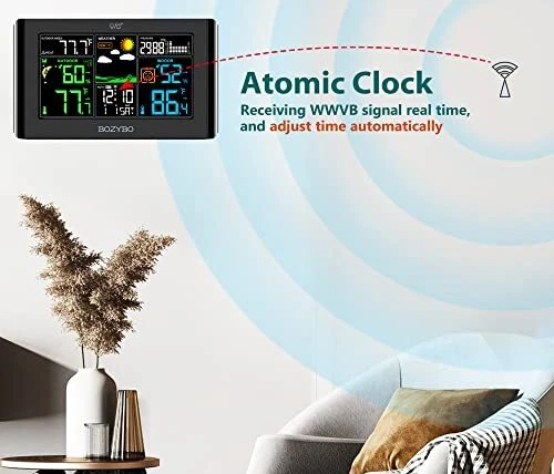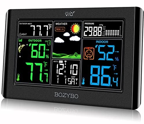 Return Policy Fast Delivery Trusted seller Weather Station Wireless Indoor Outdoor Thermometer: Digital Weather Thermometer with Atomic Clock Temperature Humidity Monitor with Calendar Adjustable Backlight and Calendar Product Description 7.5" Colorful Weather Station: Equipped with 7.5" HD full color screen visible from any angle. Perfect for placing on a desk or hanging on a wall. Extensive information displayed by this digital hygrometer includes: indoor/outdoor temp and humidity, air pressure and history, moon phase, calendar, atomic clock, weather forecast and trend, outdoor index and more. Indoor Outdoor Thermometer with WWVB & DST Function: 4 time zones (PST-MST-CST-EST) available to choose from. Once set, the weather station will adjust in real time every day with the WWVB function. It can also adjust time automatically during Daylight Savings Time changes with the DST function. Atomic Clock with Adjustable Backlight: When plugged in to a DC adapter, the monitor brightness can be adjusted to three different brightness levels ( High Bright - Low Bright - Off ). When powered by a battery, the backlight will turn off after 10 seconds to save power. Outdoor Thermometer with 3 Remote Channel: Each indoor thermometer can pair with up to 3 remote sensors so you can monitor the temperature and humidity of your nursery, storage room, wine cellar, pantry, etc. Purchase remote sensor: B0BNMD1QZG. Forecast Station with Comfort Icon: By monitoring air pressure and air pressure history, the barometer can forecast your local weather up to the next 12-24 hours. Please allow 7-10 days to analyze air pressure history for an accurate forecast to appear. Shipping Returns Payment Shipping Shipping is FREE to all addresses other than APO/PO boxes in the lower 48 states. All our stock ships from US-based warehouses. Shipped via USPS or UPS (depending on location and package weight) Unless stated otherwise, all orders will ship within 24-72 hours of your payment being processed. Check our feedback to see the great reviews of FAST shipping we offer. Returns Seller does not accept returns Payment We currently accept payment via eBay managed payments only. Once payment is cleared, we will dispatch your shipment within 1-3 business days. Please refer to the "Shipping" tab for more information regarding shipping speed to your destination.