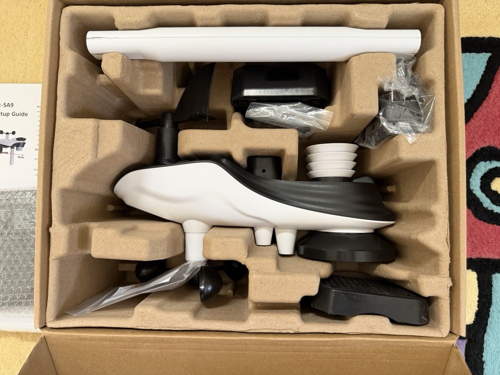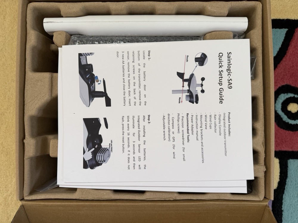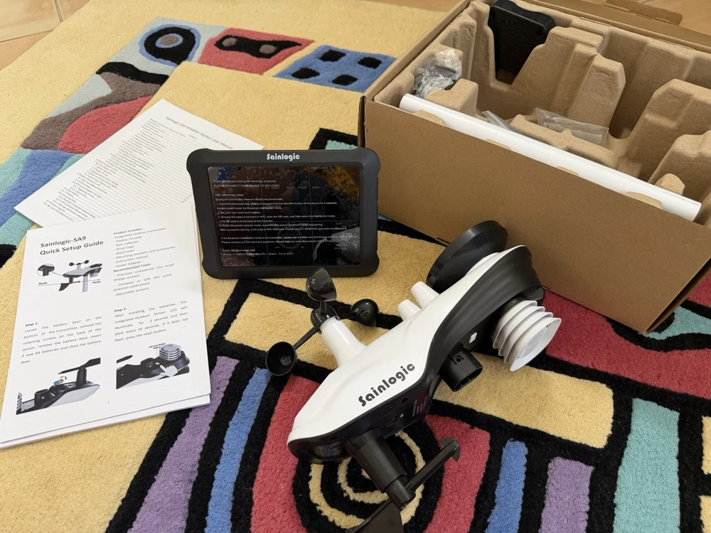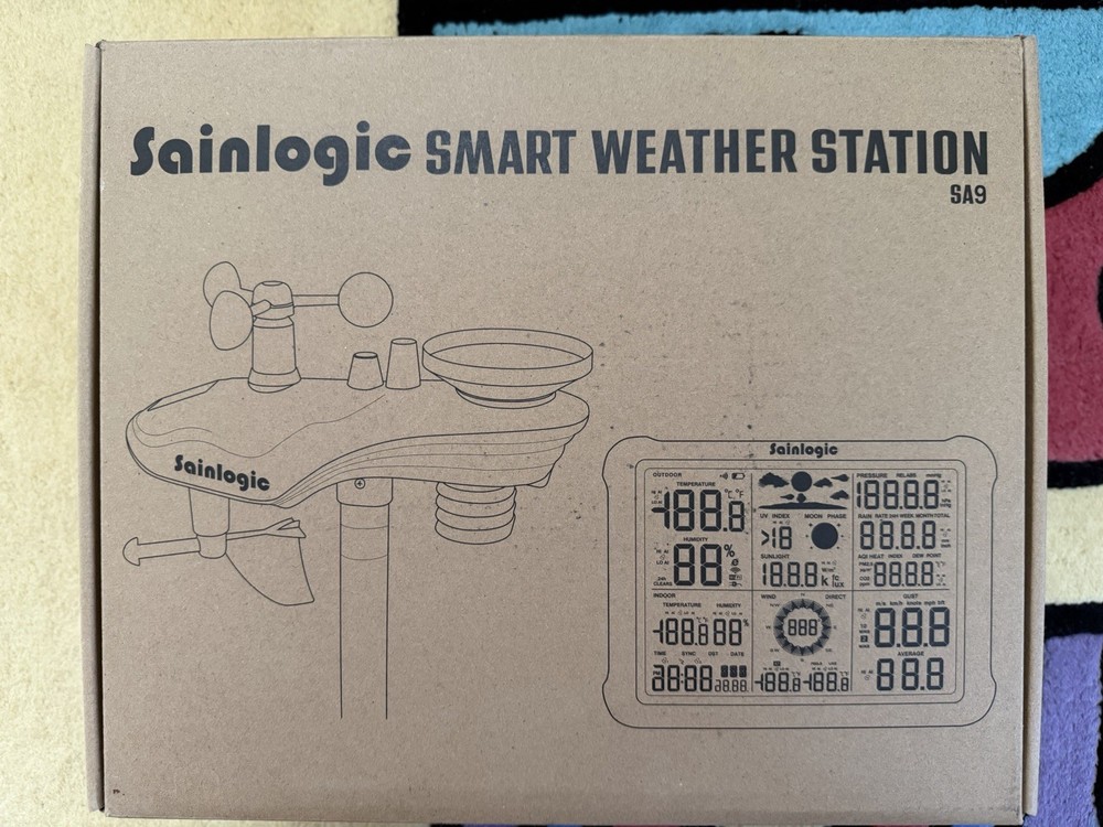 Slightly used Sainlogic WiFi Smart Weather Station SA9 with 24H/ 7Days Accurate Weather Forecast by Weatherseed® AI, 8.5" Large Display,UV,Sun Light,Rain Gauge,Wind Gauge,2-Year Data Storage & Export(Only 2.4G)all original parts included and guaranteed for one year part free replacement including outdoor sensors and monitor