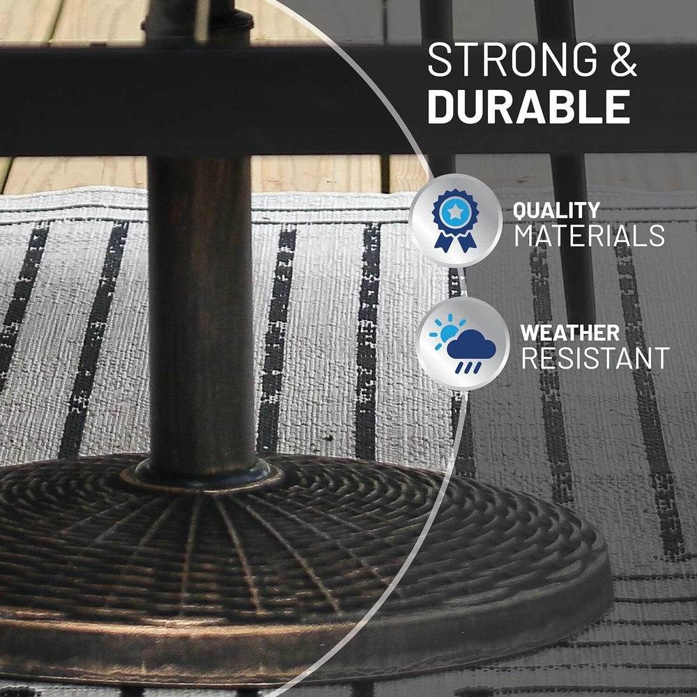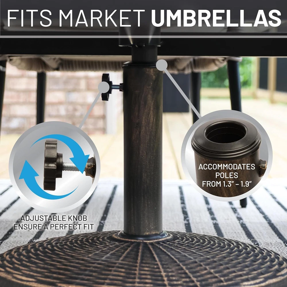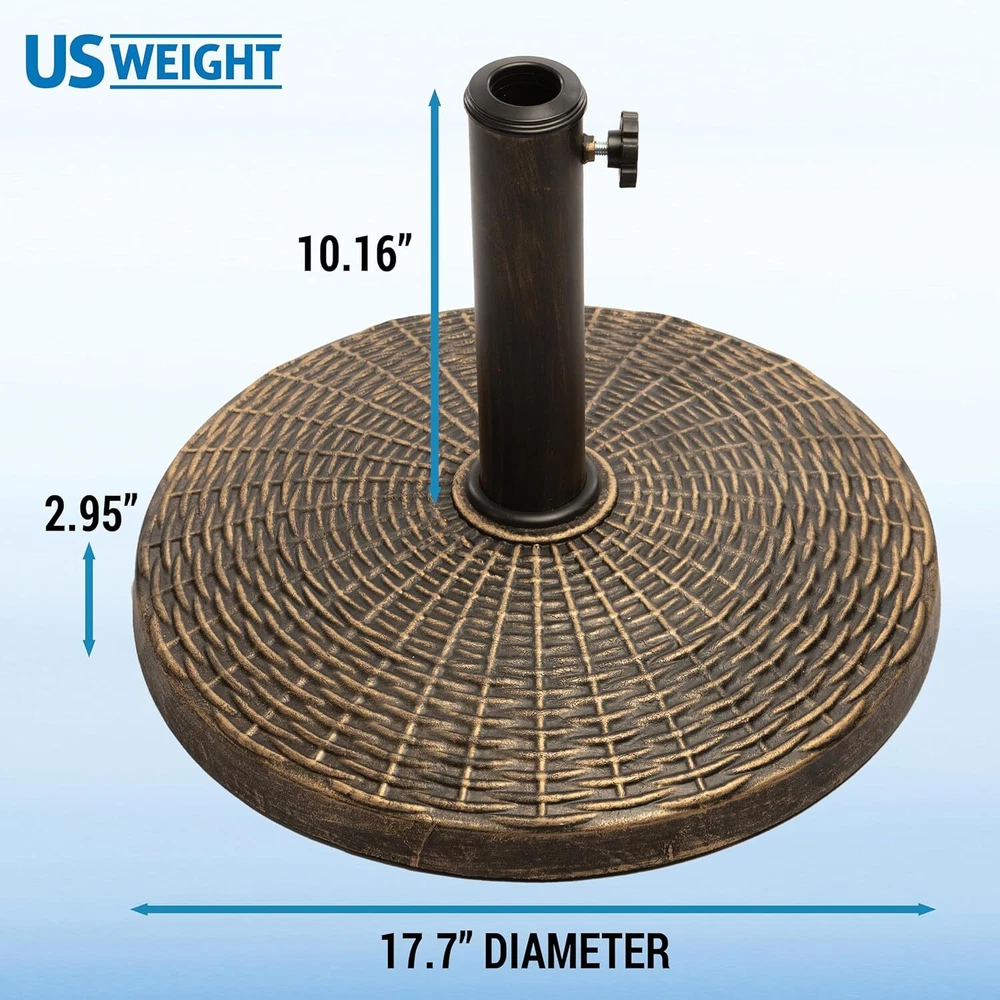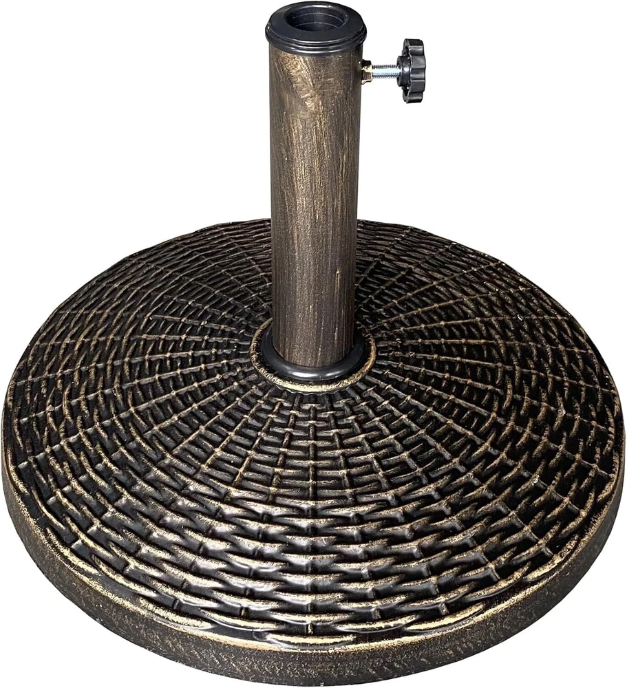 Product Description - Cast Stone Patio Umbrella Base, 22lb Wicker Pattern - Durable, Weather-Resistant Patio Umbrella Base - Made in the USA - Bronze Durable Cast Stone Construction: This patio umbrella base is crafted from high-quality cast stone, ensuring exceptional durability and longevity. Designed to be used with a Patio Table Elegant Wicker Pattern Design: The wicker pattern on this outdoor umbrella stand adds a touch of elegance to your patio. Base measures 17.5” L x 17.5” W x 10.5” H and features a 9.75” stem Adjustable Fit for Various Umbrellas: Our umbrella stand outdoor base features an adjustable design, accommodating poles from 1.3" to 1.9". Perfect for securing your outdoor patio setup. Ease of Use: The base feature 4 PVC feet to protect your patio, as well as support knobs to secure your post in place Compact and Portable: Weighing 22lb, this umbrella stand outdoor base is both sturdy and portable. It provides excellent stability for your outdoor umbrella. About Us We are a reputable seller with many years of experience selling on eBay. Our goal is to provide high-quality products and excellent customer service. Shipping Items will be shipped within 1-3 business days when we received payment. (Orders are not processed on weekends & holidays) Tracking information will be sent once item is shipped. Delivery time depends on destination and other factors Item is shipped to ebay address. Leaving correct address can minimize delay. For international shipping and shipping to Guam, Hawaii and Alaska, Please contact us before placing the order. International buyers please note: Import duties, taxes and charges are not included in the item price or shipping charges. These charges are buyer’s responsibility. We will try our best to reduce the risk of the custom duties. Local pick-up is unavailable at the moment. Contact Us We reply any email messages within 1 business / working days(off-duty at weekend). If you do not get a response from us, then please check your junk or spam mailbox. Our Business hours: Mon-Fri 9:00-18:00, UTC/GMT +8 hours. Please contact us either by clicking "contact seller" in the "purchase history" section or simply click "ask a question" at the bottom of this page. If you are unsatisfied with our item or service, please contact us before leaving any feedback. We are committed to resolve all issues in a friendly and satisfactory manner.