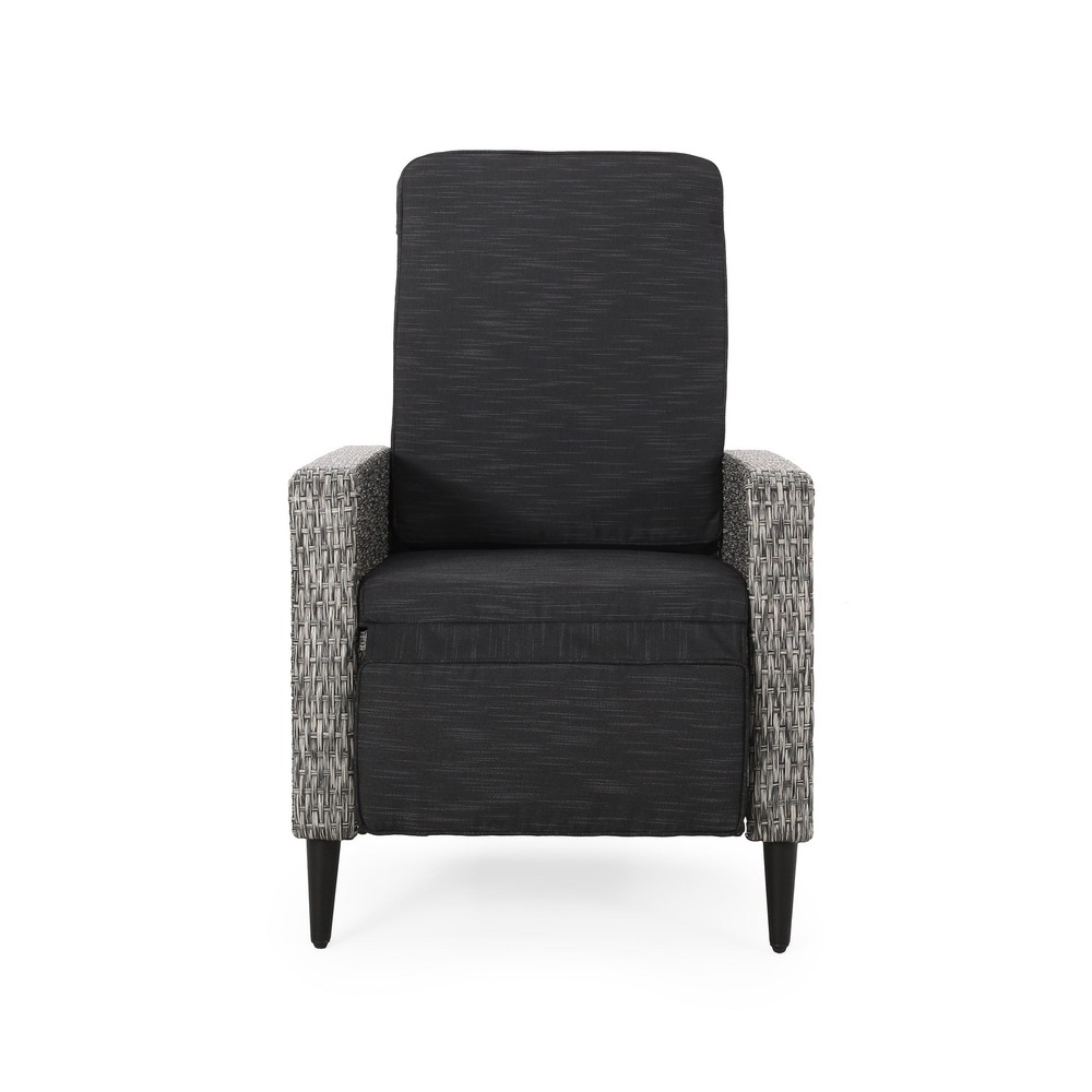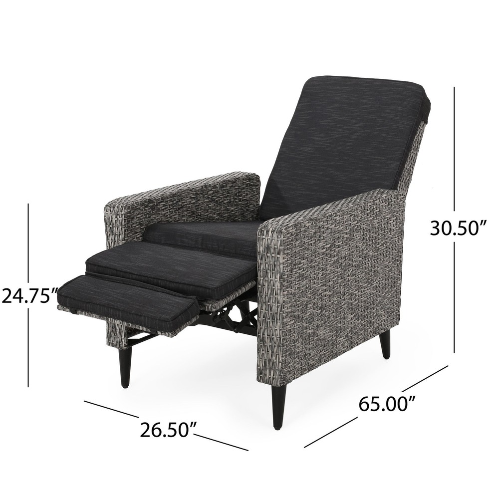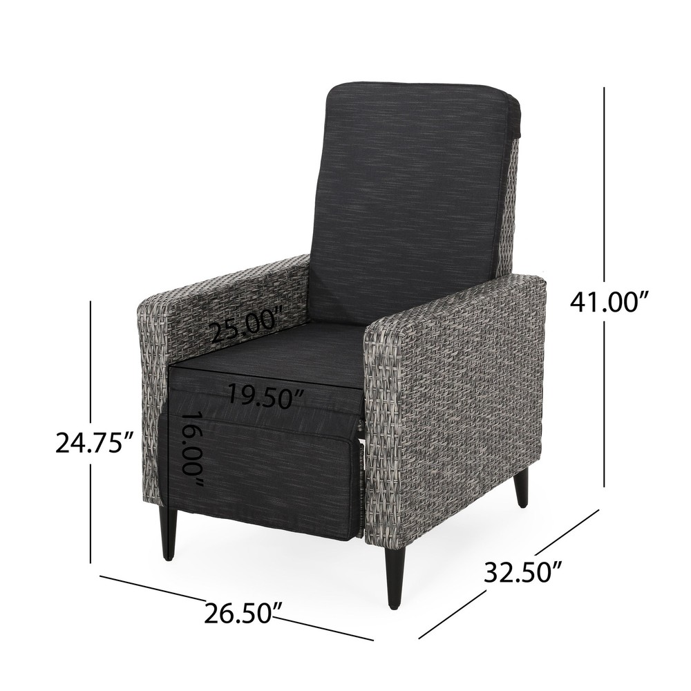 Specifications Place of Origin #originPlace# Main Color Black+Grey Main Material Rattan Dangerous Goods #dangerFlag# Dimensions & Weights Assembled Length (in.) 26.50 Assembled Width (in.) 32.50 Assembled Height (in.) 41.00 Weight (lbs) 52.25 Product Features Featuring a stunning wicker finish and water-resistant cushions, this recliner offers excellent support and durability, topped with cushy comfort for hours of leisure under the sun. This impressive piece takes a traditional outdoor style and gives it a modern twist so that you can enjoy an upgraded look for your backyard or patio space along with its convenient functionality. POLYETHYLENE RATTAN: Featuring a long-lasting woven finish, this style is not only incredibly durable but also provides a versatile appearance. The handcrafted details of this material allow this piece to blend seamlessly with your outdoor decor. WATER-RESISTANT CUSHIONS: Our cushions are covered with a non-porous material that makes cleaning any spill a breeze. Please note that these cushions are water-resistant and not waterproof. Please do not submerge in water. PUSH-BACK RECLINER: This recliner is a push-back recliner that allows you to lay back and relax after a long day. Simply use your body weight to push the chair back to recline and tilt your body weight forward and upwards to bring it back to the upright position. CUSHION ANCHORS: The cushion for the recliner includes a simple slip sleeve that covers the backrest and extends into the seating. This is reinforced with hook and loop ties to ensure that your cushions won't move while you relax. DIMENSIONS: Choose an accessory that is the perfect size for you and your furniture. This recliner is 26.50” W x 32.50” D x 41.00” H. You will love how much your space can transform with the simple addition of this charming recliner. Leg Material Details : Iron Care Instructions : Wipe clean with a dry cloth, when needed Description