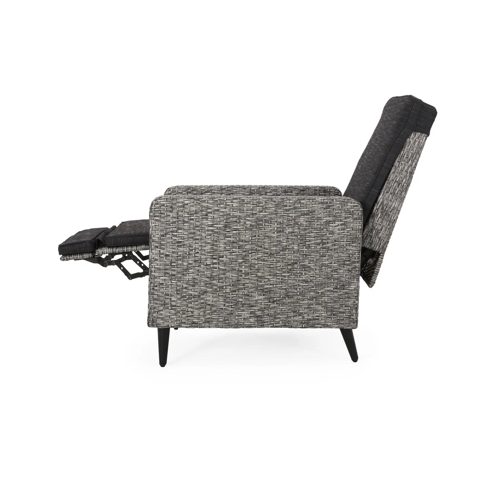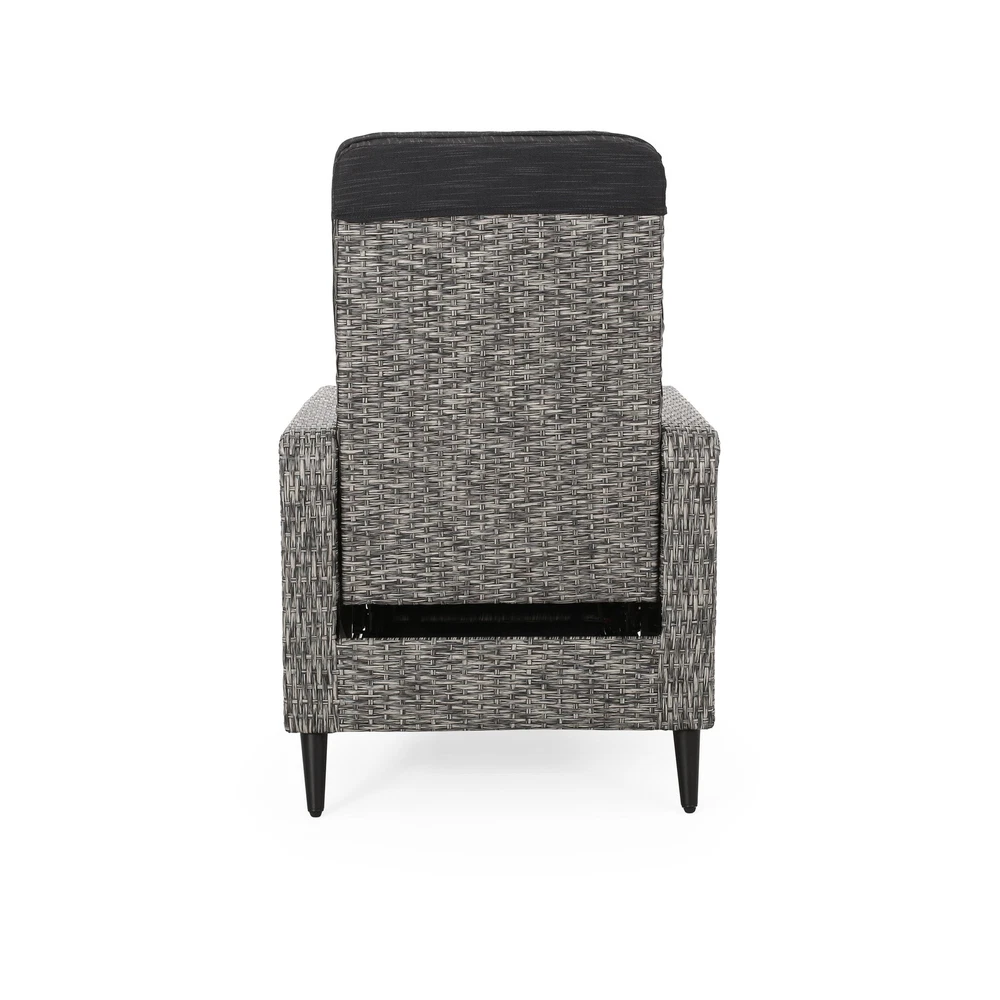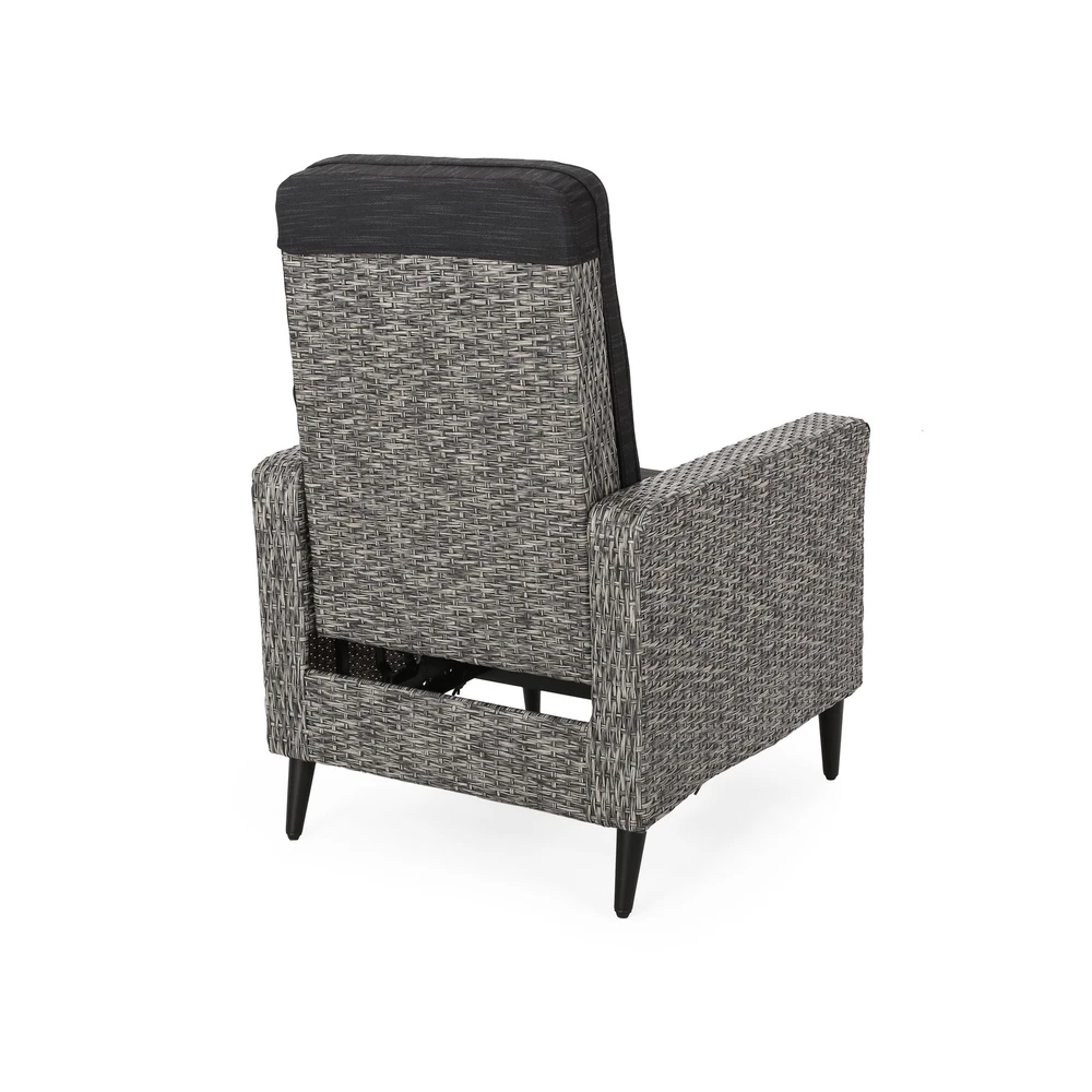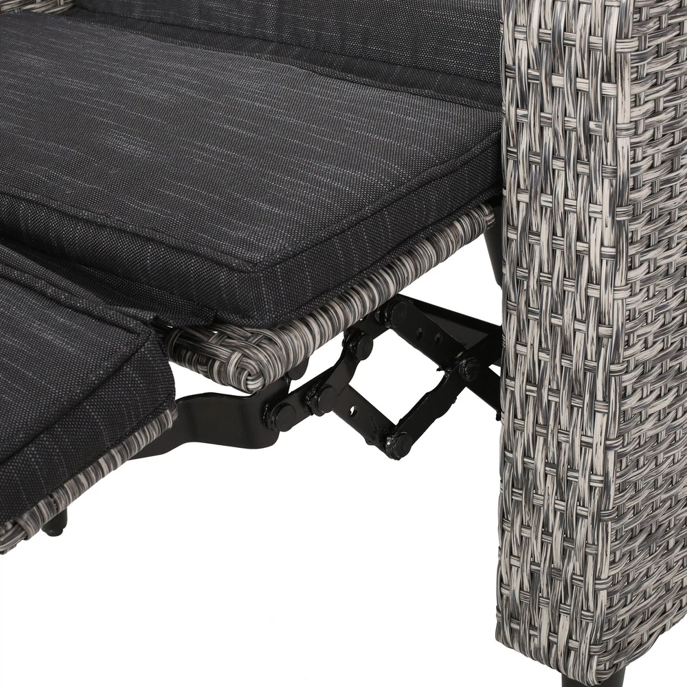 Specifications Place of Origin #originPlace# Main Color Black+Grey Main Material Rattan Dangerous Goods #dangerFlag# Dimensions & Weights Assembled Length (in.) 26.50 Assembled Width (in.) 32.50 Assembled Height (in.) 41.00 Weight (lbs) 52.25 Product Features Featuring a stunning wicker finish and water-resistant cushions, this recliner offers excellent support and durability, topped with cushy comfort for hours of leisure under the sun. This impressive piece takes a traditional outdoor style and gives it a modern twist so that you can enjoy an upgraded look for your backyard or patio space along with its convenient functionality. POLYETHYLENE RATTAN: Featuring a long-lasting woven finish, this style is not only incredibly durable but also provides a versatile appearance. The handcrafted details of this material allow this piece to blend seamlessly with your outdoor decor. WATER-RESISTANT CUSHIONS: Our cushions are covered with a non-porous material that makes cleaning any spill a breeze. Please note that these cushions are water-resistant and not waterproof. Please do not submerge in water. PUSH-BACK RECLINER: This recliner is a push-back recliner that allows you to lay back and relax after a long day. Simply use your body weight to push the chair back to recline and tilt your body weight forward and upwards to bring it back to the upright position. CUSHION ANCHORS: The cushion for the recliner includes a simple slip sleeve that covers the backrest and extends into the seating. This is reinforced with hook and loop ties to ensure that your cushions won't move while you relax. DIMENSIONS: Choose an accessory that is the perfect size for you and your furniture. This recliner is 26.50” W x 32.50” D x 41.00” H. You will love how much your space can transform with the simple addition of this charming recliner. Leg Material Details : Iron Care Instructions : Wipe clean with a dry cloth, when needed Description