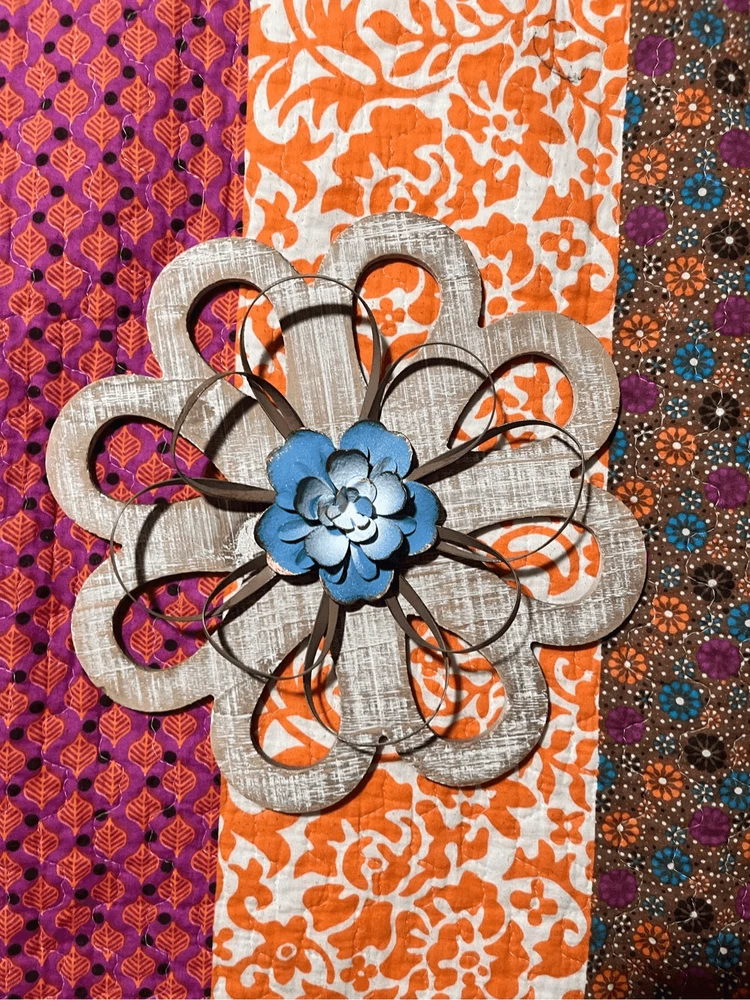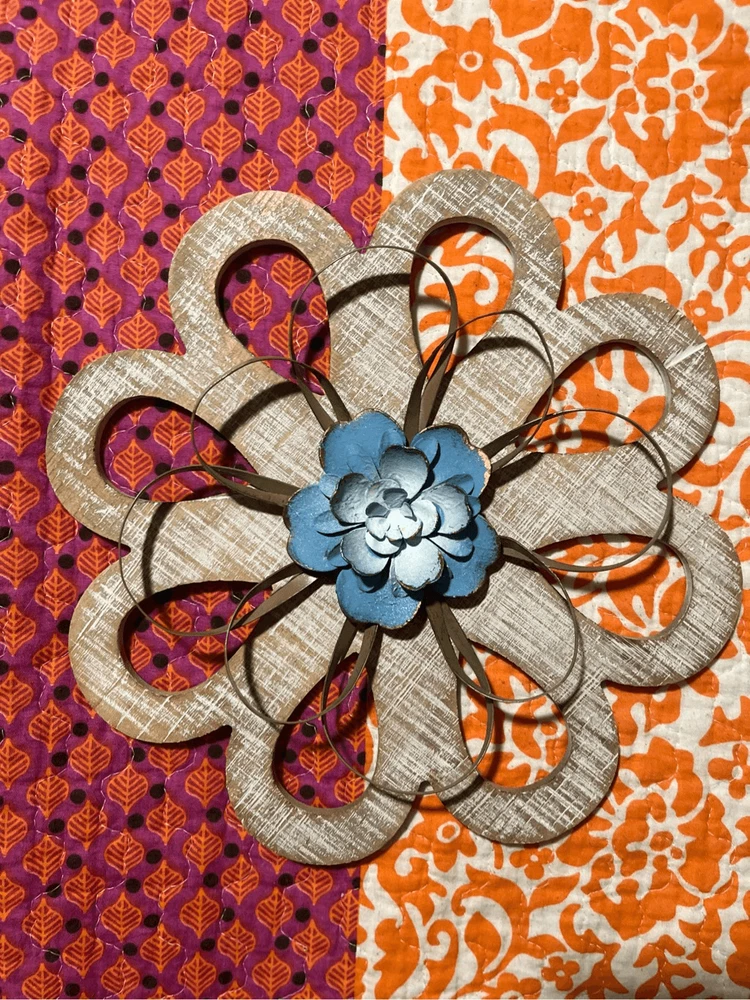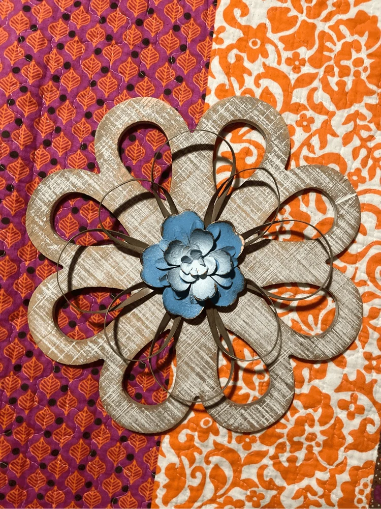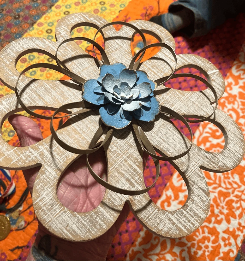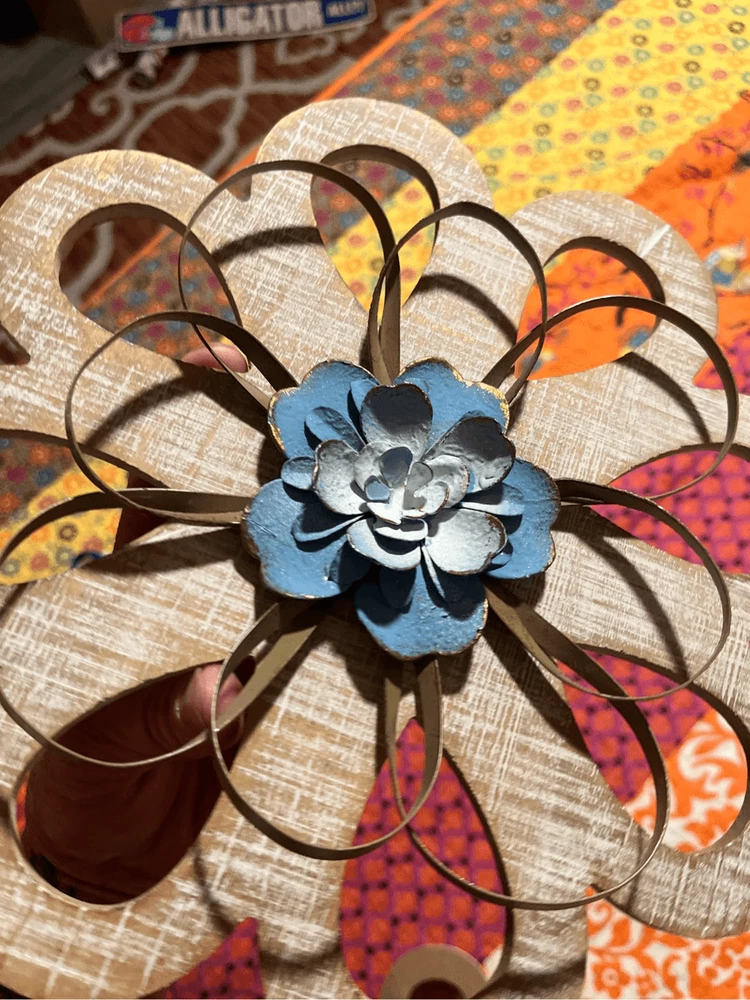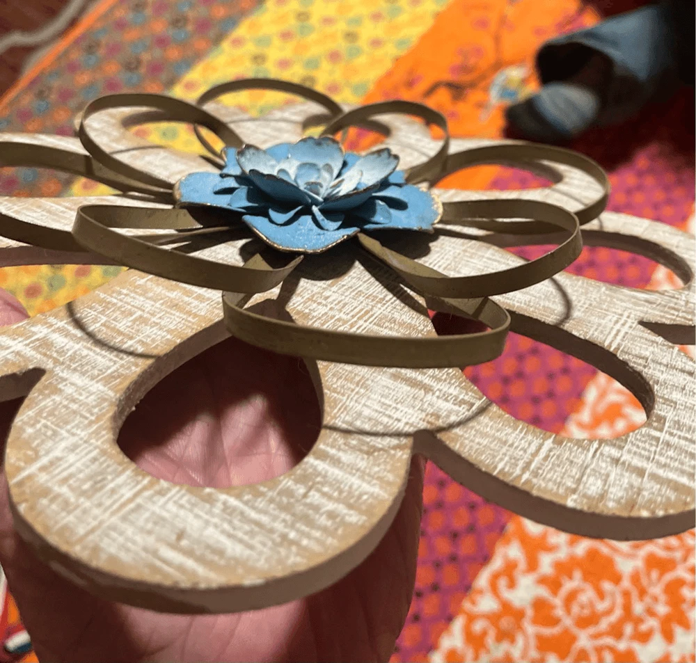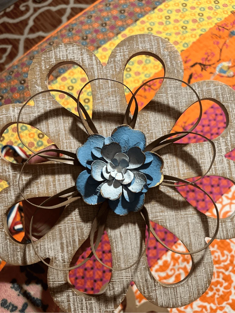 round loops, weathered wood, small metal petals, blue flowers white inside. 11" across the widest part. 11" tall. Really pretty with the wood, then having the light blue contrast. They look so pretty on your wall.