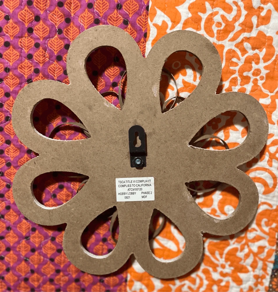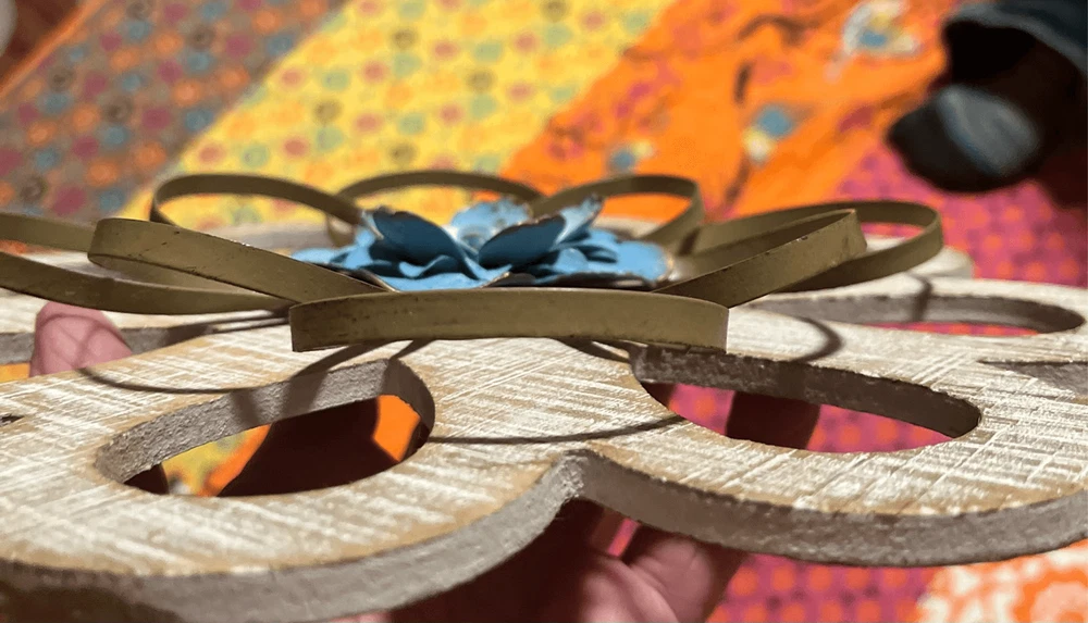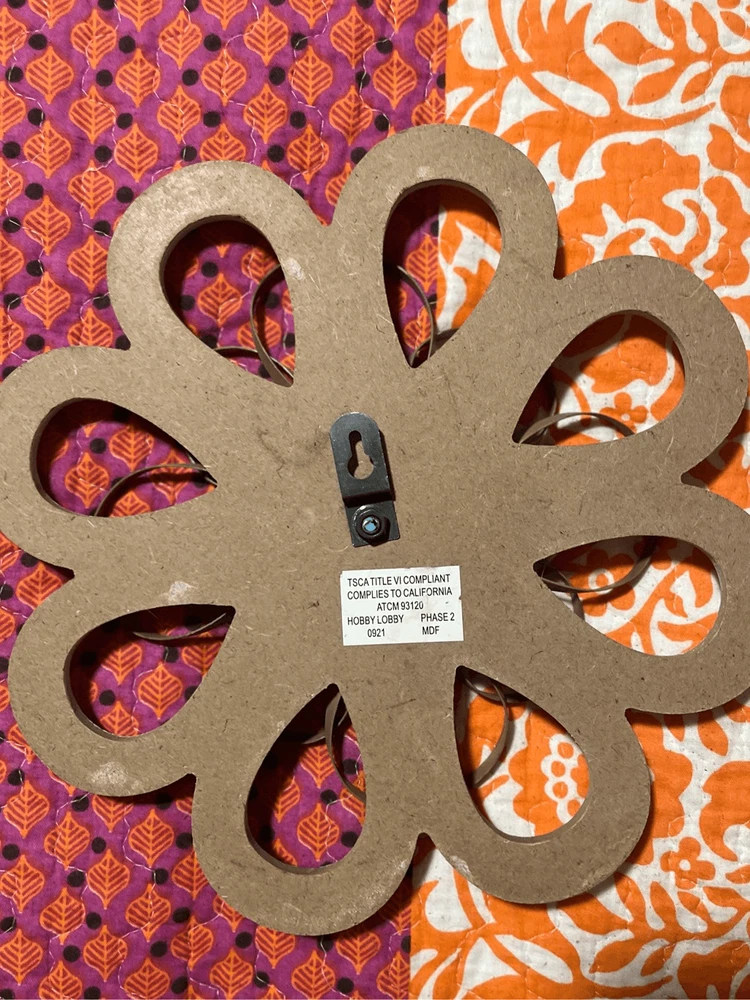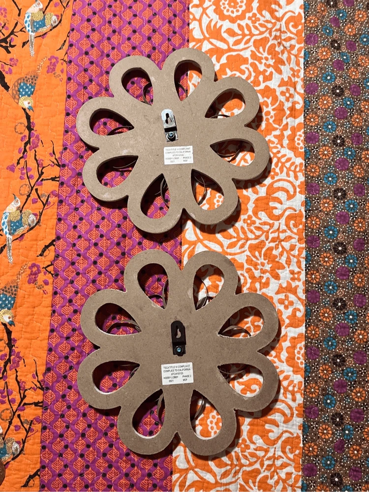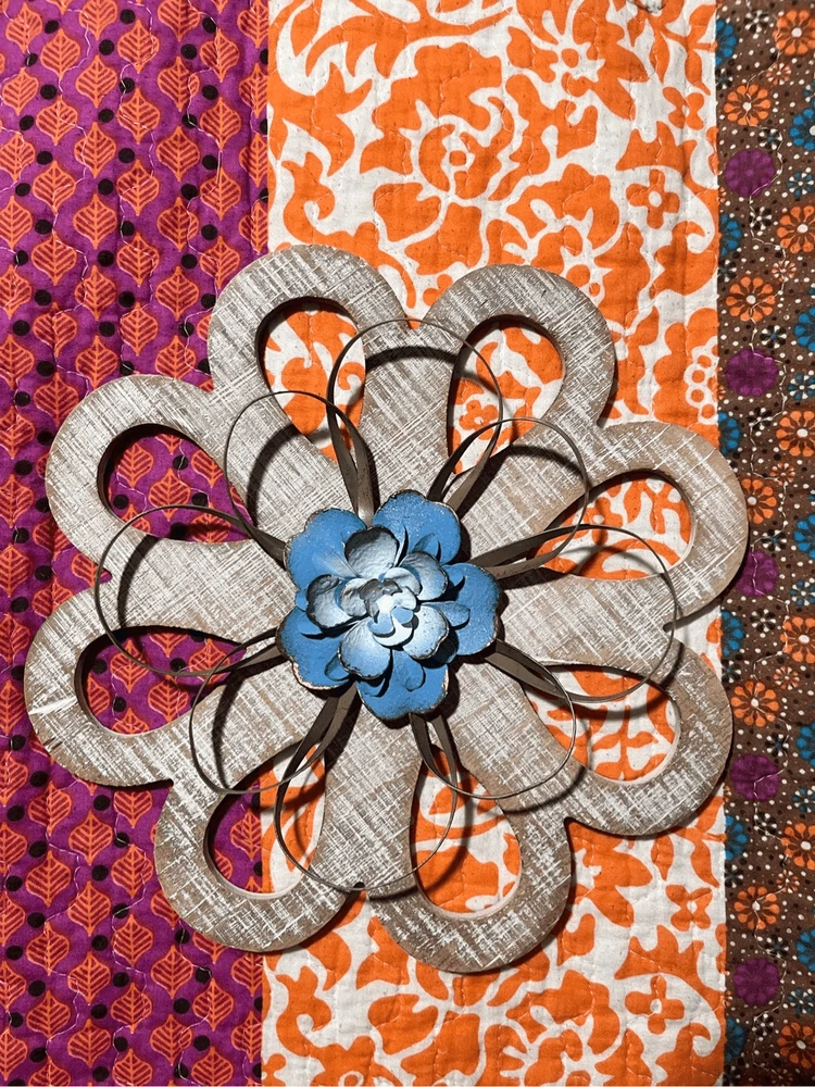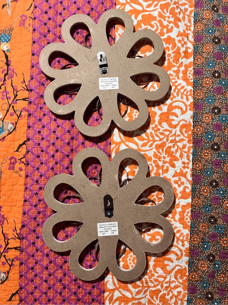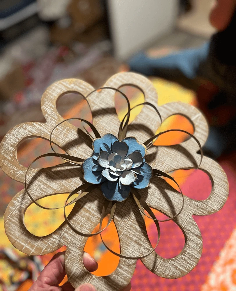 round loops, weathered wood, small metal petals, blue flowers white inside. 11" across the widest part. 11" tall. Really pretty with the wood, then having the light blue contrast. They look so pretty on your wall.