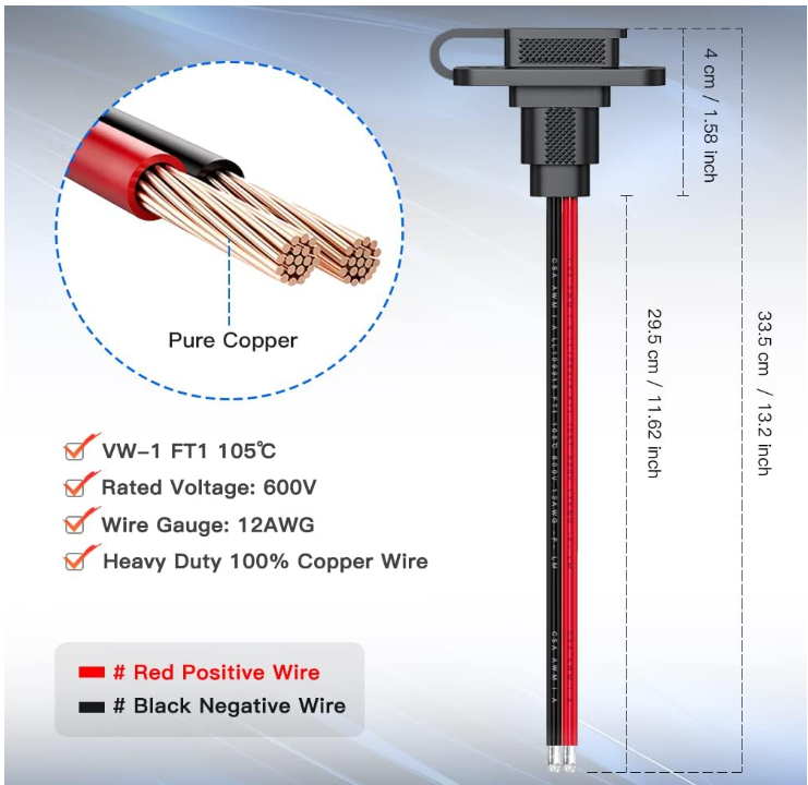 ELECTOP SAE Connector, Rectangular SAE Power Socket Sidewall Port, Weatherproof SAE Quick Connect Solar Panel Flush Mount Plug Outlet, 12AWG SAE Cable for Solar Generator Battery Charger (2 Pack) Brand ELECTOP Material Copper Mounting Type Panel Mount About this item ★ Package Included - 2 SAE connector extension cables with 4 mounting screws. The sae cable is made of heavy duty 12AWG copper wire, very thick and durable. Double PVC jacket, best insulation effect, 105 °C heat resistance. Cable Length:33.5 cm/13.2 inch(including sae socket). ★ Standard SAE Quick Release Connection - Fit for most of SAE port, quick connect/disconnect. Suitable for create a weatherproof bulkhead/panel mount SAE power point. Before final connection, please make sure that the polarity is correct. ★ Wide Application - Quickly connect or disconnect battery packs on different vehicles. Wide rang of application in solar panel, motorcycle, lawn motors, tractor battery, boat marine trolling motor bike, RVs, DIY etc. ★ Dustproof and Waterproof Cap - The SAE power socket sidewall port with protective cap protects against raindrops and dust, keeping the inside of the sae connector clean and dry when not in use. ★ Premium Quality SAE Connector Cable - If you have any questions about this sae plug socket cable set, please feel free to contact us. Our costumer service team always be there for you. . We offer FREE shipping on all orders! . We ship within Five business days of payment, usually sooner. . We use a selection of shipping services such as UPS, FedEx, USPS etc. . We only ship to the lower 48 states, no APO/FPO addresses or PO Boxes allowed. . Local pickups and combined shipping options are not provided at this time. . Your satisfaction is a wonderful reward for our efforts. Please assist us by leaving a positive review if you feel pleased with our service. . In the event that you encounter any difficulties related to your order, please do not hesitate to reach out to us directly through the Messaging system on the Ebay platform. Kindly consider opening a COMPLAINT or a RETURN REQUEST as a last resort, only after all other possible measures have been attempted and we have been unable to provide you with assistance. . We will get in touch with you within 24 hours and make every effort to ensure your satisfaction. . Please rest assured of our service quality.