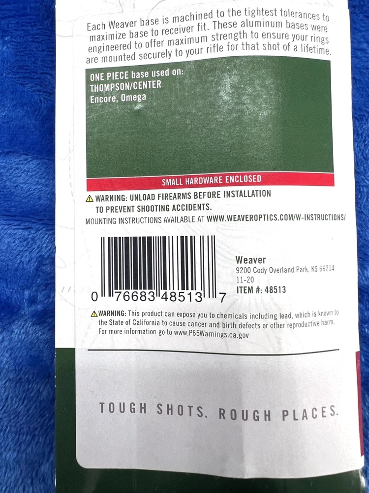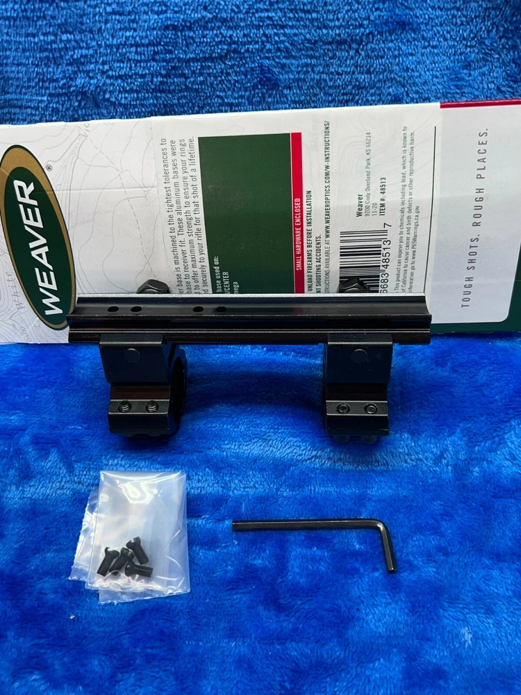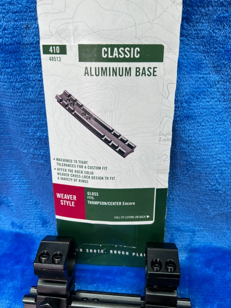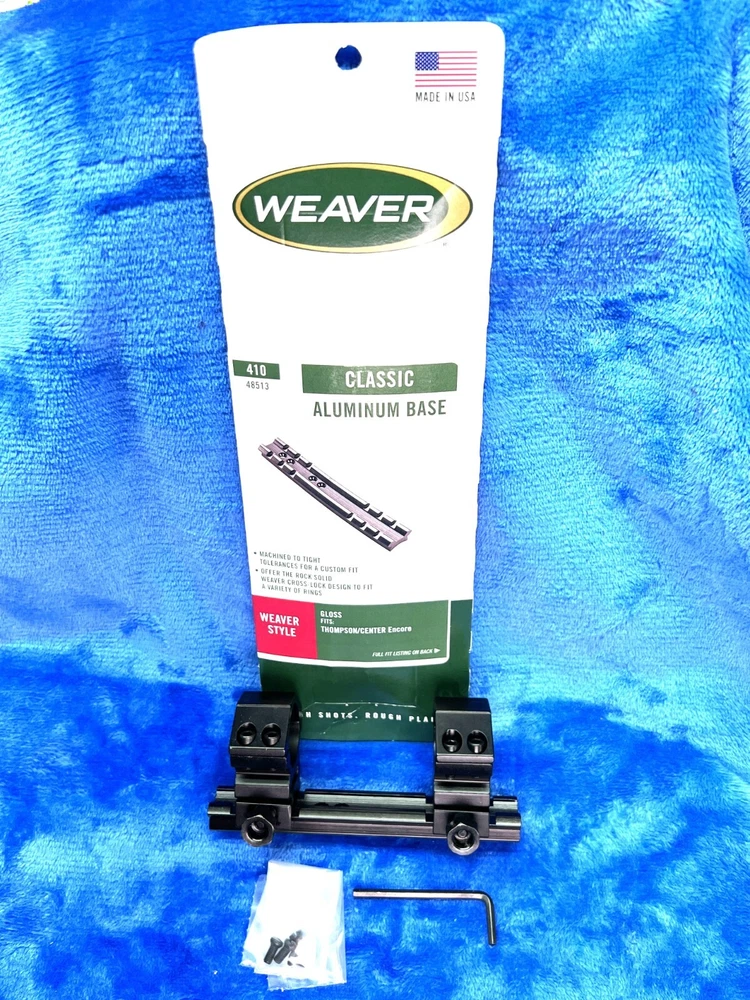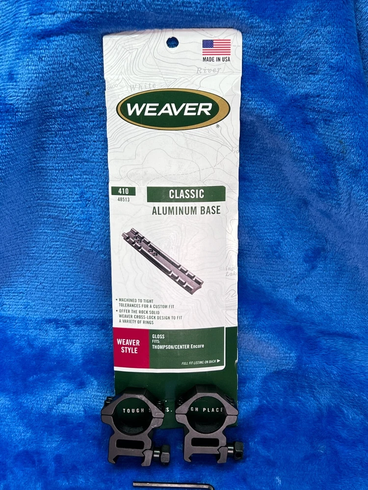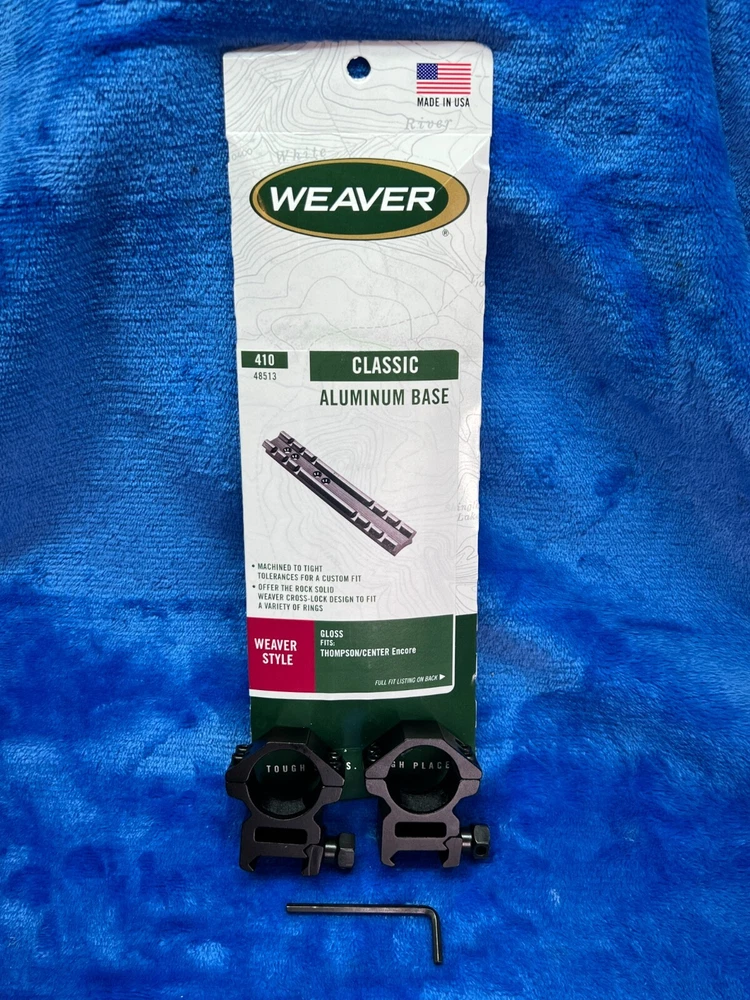 Weaver, Model #410 Detachable Top Mount 1 Piece Base with 1" LOW HEIGHT RINGS, Fits T/C Encore, Gloss Finish Aluminum construction Tight tolerances Each Weaver base is machined to tight tolerances for a custom fit. These Aluminum bases offer maximum strength for rings to hold tight. LOW 1" Rings Specifications UPC 076683485137 Manufacturer Weaver Manufacturer Part # 48513 Model 410 Model Detach Top Mount Type 1 Piece Base Color Black Fit T/C Encore Subcategory Bases Finish Gloss This Weaver Scope Mount Base is designed for use with Thompson Center Arms Encore pistols and rifles. It is made of durable aluminum and comes in a sleek gloss black color. The mounting location is at the top of the barrel, and it uses a one-piece mounting system. The Scope tube diameter is 1 inch, and it is compatible with Omega Gloss and Thompson Encore scopes. This product is made in the United States and is perfect for hunting and other outdoor activities.