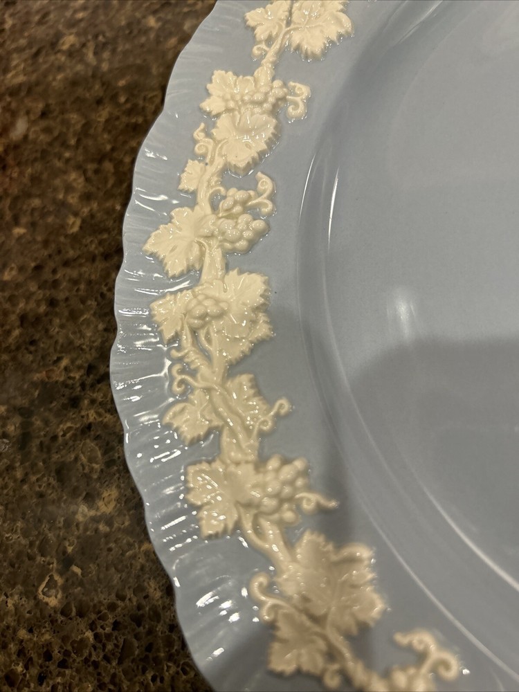 This beautiful Wedgwood dinner plate is a must-have for any collector or lover of vintage earthenware. The plate features a stunning cream color pattern on a light blue with a shell edge design that adds a touch of elegance to any table setting. Measuring 10 inches in diameter, this plate is perfect for serving your favorite meals or displaying as a decorative piece. Crafted by the renowned Wedgwood manufacturer in the United Kingdom, this vintage dinner plate is a true gem. The plate is unboxed and features a blue color that will complement any decor. With a date range of 1980-now, this plate is a rare find that will add a touch of history to your collection. Don't miss the chance to own this exquisite piece of Wedgwood history.