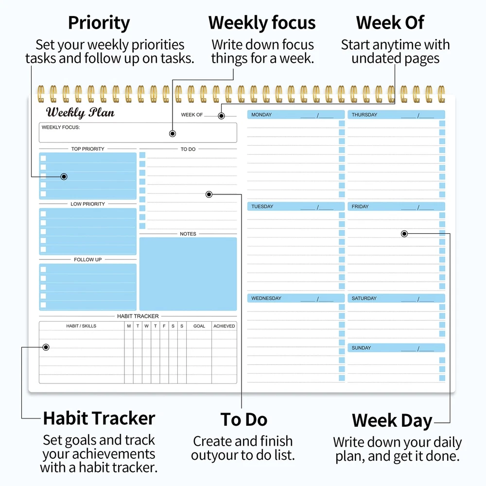 Weekly Planner Notepad Undated Weekly Schedule Planner To Do List Notebook Goals Planning Pad Habit Tracker Journal for Man & Women,52 Weeks (8.5x11") ✍MAKES YOUR LIFE PRODUCTIVE - This weekly planner notepad focuses on meeting any of your needs. A weekly planner notepad includes space to write your to-do list, appointments, and meetings and keep track of all days clearly with the weekly view. Blocks in the weekly page for priority and notes columns for your spontaneous and important events. Manage your time effectively. ✍UNDATED WEEKLY PLANNER- 52 Weeks, undated weekly planning pages, let you pick up exactly right where you left off. There are no unnecessary sections to fill in and no skipping dates or pages. The weekly planner is conveniently undated so you can plan in 2024, 2025, or even 2050! ✍FUNCTIONAL DESIGN-Premium quality covers and twin-wire binding, a sturdy cardboard backing. classic and stylish combinations of appearance. Premium thick paper, reduces ink bleeding, erasing fraying and shading issues. Provide you with a better writing experience. ✍POPULAR PERFECT SIZE The size of this weekly planner is 8.5x11 inches for 52 weeks which is large enough for your scheduling and appointments. A perfectly portable weekly planner journal for work, home, school, and travel is a perfect gift. ✍HIGH QUALITY AND SERVICE- We will exchange or refund your item asap if you're having any type of quality issues or if for any reason you’re not completely satisfied with our products. Simply reach out to us via an Amazon message for a hassle-free refund. ✍MAKES YOUR LIFE PRODUCTIVE - This weekly planner notepad focuses on meeting any of your needs. A weekly planner notepad includes space to write your to-do list, appointments, and meetings and keep track of all days clearly with the weekly view. Blocks in the weekly page for priority and notes columns for your spontaneous and important events. Manage your time effectively. ✍UNDATED WEEKLY PLANNER- 52 Weeks, undated weekly planning pages, let you pick up exactly right where you left off. There are no unnecessary sections to fill in and no skipping dates or pages. The weekly planner is conveniently undated so you can plan in 2024, 2025, or even 2050! ✍FUNCTIONAL DESIGN-Premium quality covers and twin-wire binding, a sturdy cardboard backing. classic and stylish combinations of appearance. Premium thick paper, reduces ink bleeding, erasing fraying and shading issues. Provide you with a better writing experience. ✍POPULAR PERFECT SIZE The size of this weekly planner is 8.5x11 inches for 52 weeks which is large enough for your scheduling and appointments. A perfectly portable weekly planner journal for work, home, school, and travel is a perfect gift. ✍HIGH QUALITY AND SERVICE- We will exchange or refund your item asap if you're having any type of quality issues or if for any reason you’re not completely satisfied with our products. Simply reach out to us via an Amazon message for a hassle-free refund. Shipping from the USA All of our products are shipped from the USA, ensuring quick delivery to your destination. Payment We offer the following payment methods: PayPal, credit card, bank transfer, and eBay's secure payment system. Free Shipping & Free Returns Shipping within the USA is FREE. Additionally, any return is absolutely free for you. Risk-Free Purchase You have the option to return an item within 30 days without any justification. We cover the return shipping costs! Fast Shipping We ship immediately upon receipt of payment. Generally, the package is delivered within 2-3 days in the USA. If it takes longer, we will contact you. Quality and Costs Made in Europe, USA, China No customs fees or additional charges Total satisfaction guarantee Invoice with declared VAT available upon request in .pdf format Feedback Your feedback is very important to us. After you pay for your purchase, you will automatically receive positive feedback from us.